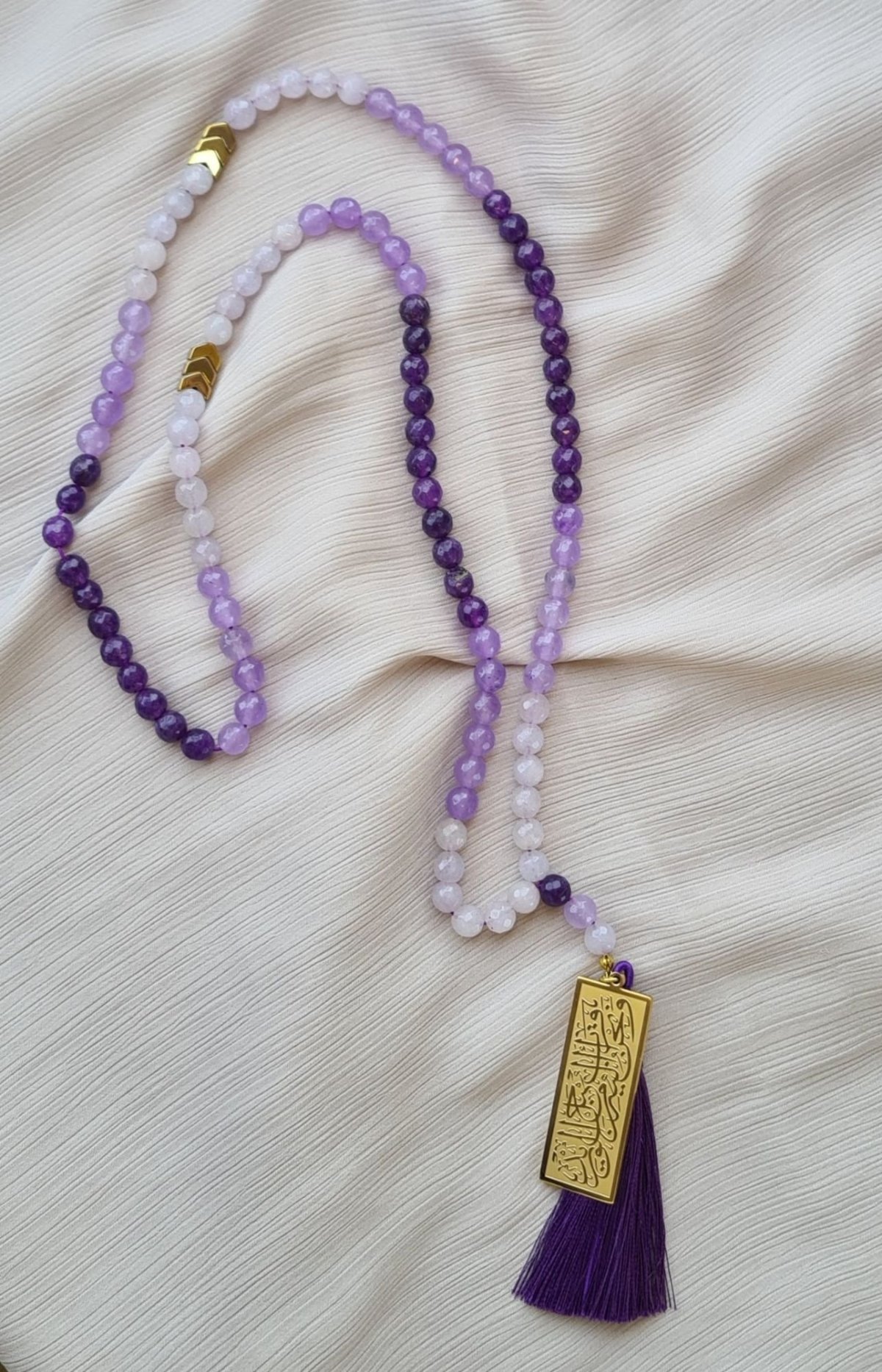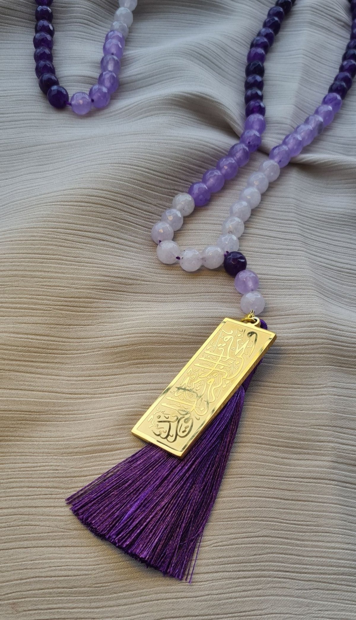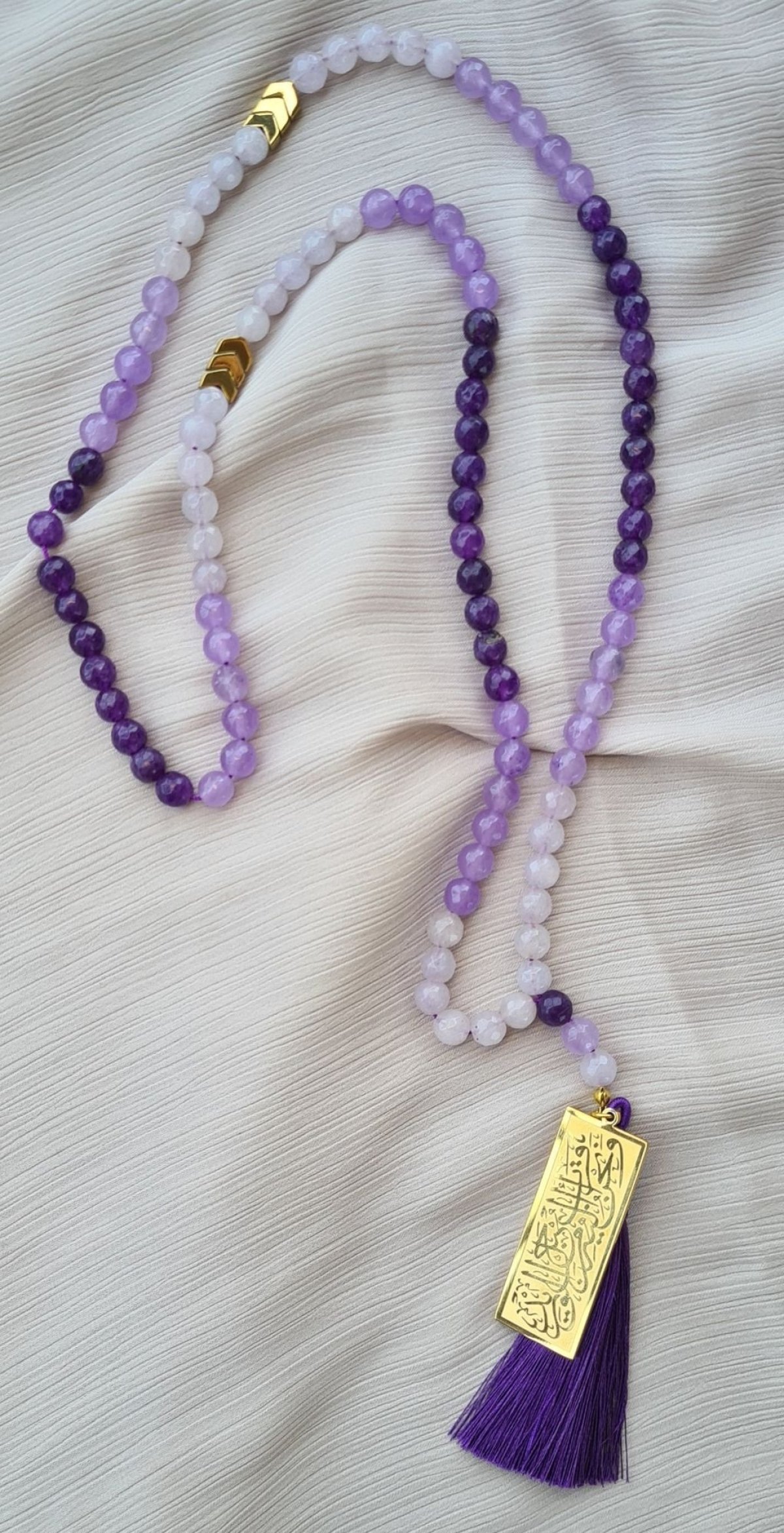 سبحة ٩٩ حبة مصنوعة من العقيق الكبيعي بدرجات اللون الموف و فواصل من الهيماتيت المطلي و دلاية استانليس مطلية ذهب و شرشوبة حرير