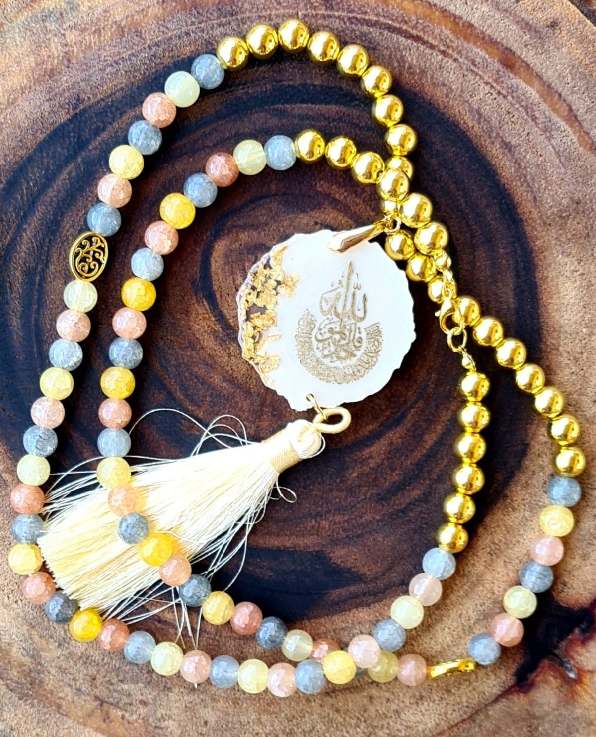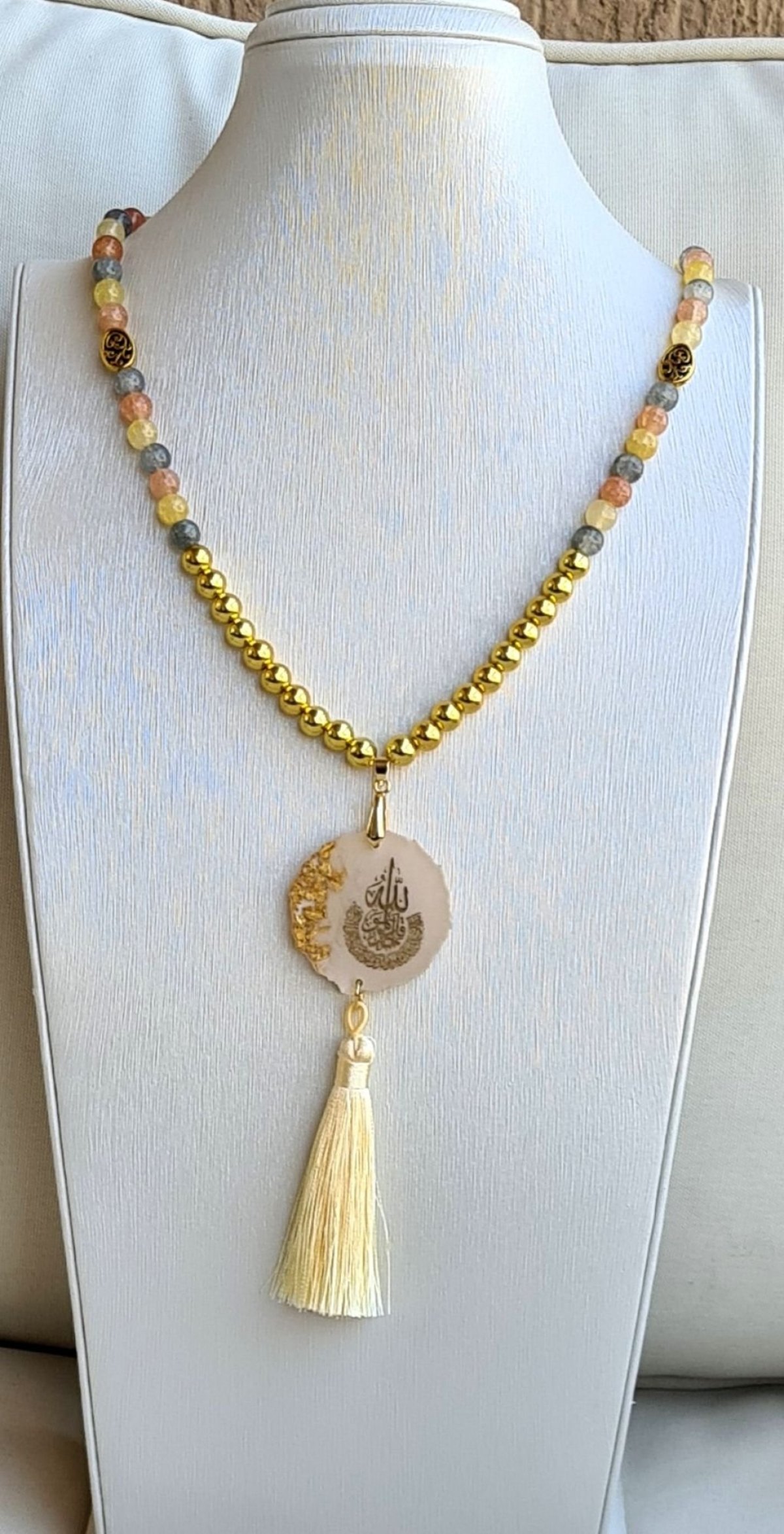 سبحة ١٠٠ حبة مصنوعة من حجر العقيق و الهيماتيت المطلي ذهب و فواصل معدنية و دلاية مصنوعة من الريزن و شرشوبة من الحرير و يمكن استخدامها كعقد