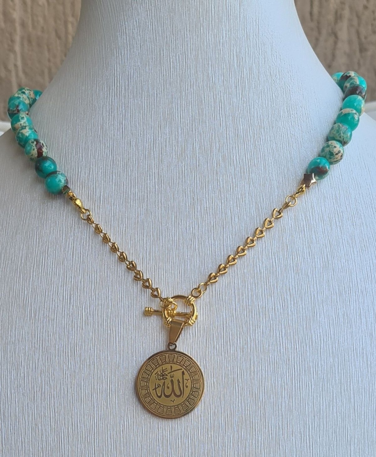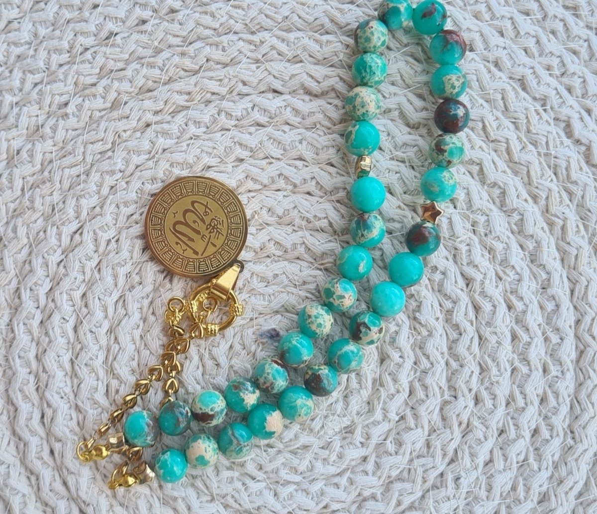 سبحة ٣٣ حبة مصنوعة من حجر امبريال جاسبر مقاس ٨ و فواصل من الهيماتيت الذهبي اللون و سلسلة ذهب صيني و دلاية استانليس مطلية ذهب و قفل من الذهب الصيني و يمكن ان تستخدم كاسورة يد