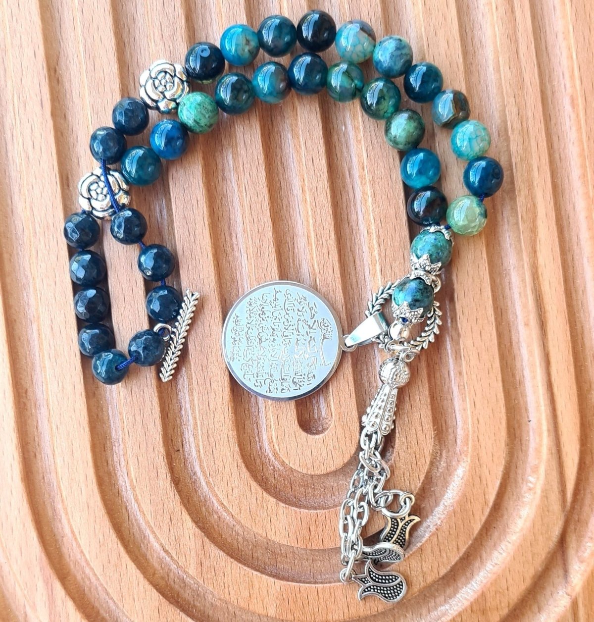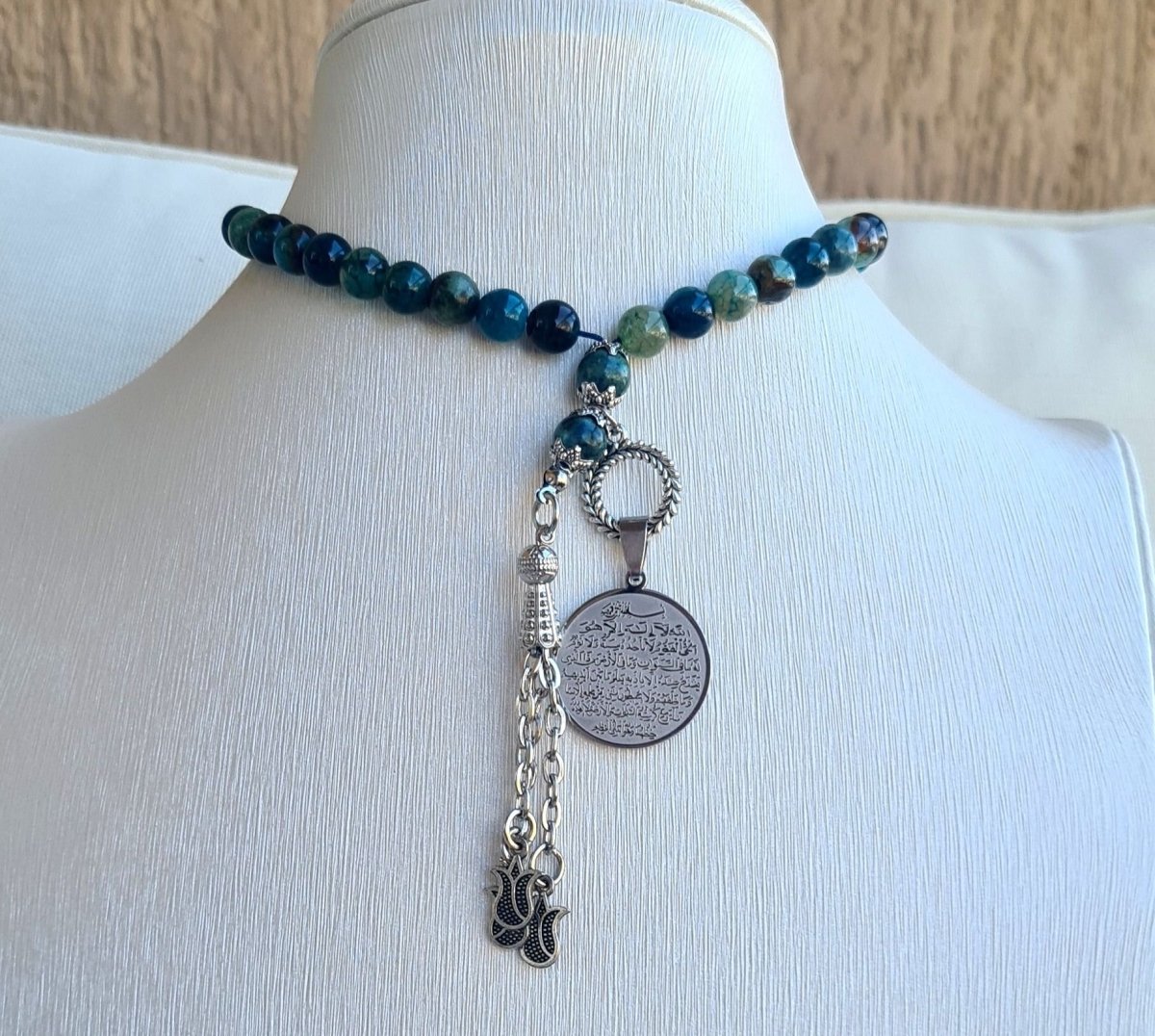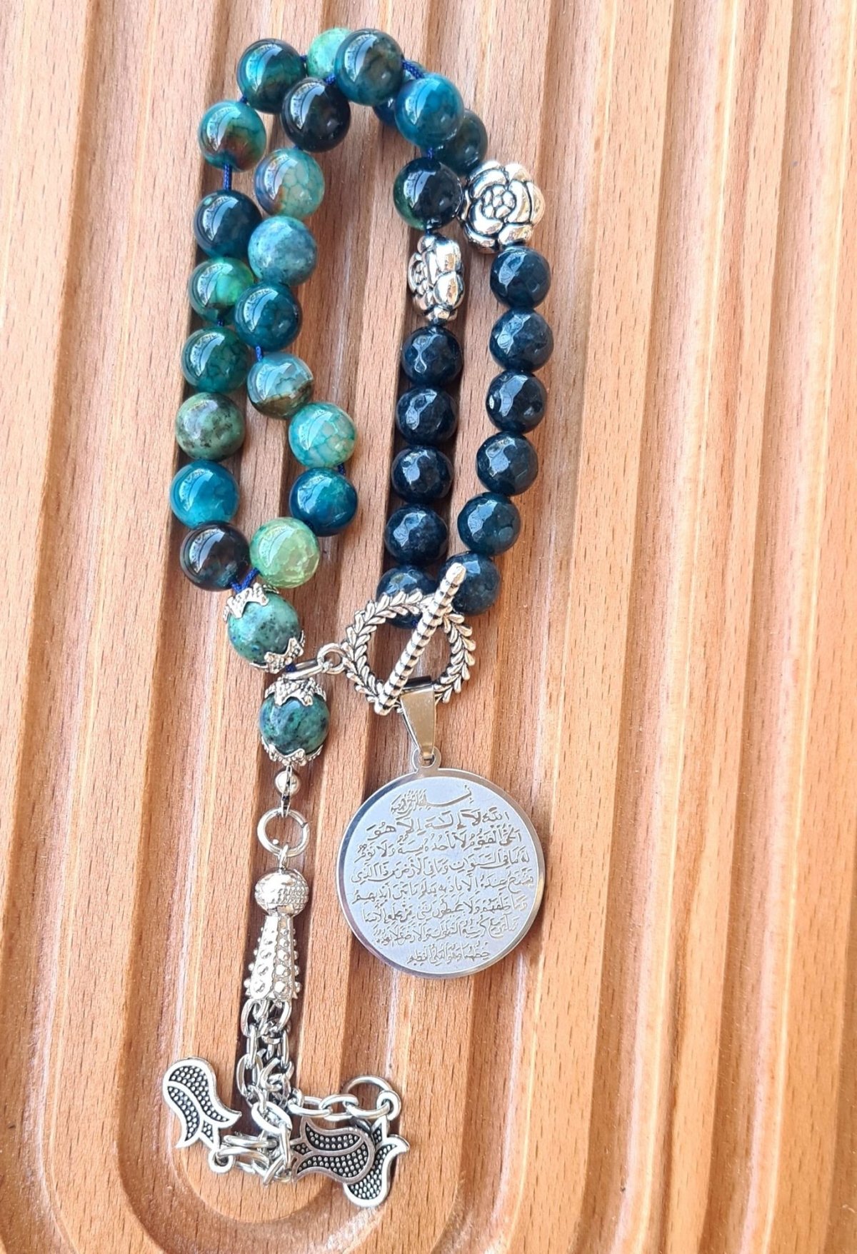 سبحة ٣٣ حبة مصنوعة من حجر عقيق اليمني و فواصل معدنية و دلاية اسانليس مطلي فضة و شرشوبة مطلية فضة يمكن ان تستخدم كاسورة يد