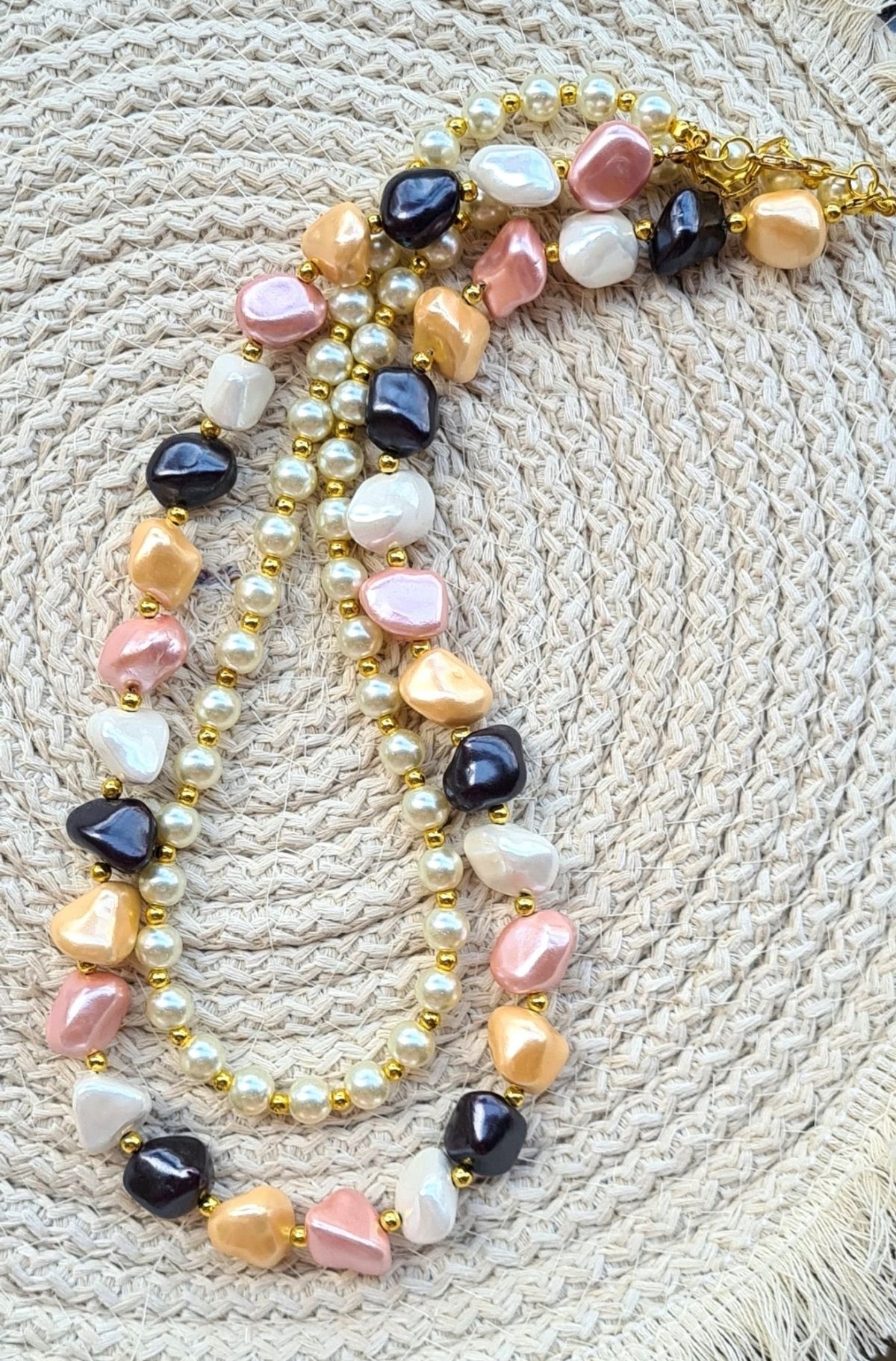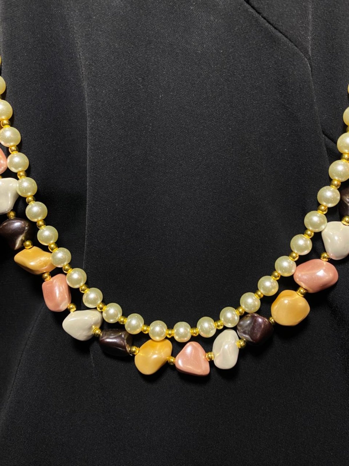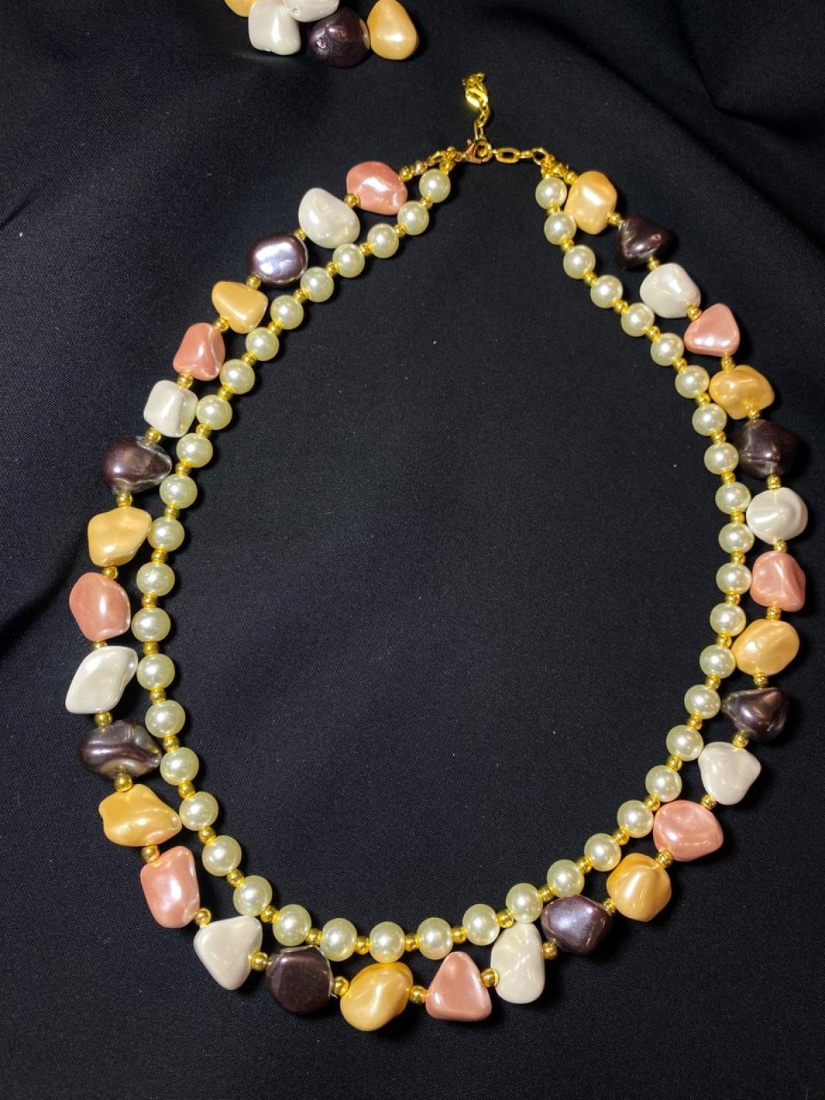 عقد مصنوع من طبقتين الطبقة الاولي من اللولي الملون و الطبقة الثانية من اللولي الاوف وايت و فواصل من الهيماتيت الذهبي