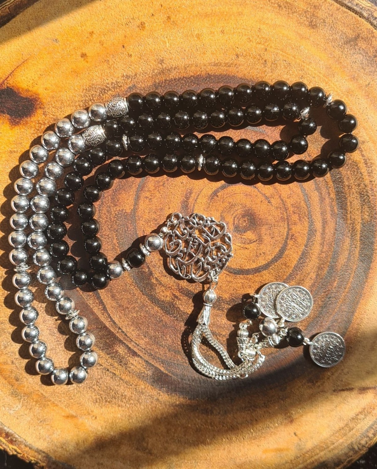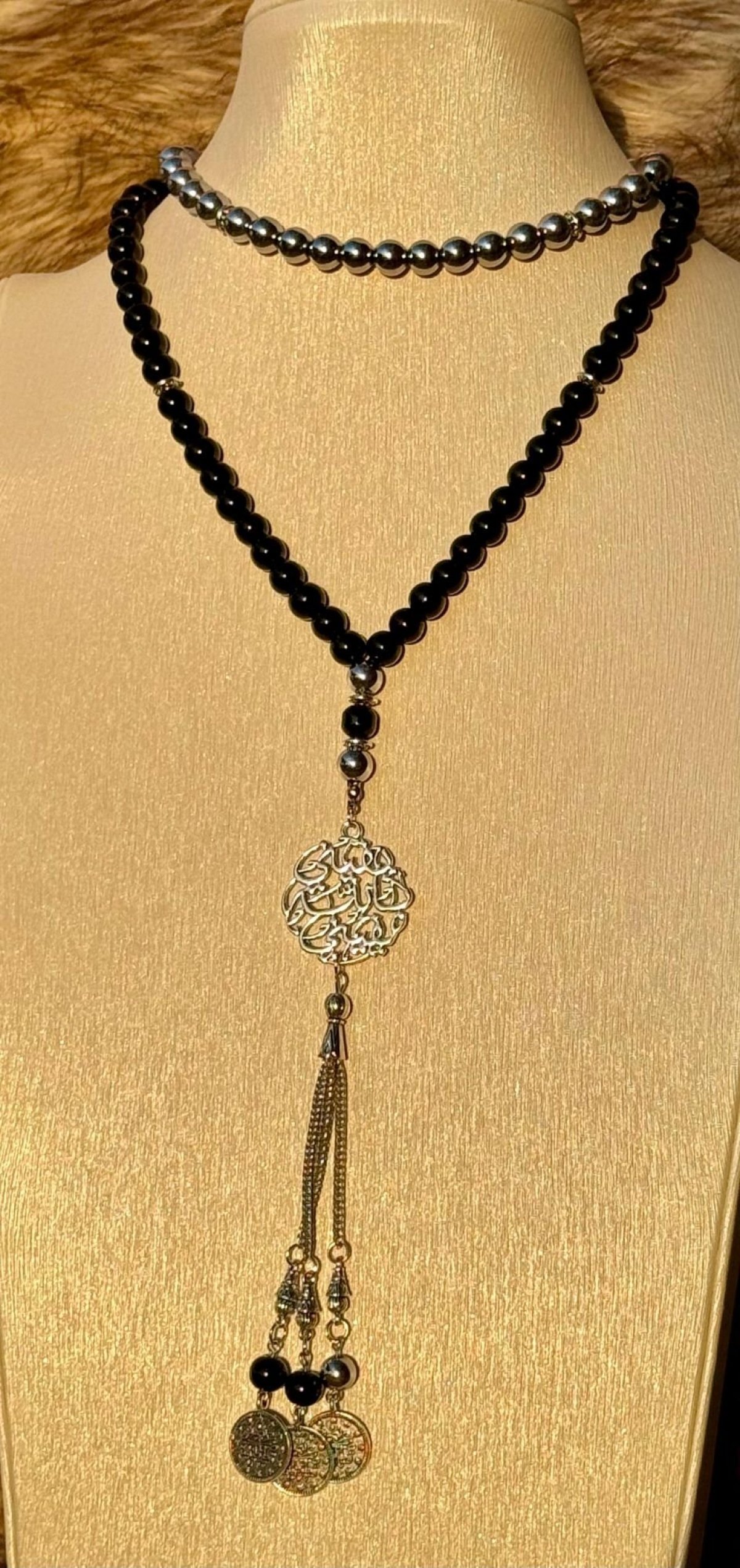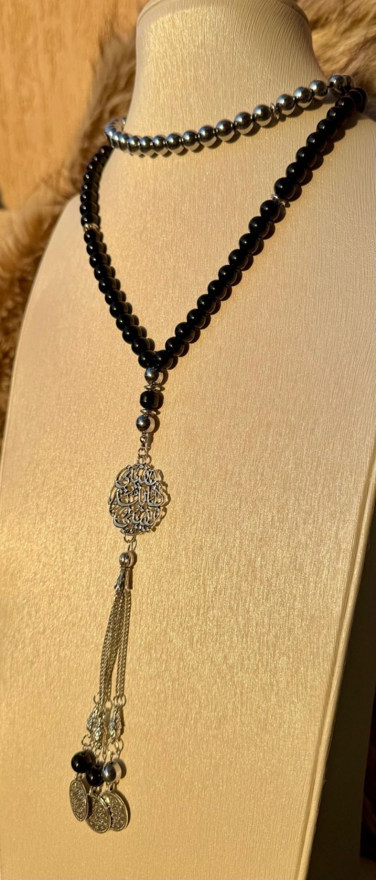 سبحة ٩٩ حبة مصنوعة من الهيماتيت فضي اللون و حجر الاونكس اسود اللون و فواصل معدنية و دلاية و شرشوبه معدنية