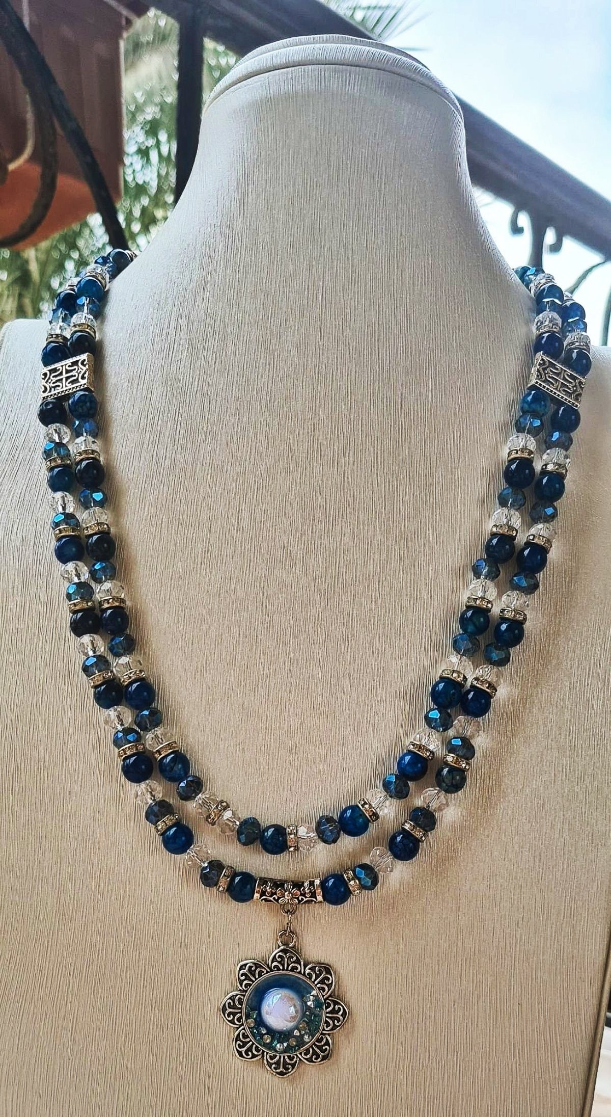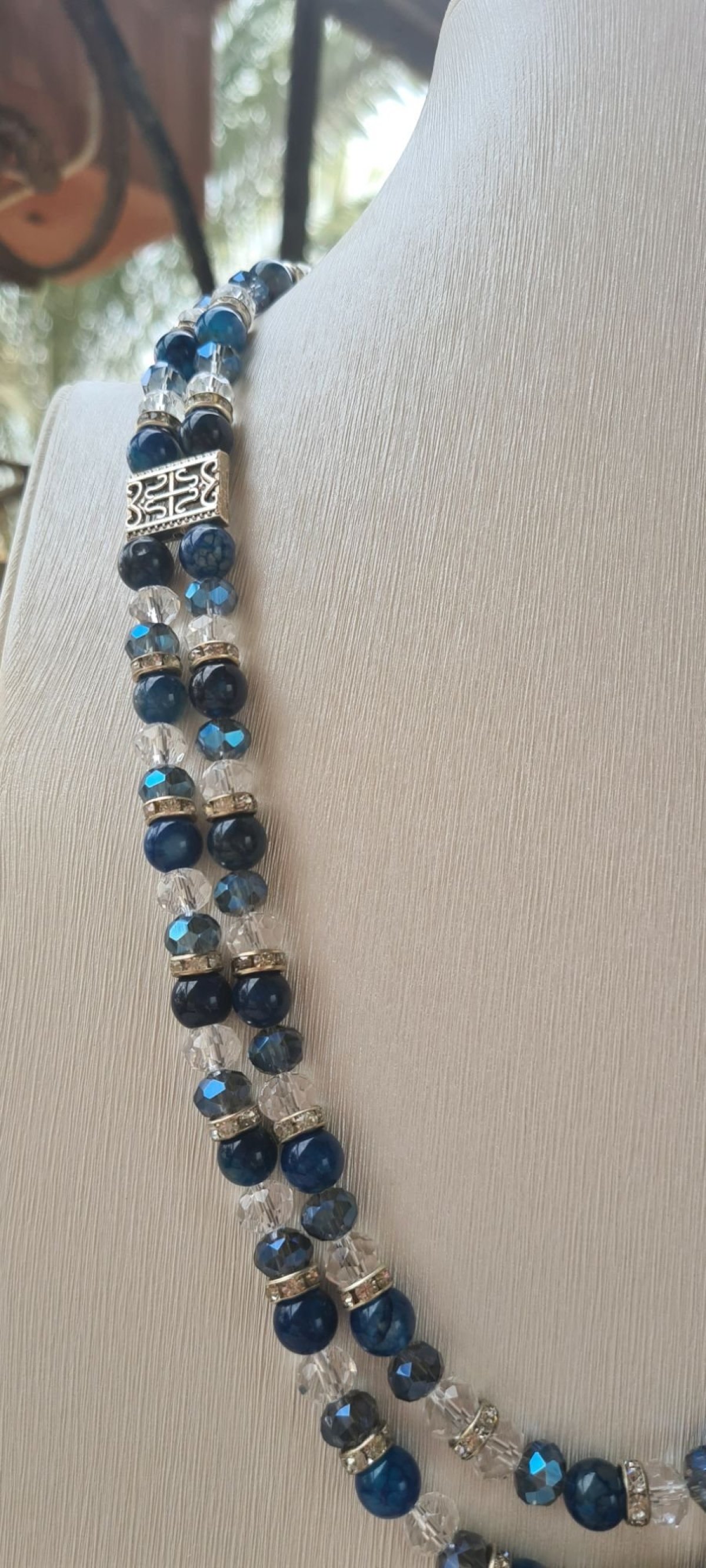 عقد مكون من طبقتين من العقيق و الكريستال و فواصل معدنية و دلاية معدنية