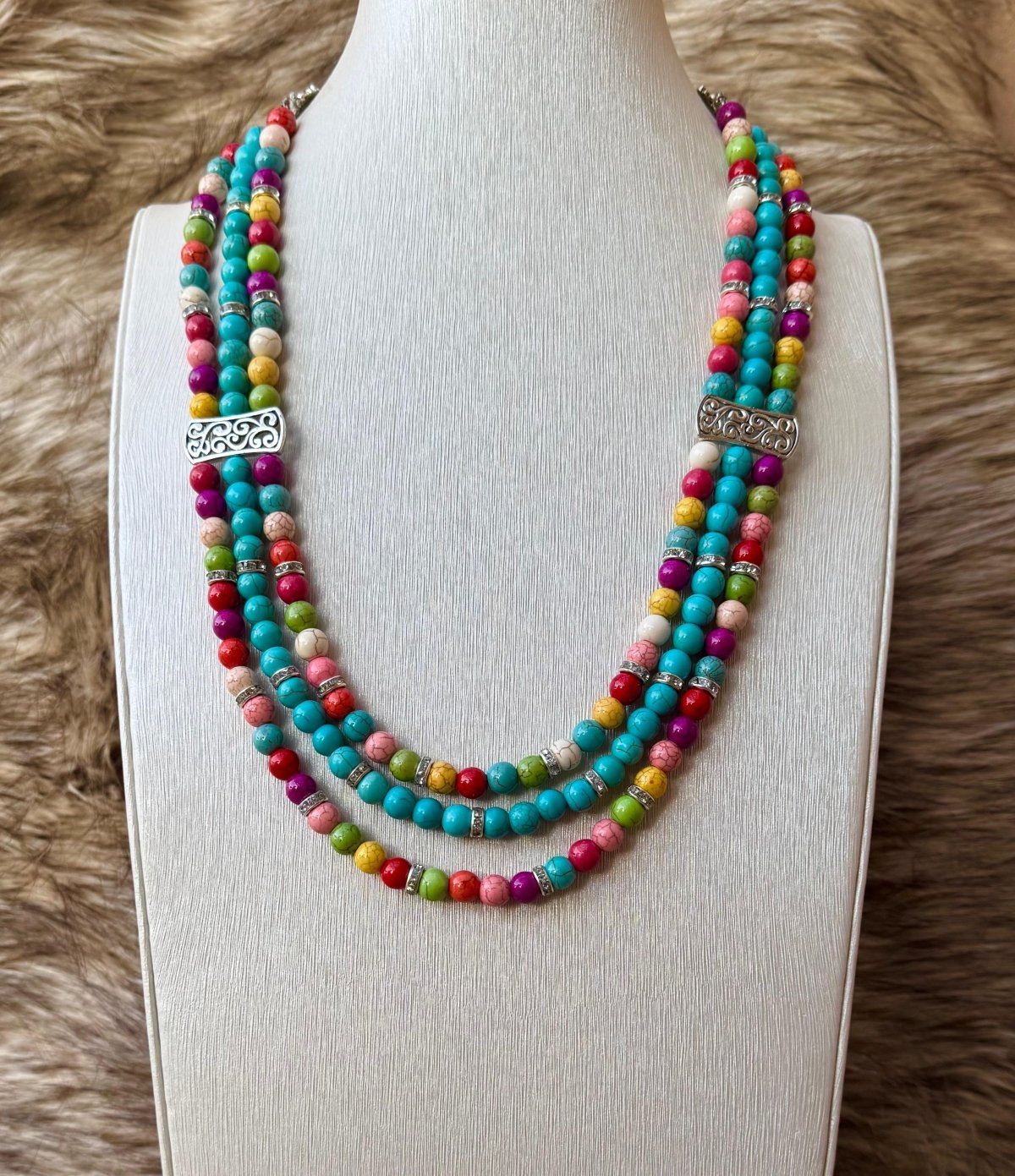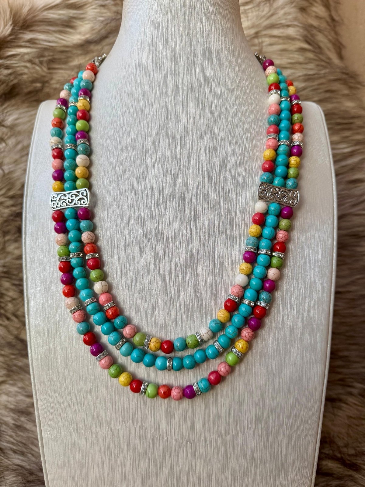 عقد ثلاث ادوار مصنوع من الفيروز بالوان متعددة و فواصل معدنية