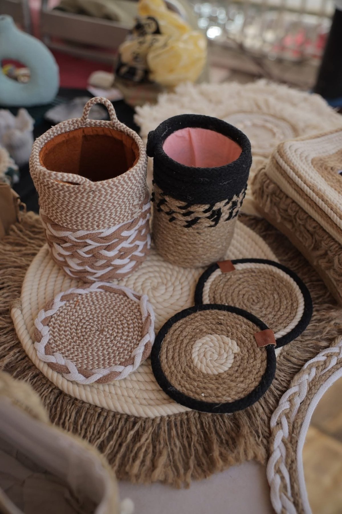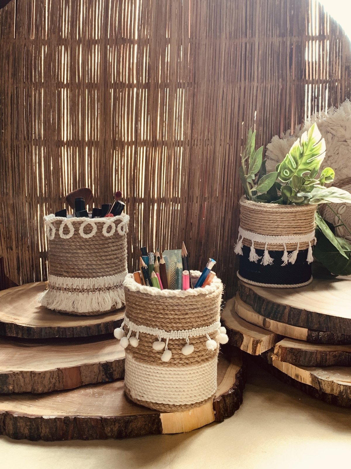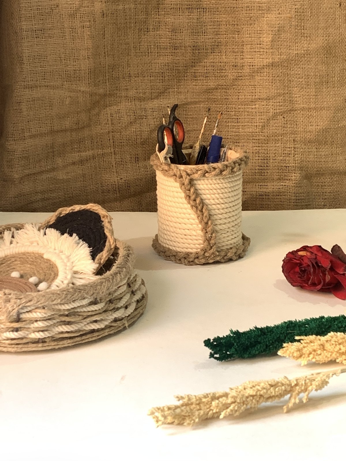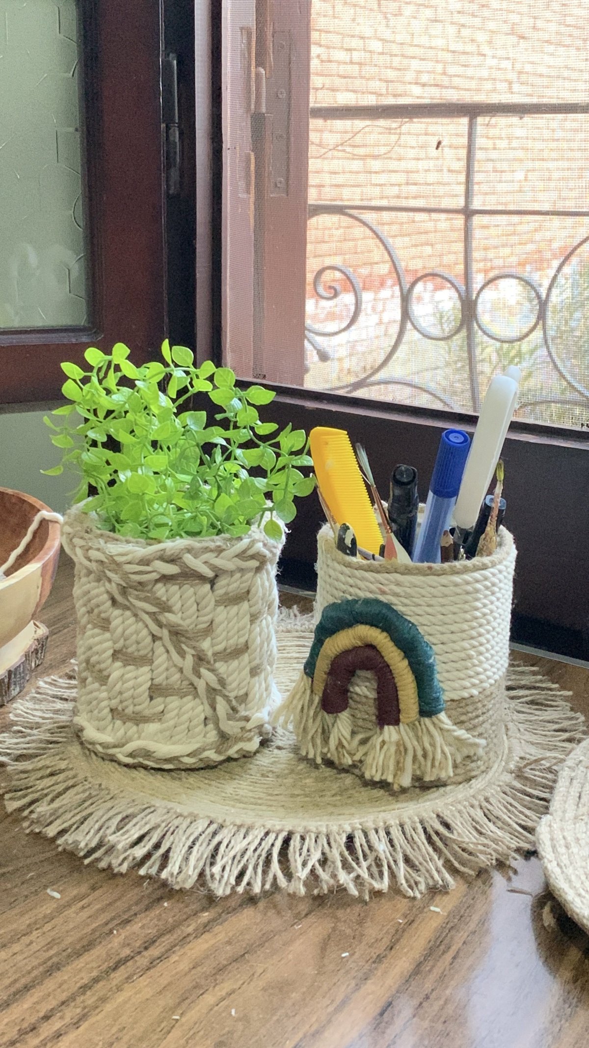 منظم من الخيش والمكرمية ميكب او اقلام او زرع او فرش اسنان ارتفاع ١٣سم وقطره ١٠سم