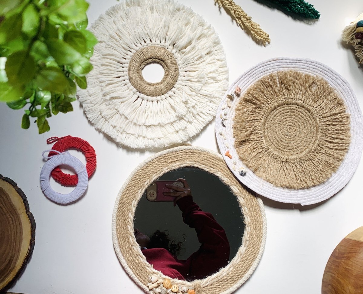 مجموعة من مرايا ٣٥ سم و٢ كوستر ٣٠سم من خيوط الخيش والمكرمية مع لمسك من صدف البحر
