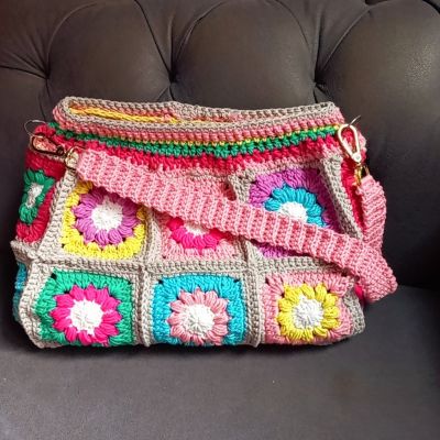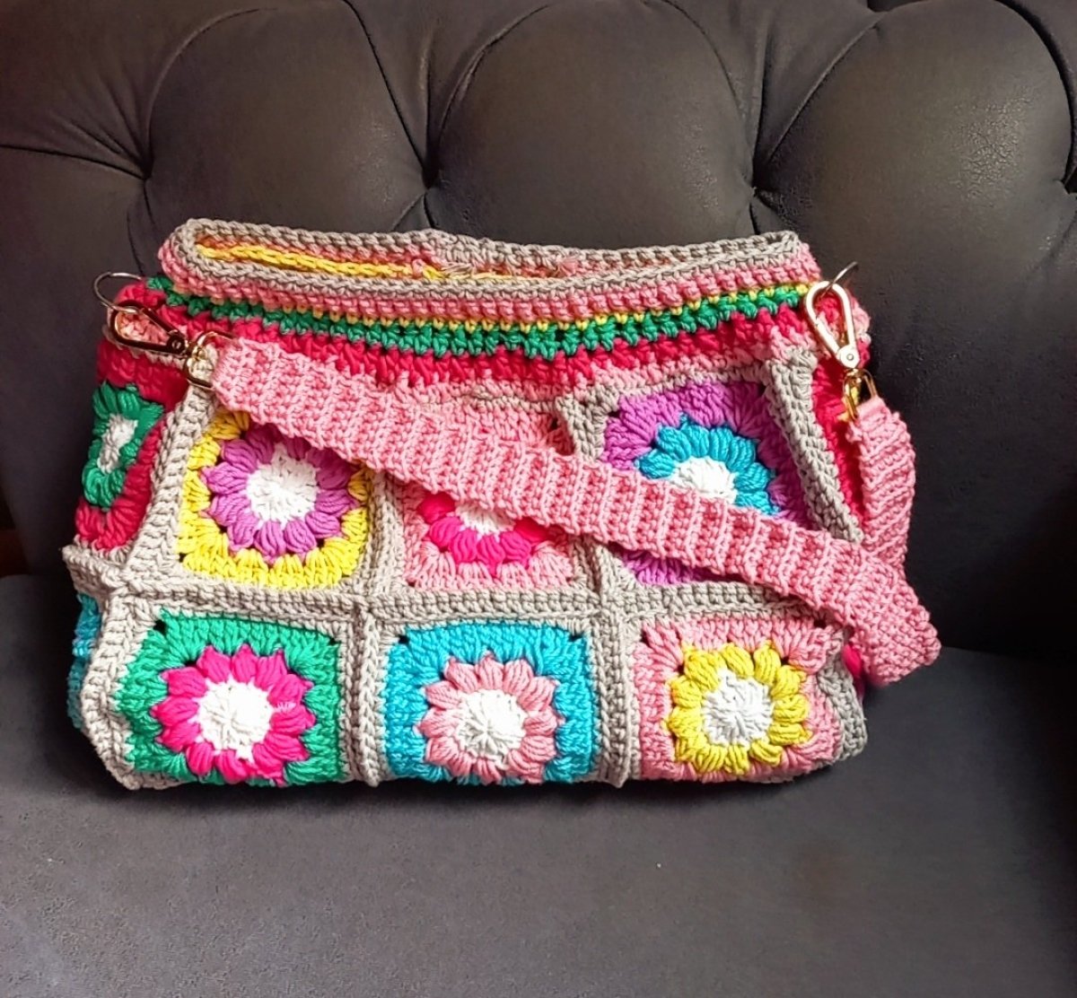 شنطة كروشيه وحدات ملونه مقاس ٢٥ × ٣٥ مصنوعه من خيط ضد الوبر ١٠٠% صناعة يدوية