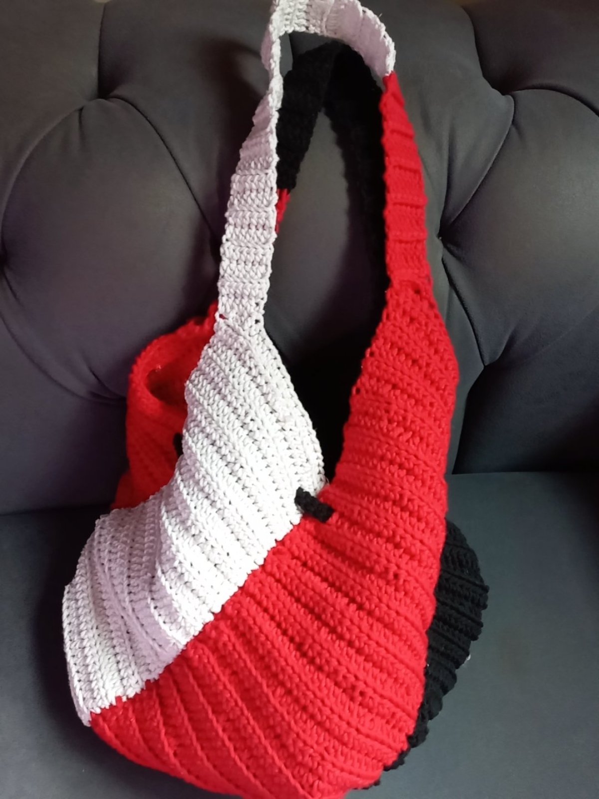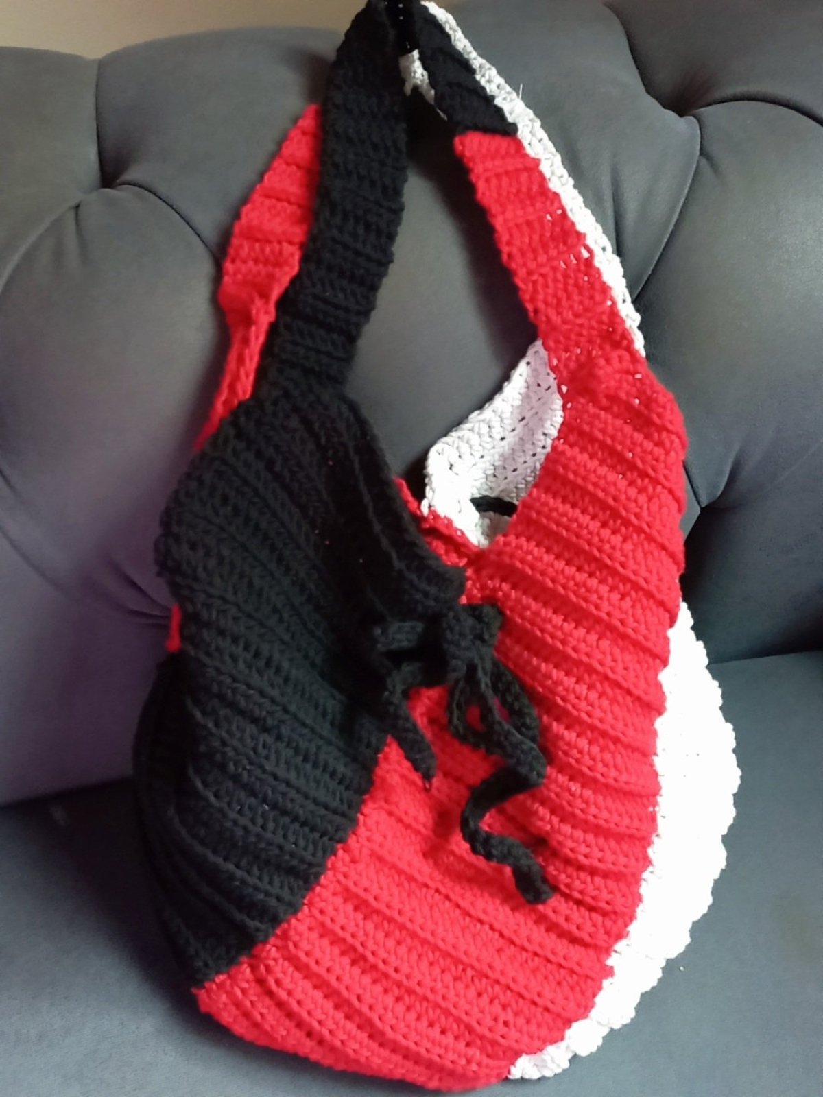 شنطة كروشية اسود × احمر × ابيض مقاس ٣٠ × ٣٥ مصنوعة من خيط ضد الوبر