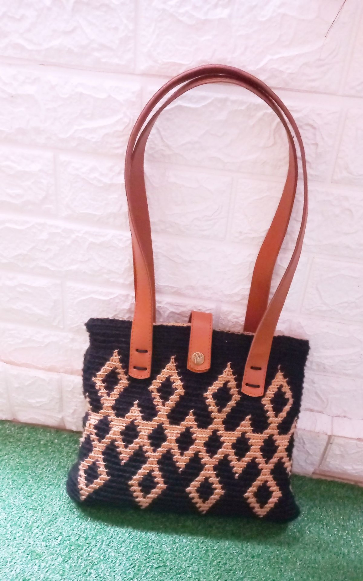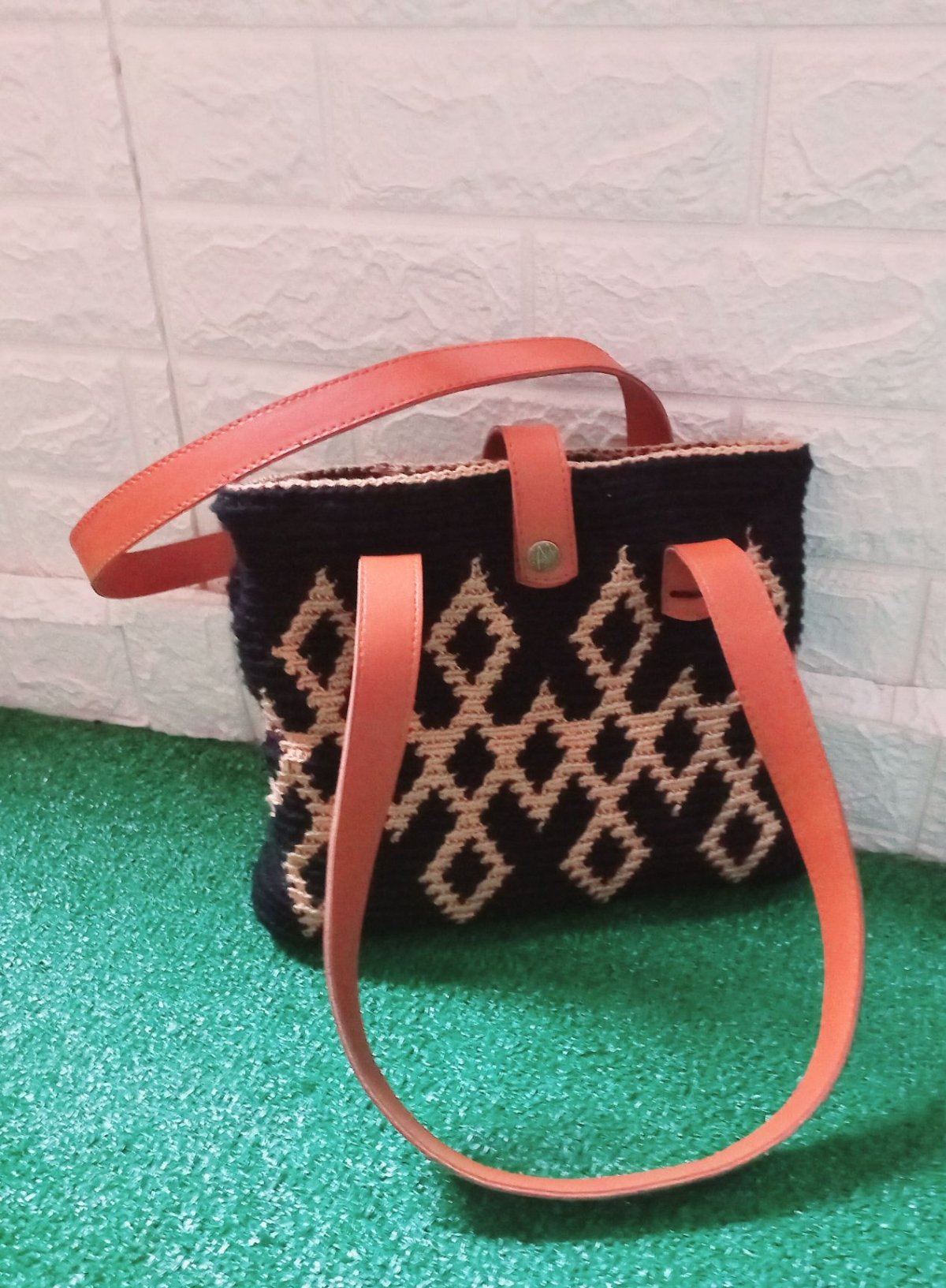 شنطة عصرية مصنوعة بفن التابستري مقاسها ٣٠ × ٢٥ سم ايد جلد بني خيط ضد الوبر بطانة داخلية وسوسته جذابة جدا وراقية
