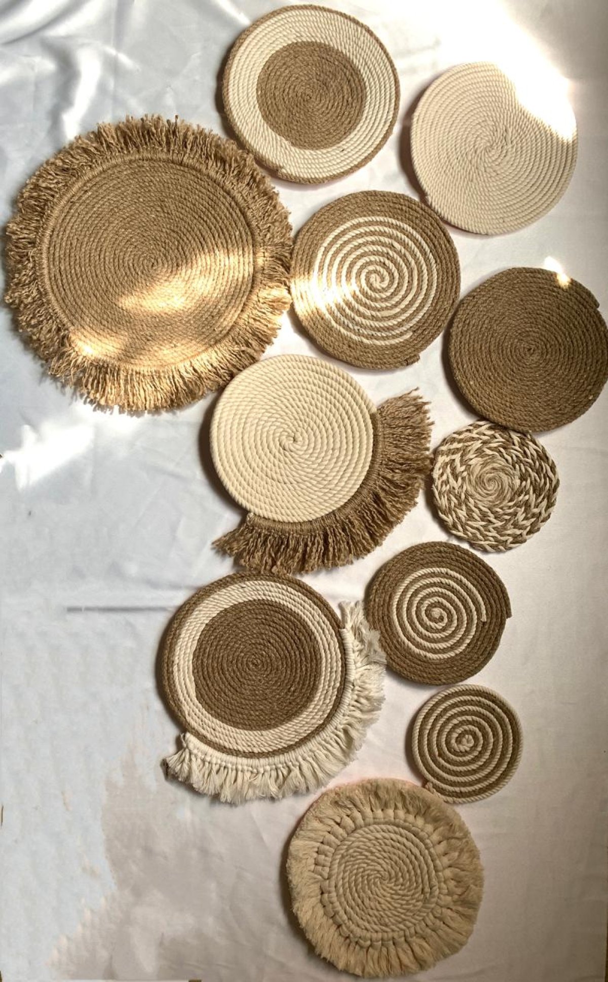 مجموعة من ١١ كوستر من الخيش ومكرمية يتراوح الحجم بين ١٢-٣٨ سم