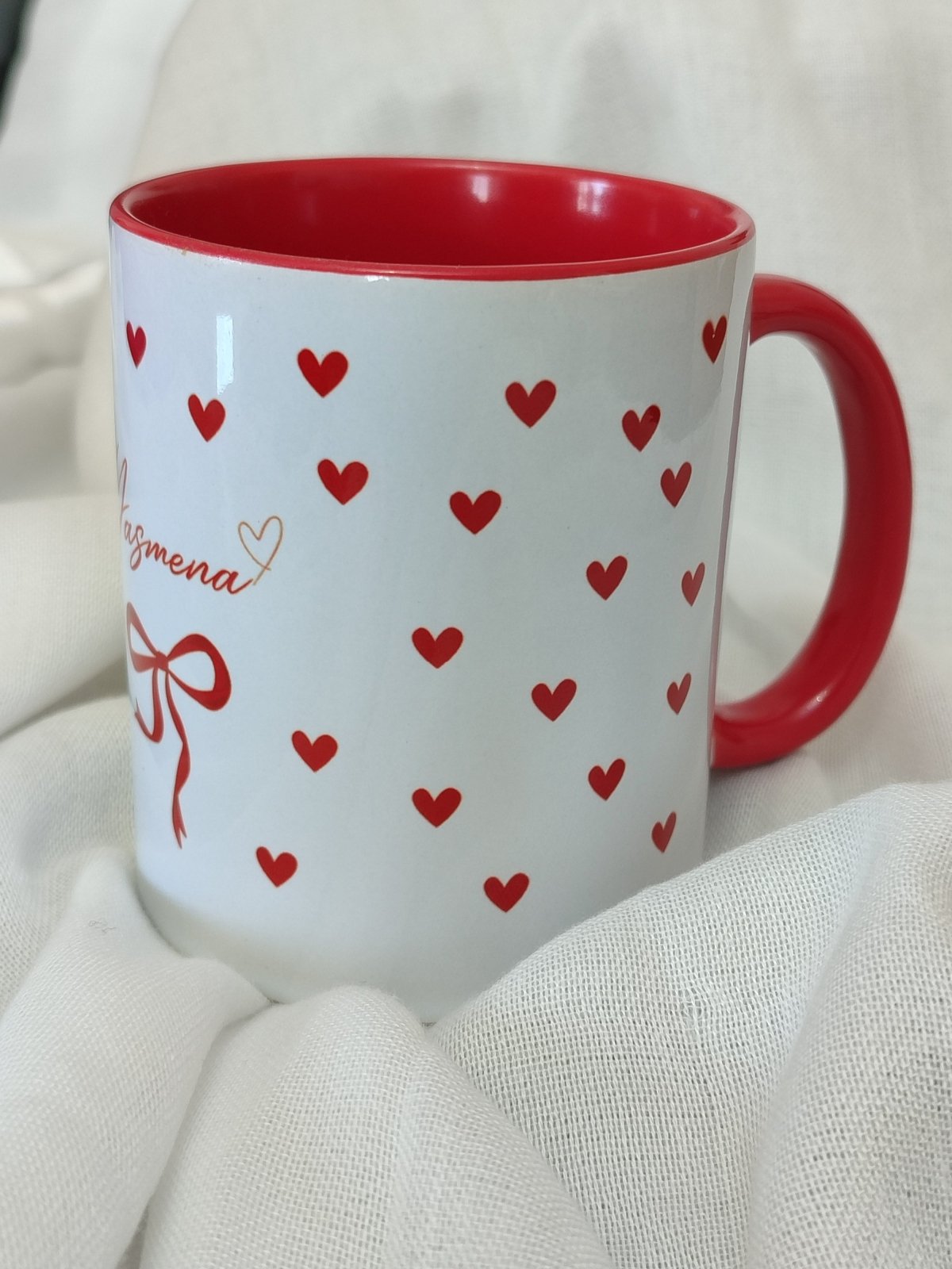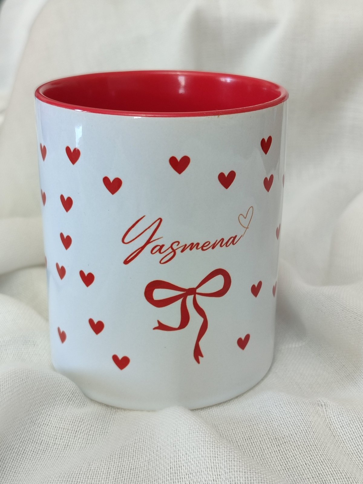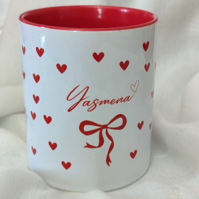 أضيفي لمسة من الحب والتميز إلى لحظاتك اليومية مع هذا الكوب الرائع المصنوع من السيراميك عالي الجودة. يتميز بتصميم أنيق يحمل اسم "Yasmena" مكتوب بخط أنثوي ناعم، مزين بقلوب حمراء صغيرة وربطة فيونكة تضيف لمسة رقيقة ودافئة. الخامة: سيراميك عالي الجودة الأبعاد: سعة تقريبية 330 مل اللون الداخلي: أحمر لامع اللون الخارجي: أبيض مزين بقلوب حمراء الاستخدام: مثالي للقهوة، الشاي، أو المشروبات الساخنة والباردة مناسب كهدية مميزة أو استخدام شخصي اختاريه كهدية مميزة لصديقتك، أو دللي نفسك بكوب يحمل طابعًا خاصًا!
