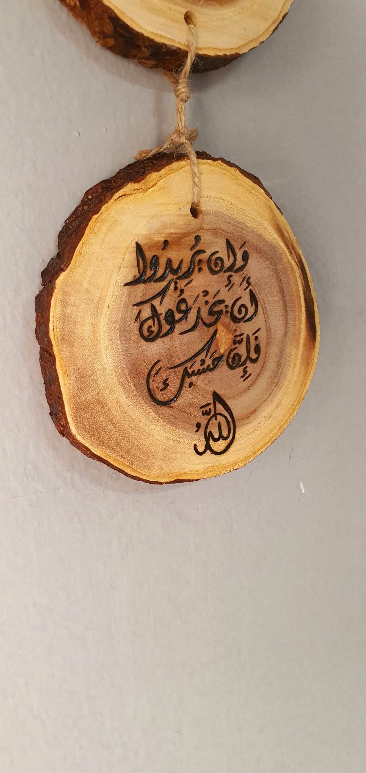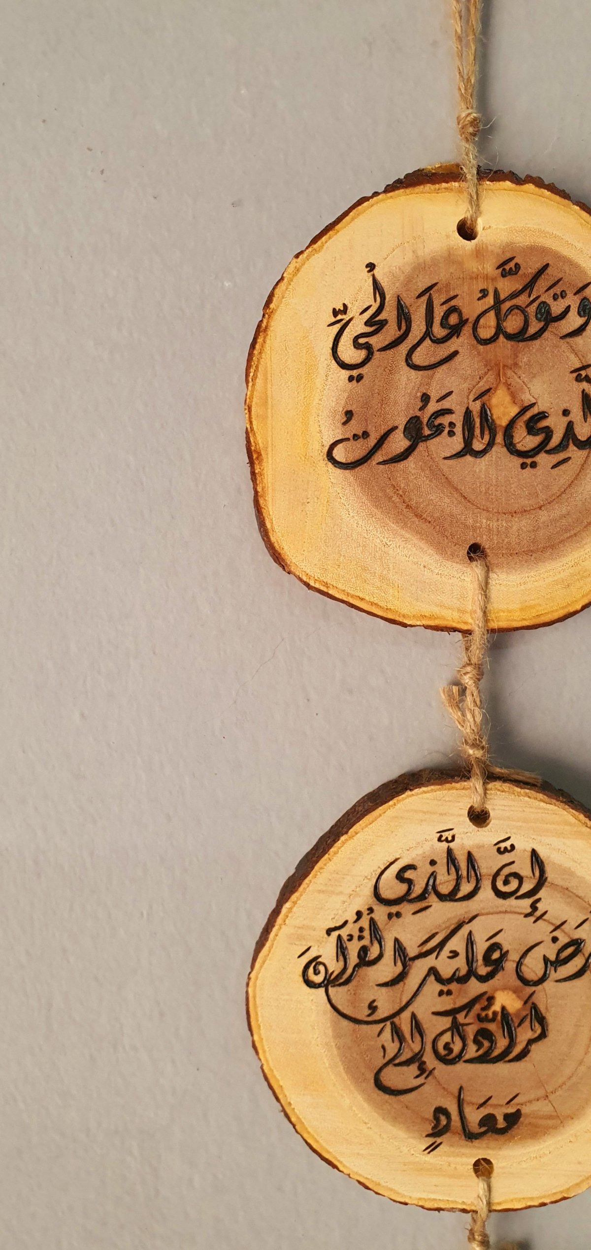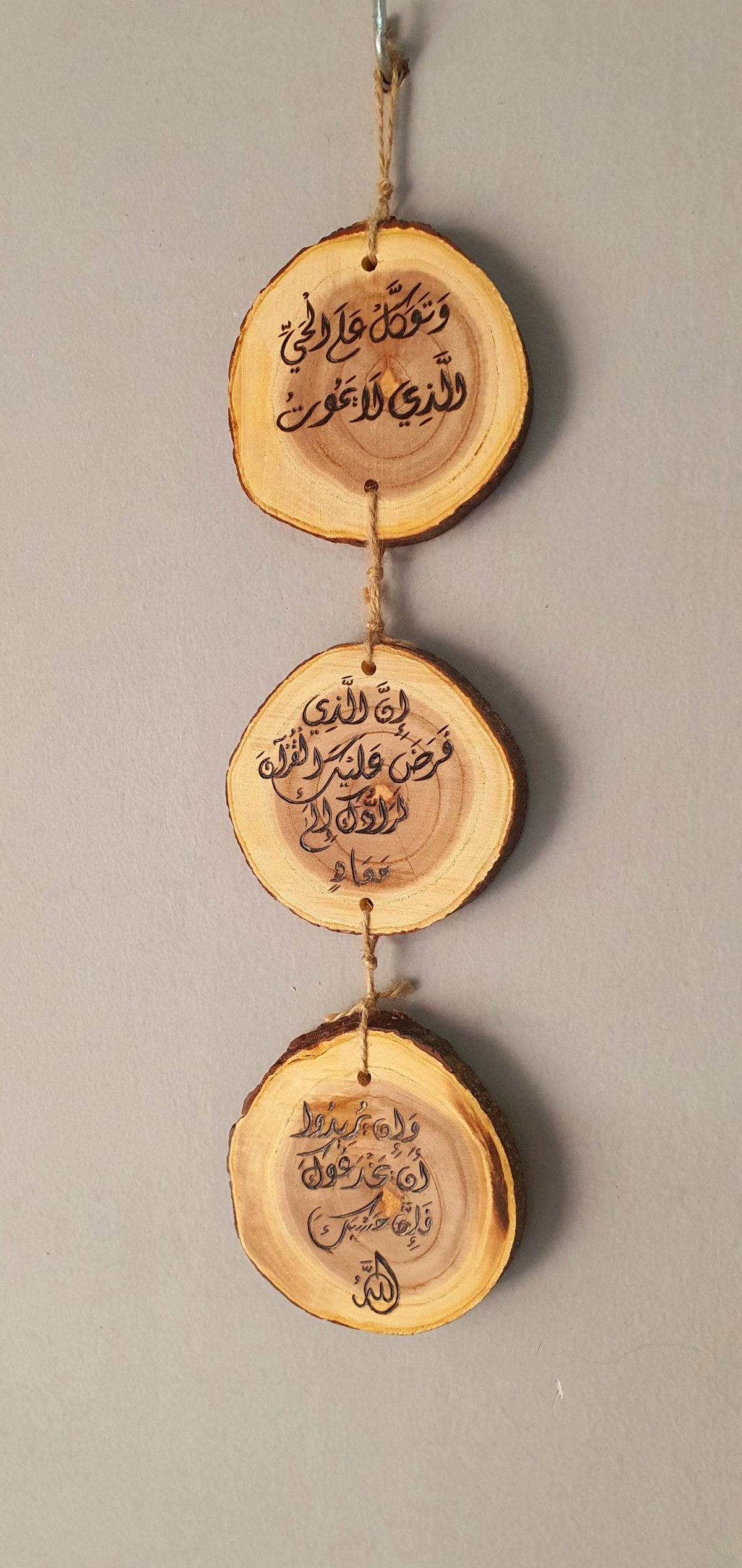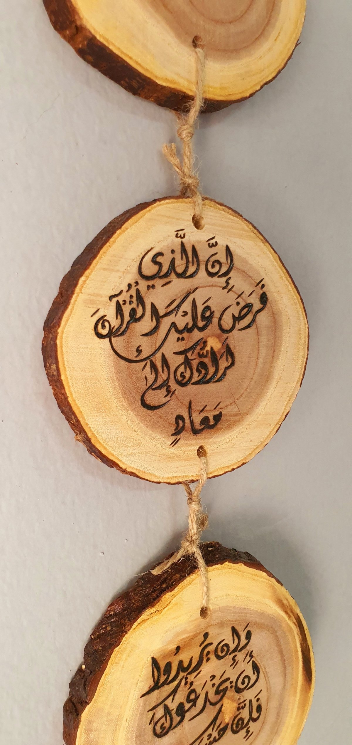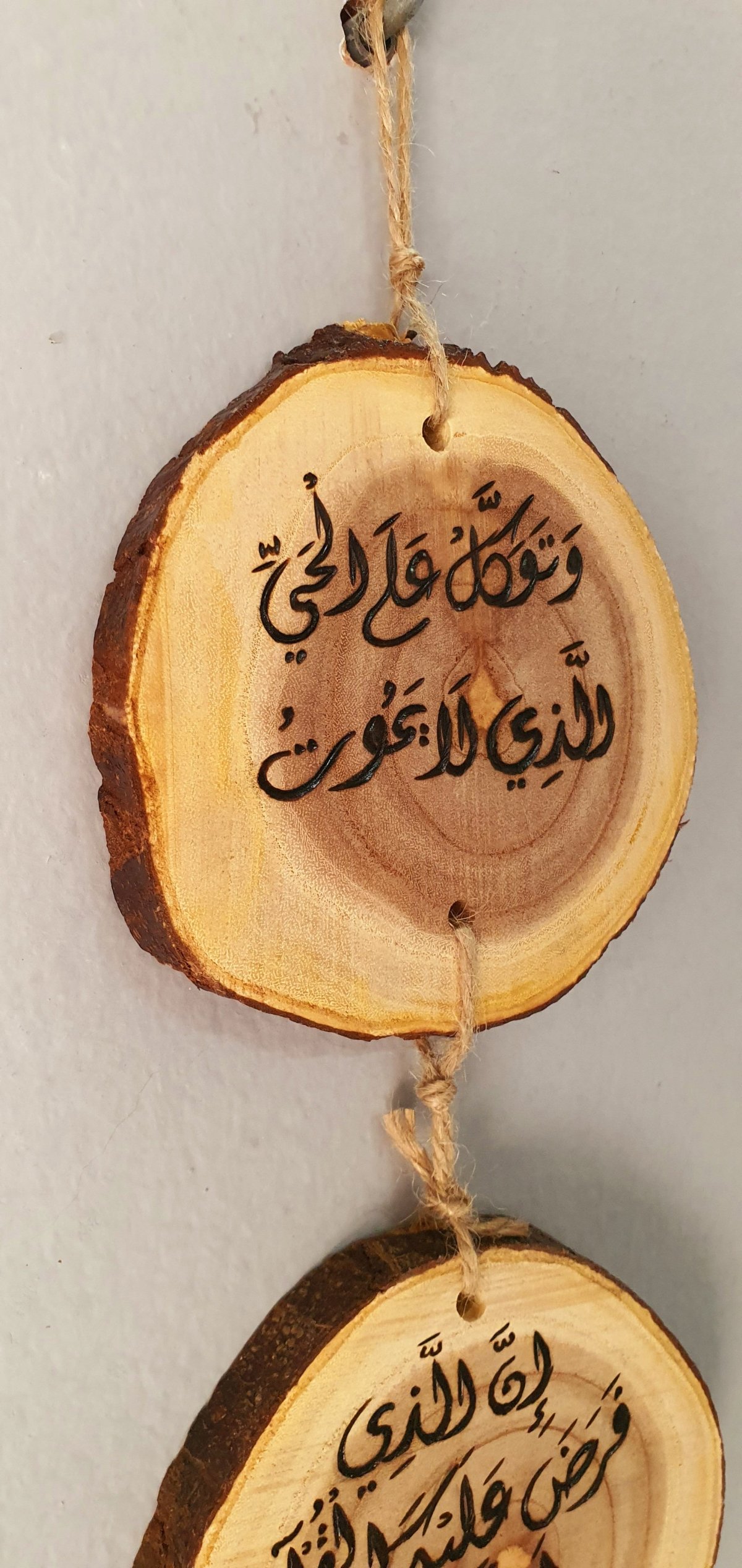 {وتوكل على الحي الذي لا يموت} {إن الذي فرض عليك القرآن لرادك إلى ميعاد} {وإن يريدوا أن يخدعوك فإن حسبك الله} عليقة من الخشب الطبيعي تحمل آياتٍ قرآنية منقوشة بالحرق اليدوي، مكونة من ثلاث قطع متصلة. الطول الكلي: ٣٥-٤٠ سم