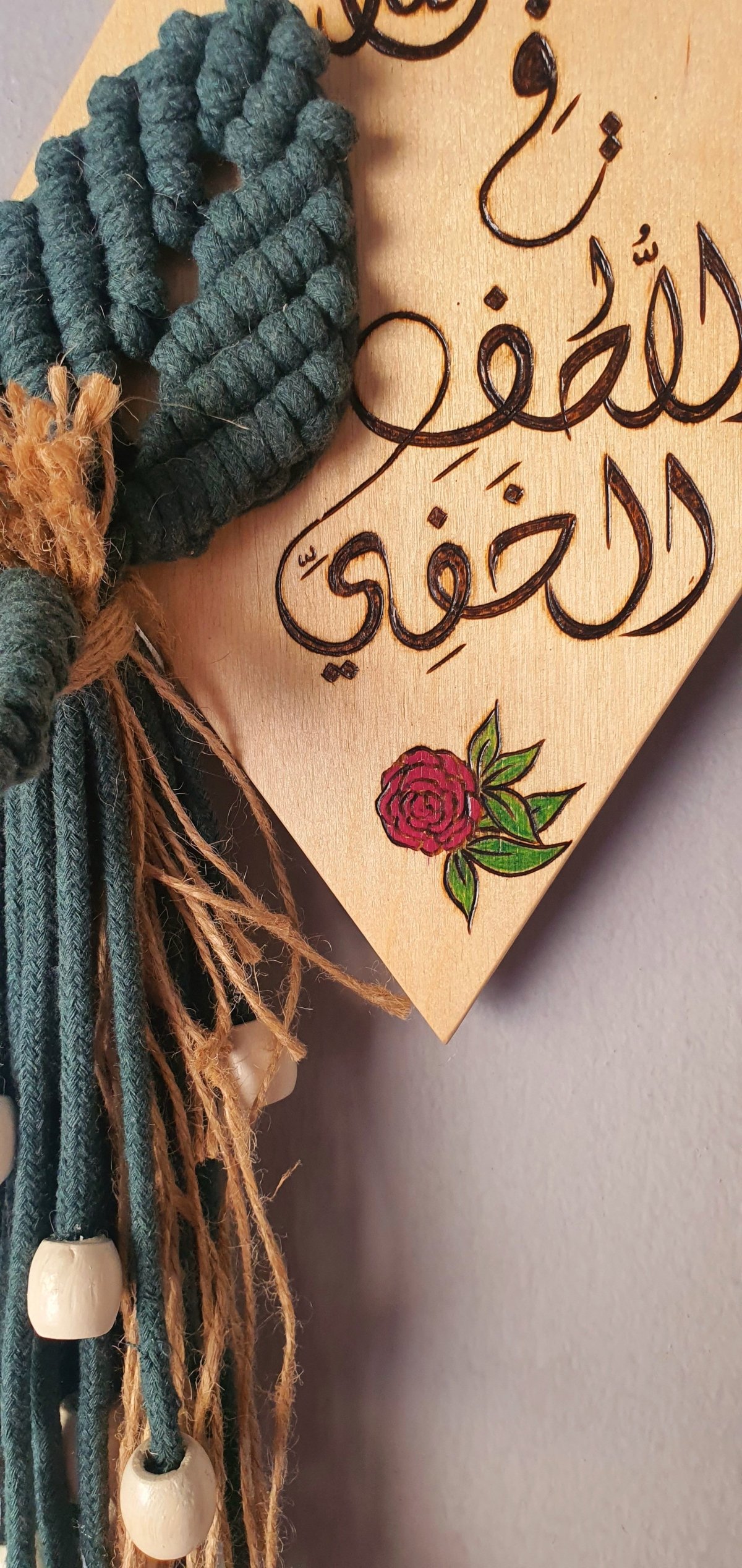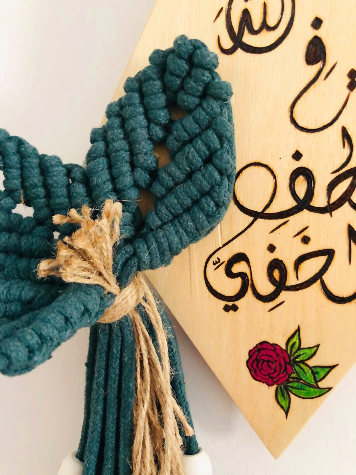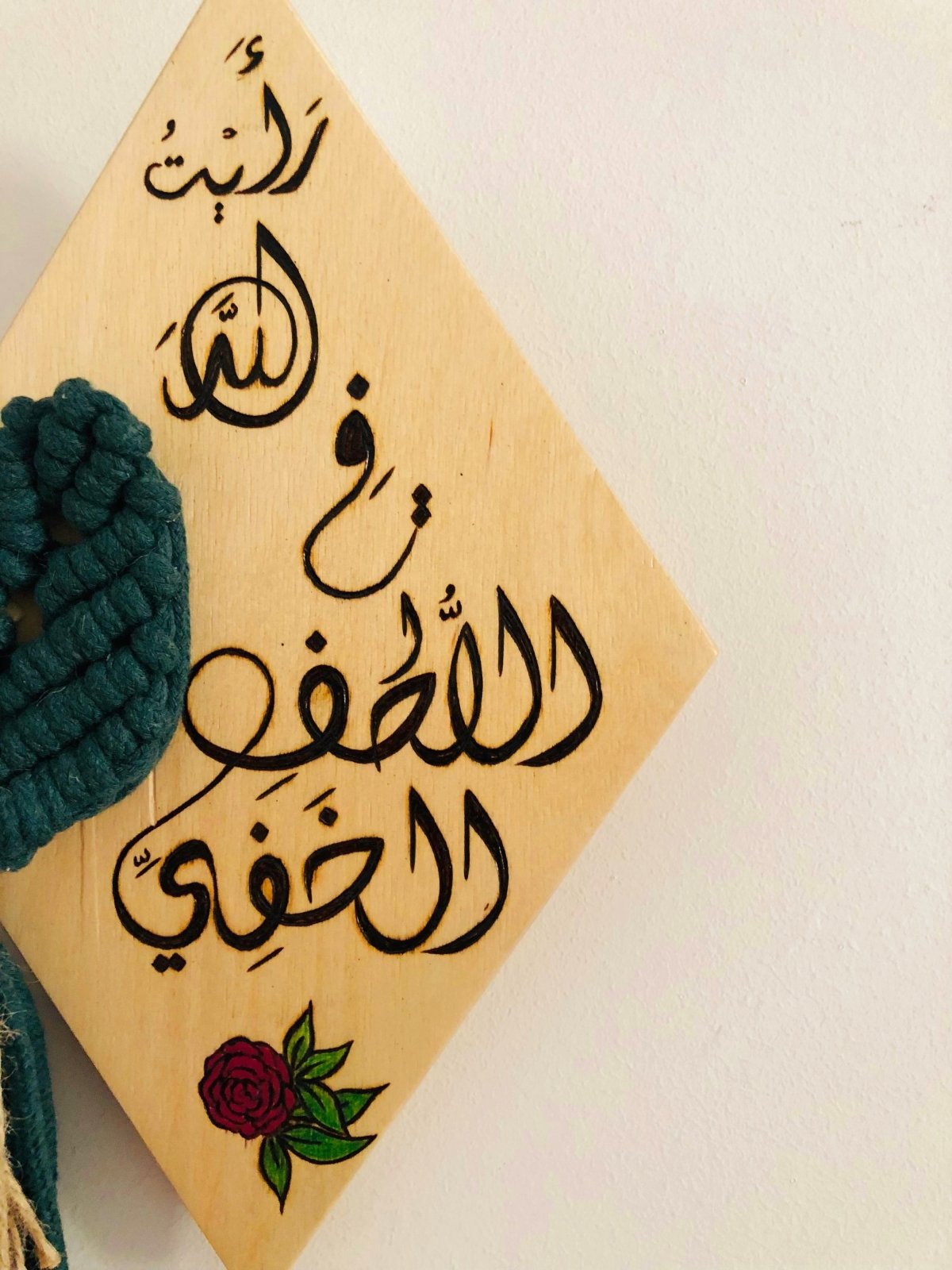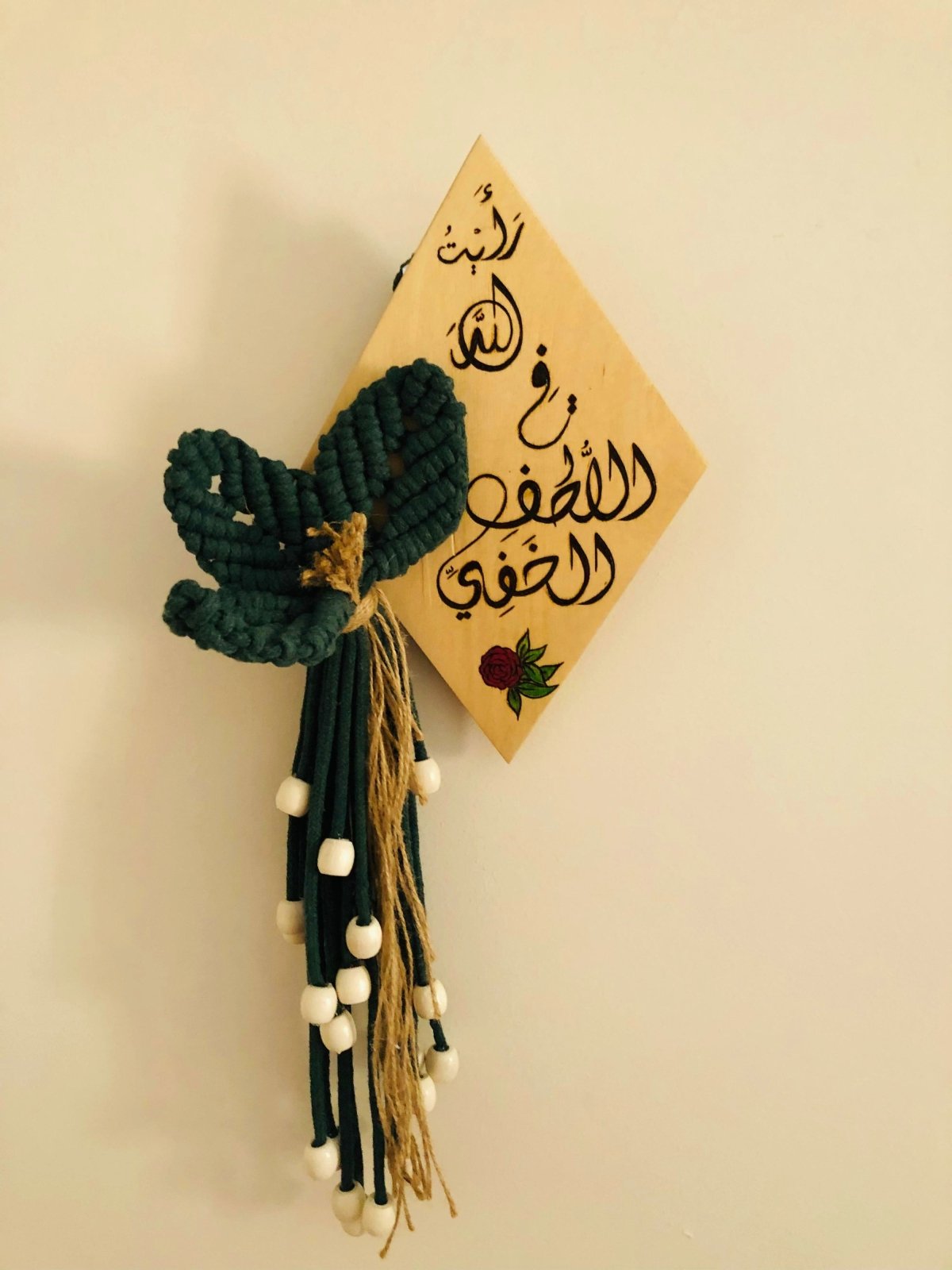 رأيت الله في اللطف الخفي قطعة فريدة من الخشب المجدول بخيوط المكرمية وبتصميم نفذناه بالحرق اليدوي. علّقها على الحائط لإضفاء لمسة دافئة على مساحتك. الأبعاد الكلية: ٢٦ سم عرض × ٥٥ سم طول