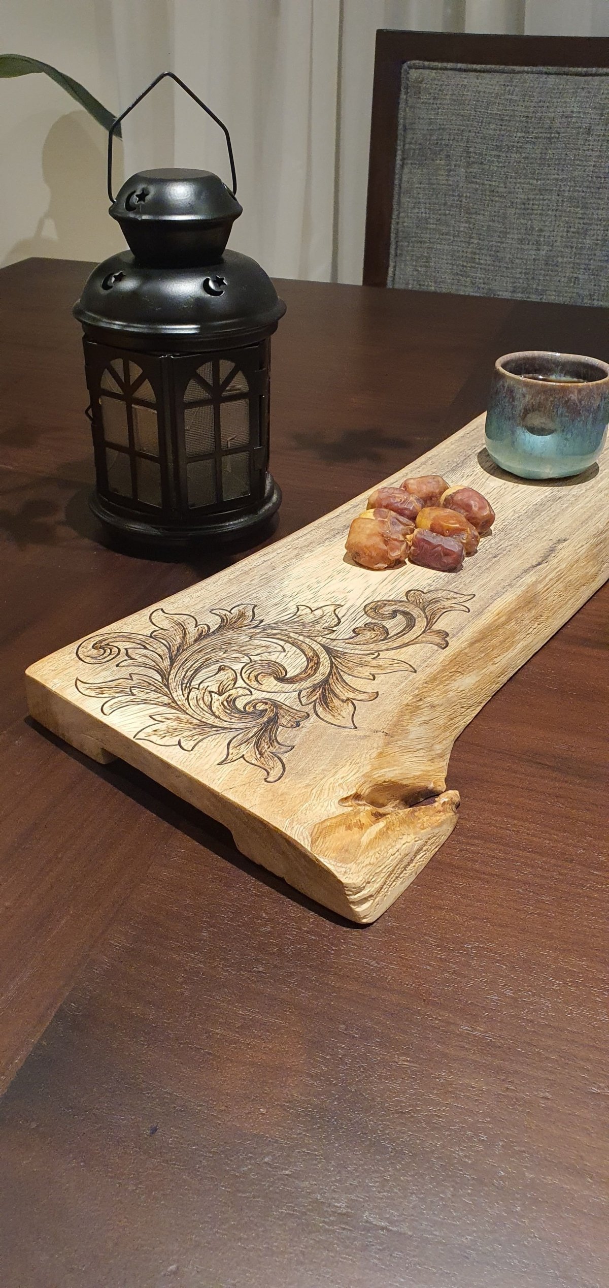 صينية من جذع شجر طبيعي بحماية عالية، بتصميم فريد نفذناه بفن الحرق اليدوي على الخشب، بيدين مخفيتين من الجانبين الأبعاد: ٤٦ × ١٨ سم