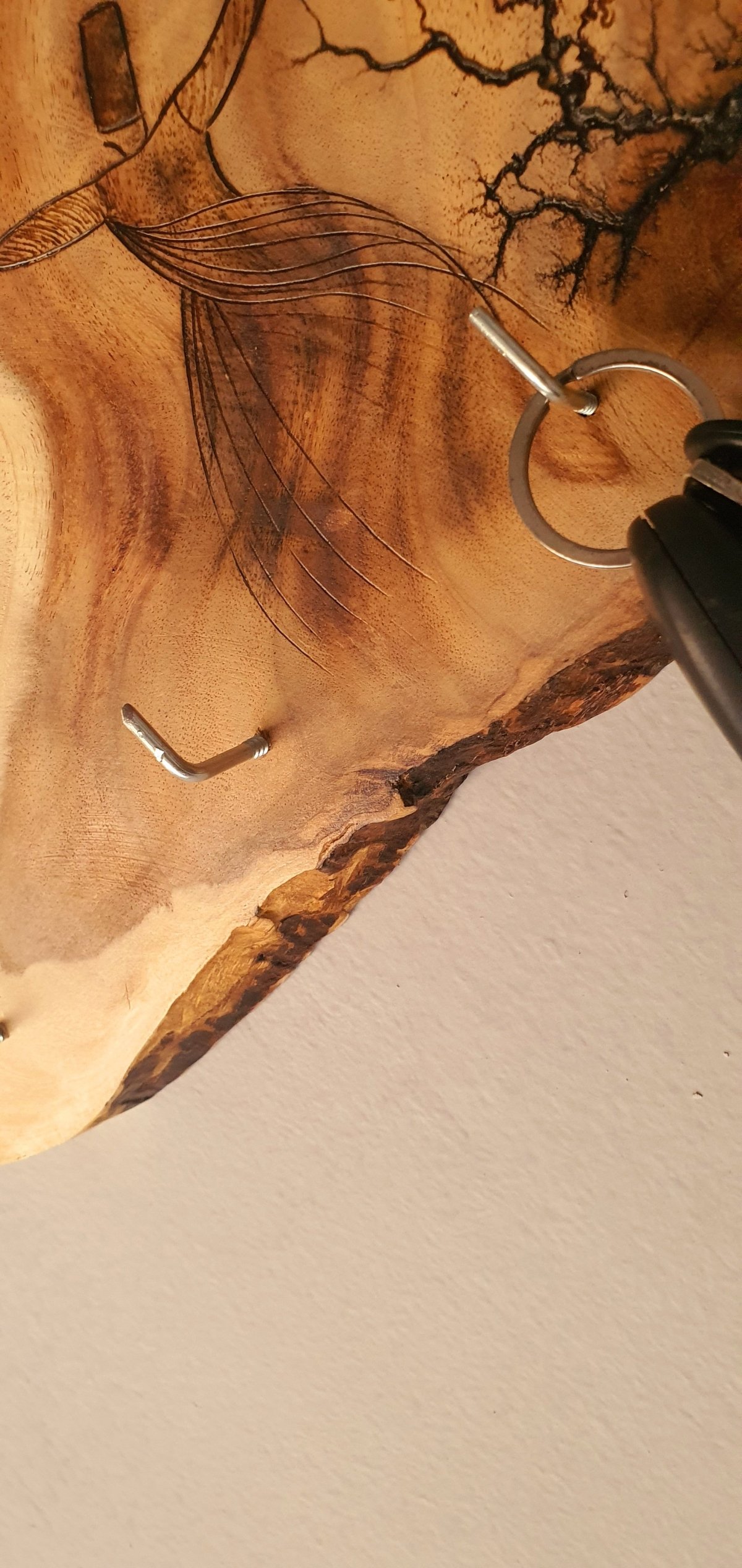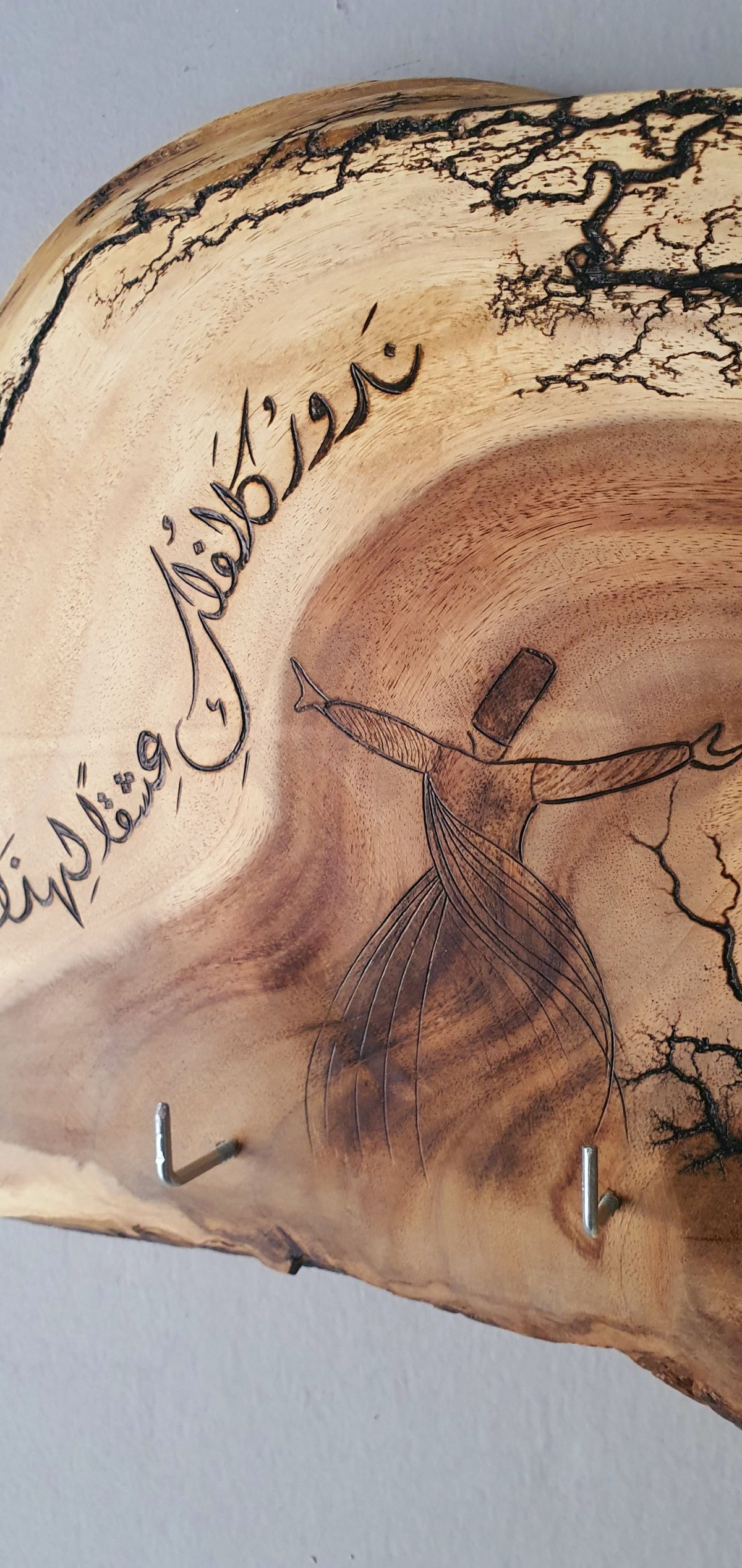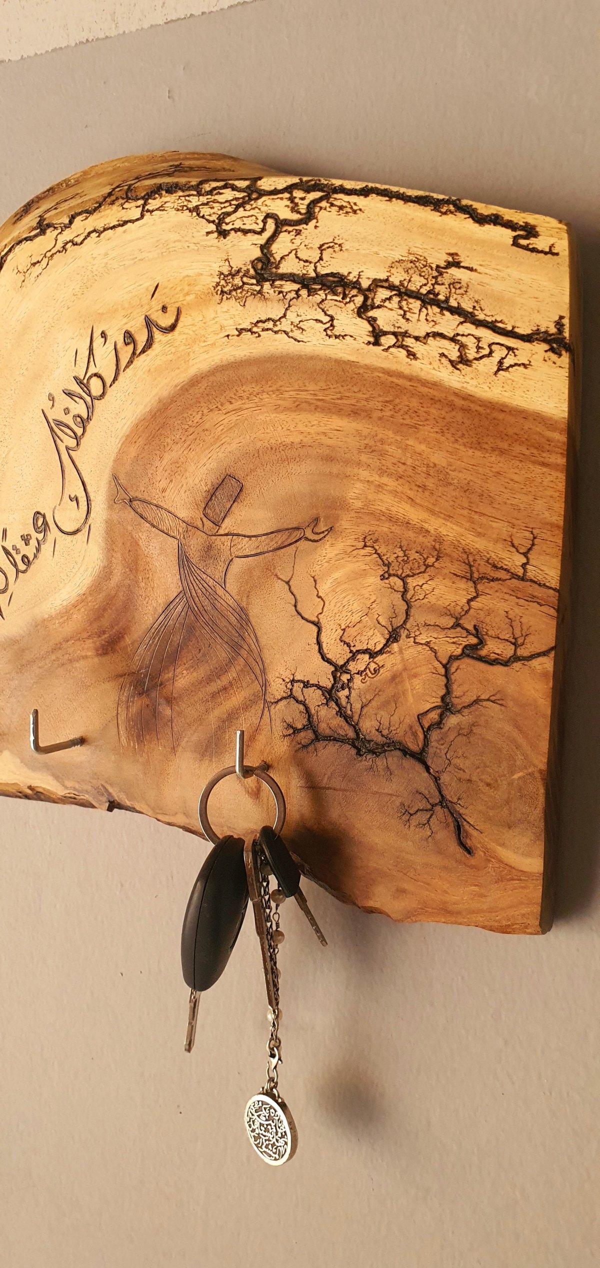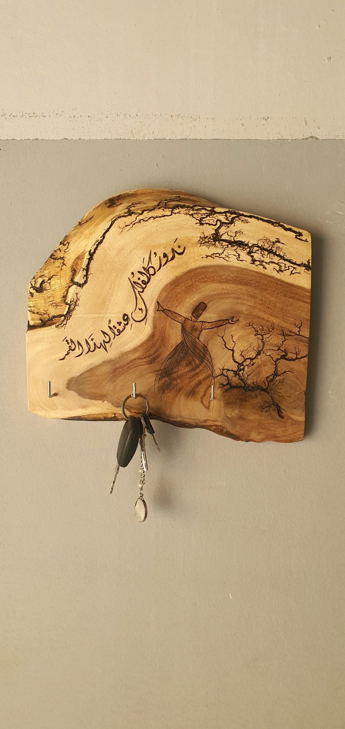 ندور كالفلك عشقًا لهذا القمر جلال الدين الرومي عليقة مفاتيح للتعليق بجانب الباب بثلاث عليقات، مصنوعة من جذع خشب من شجر السرسوع، مزين بتصميم فريد، نفَّذناه بفن الحرق اليدوي على الخشب. الأبعاد: حوالي ٣٠ في ٣٠ سم