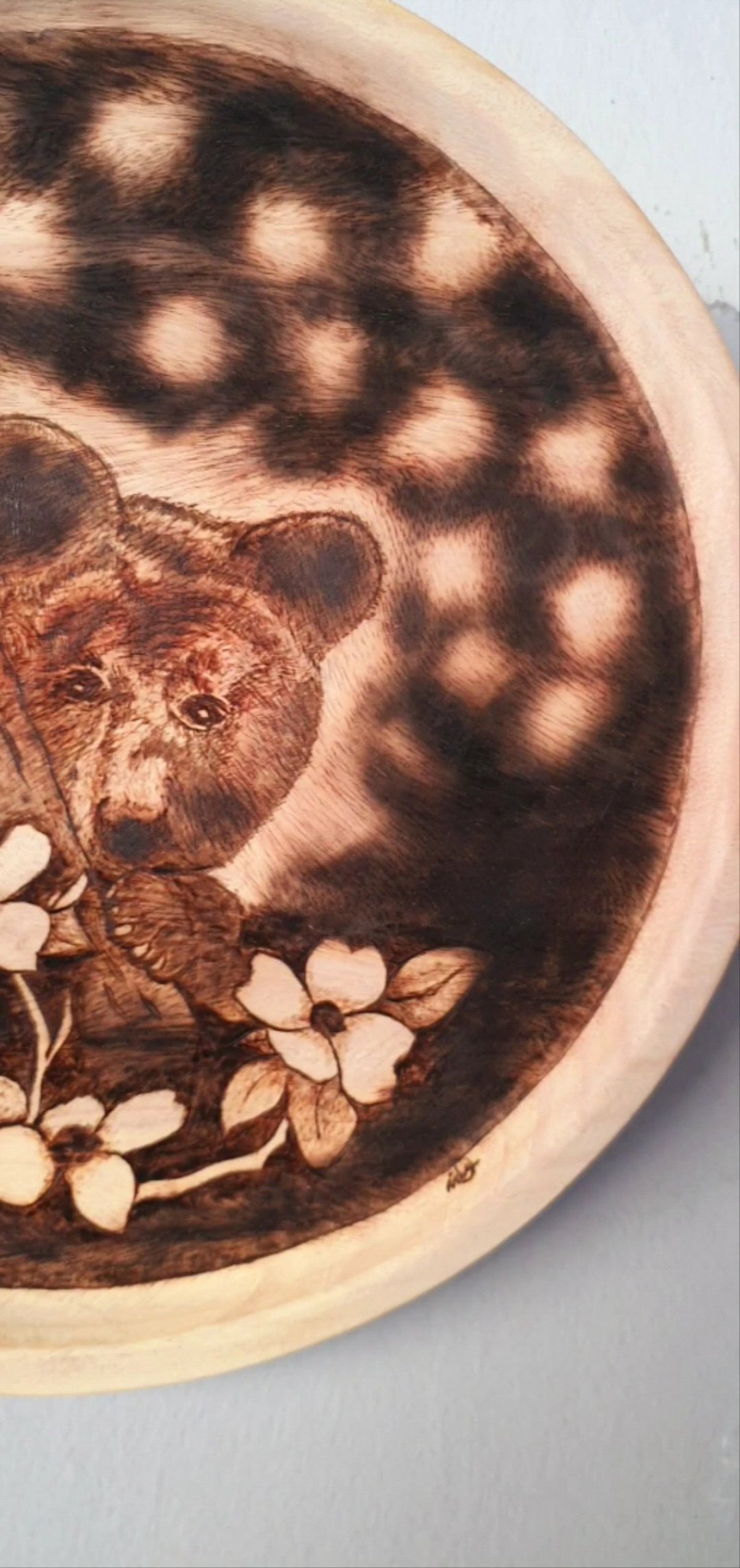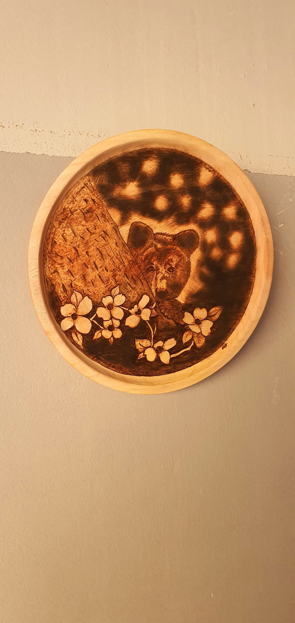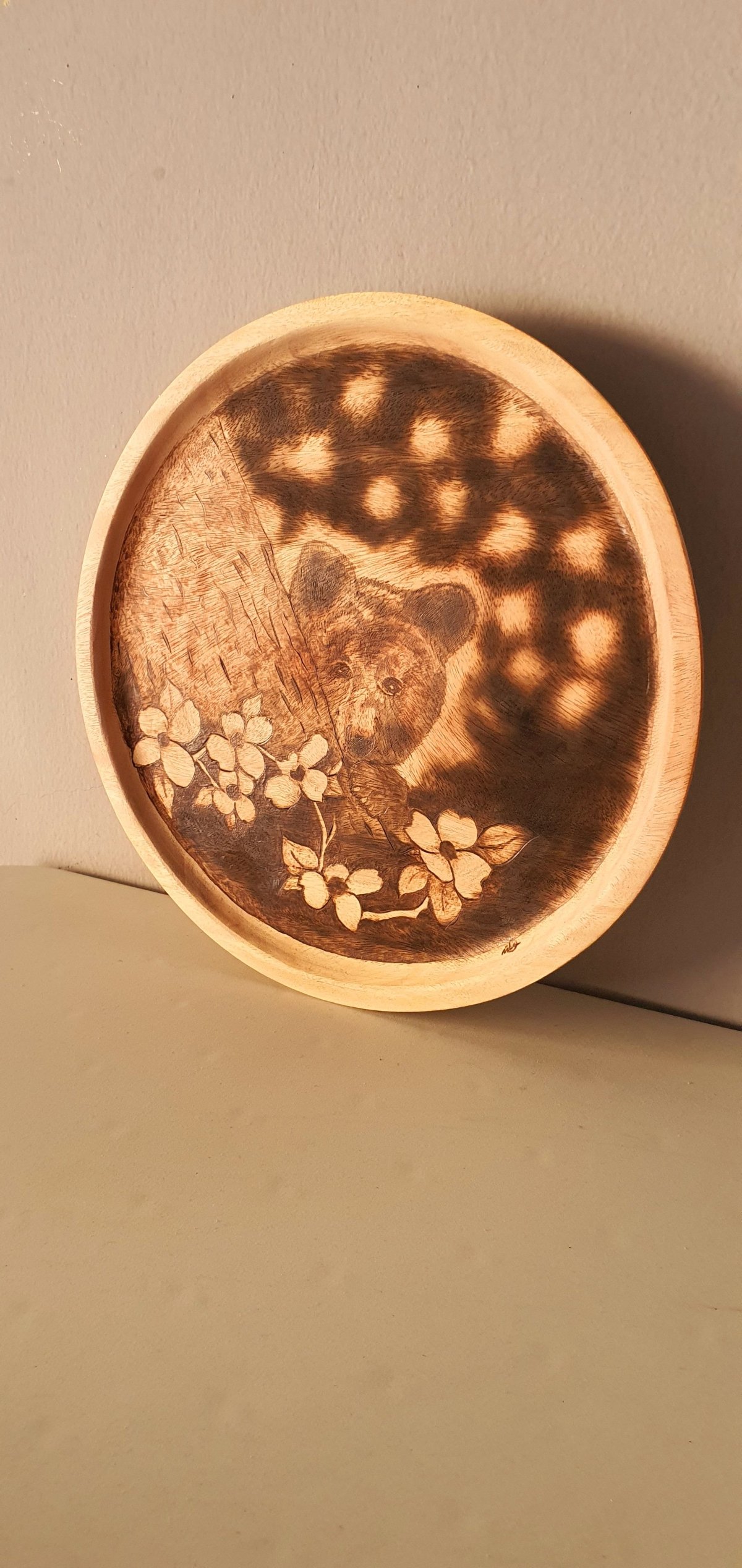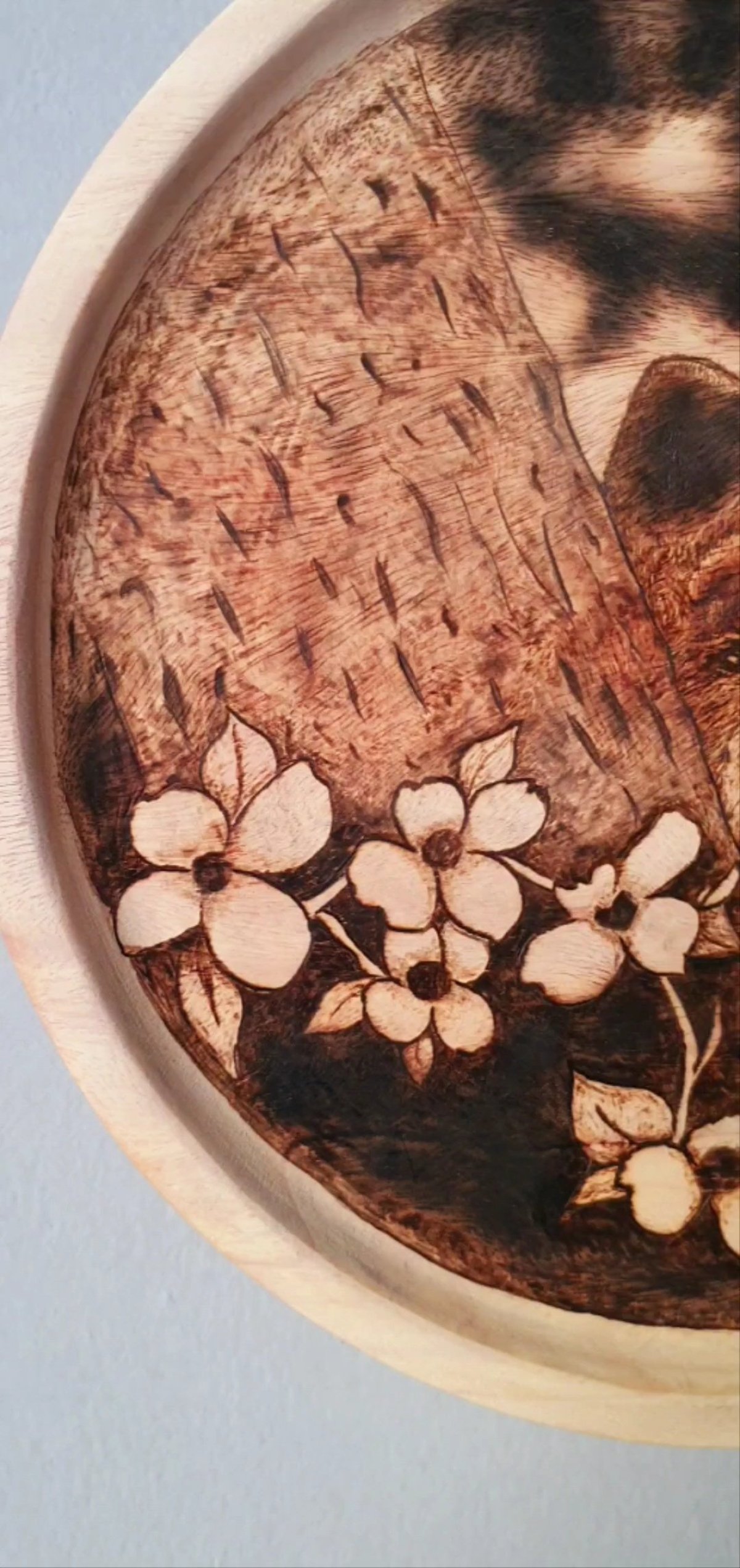 طبق من خشب الكايا الطبيعي بتصميم فريد نفذناه بفن الحرق اليدوي للتعليق على الحائط الأبعاد: قطر حوالي ٢٥ سم