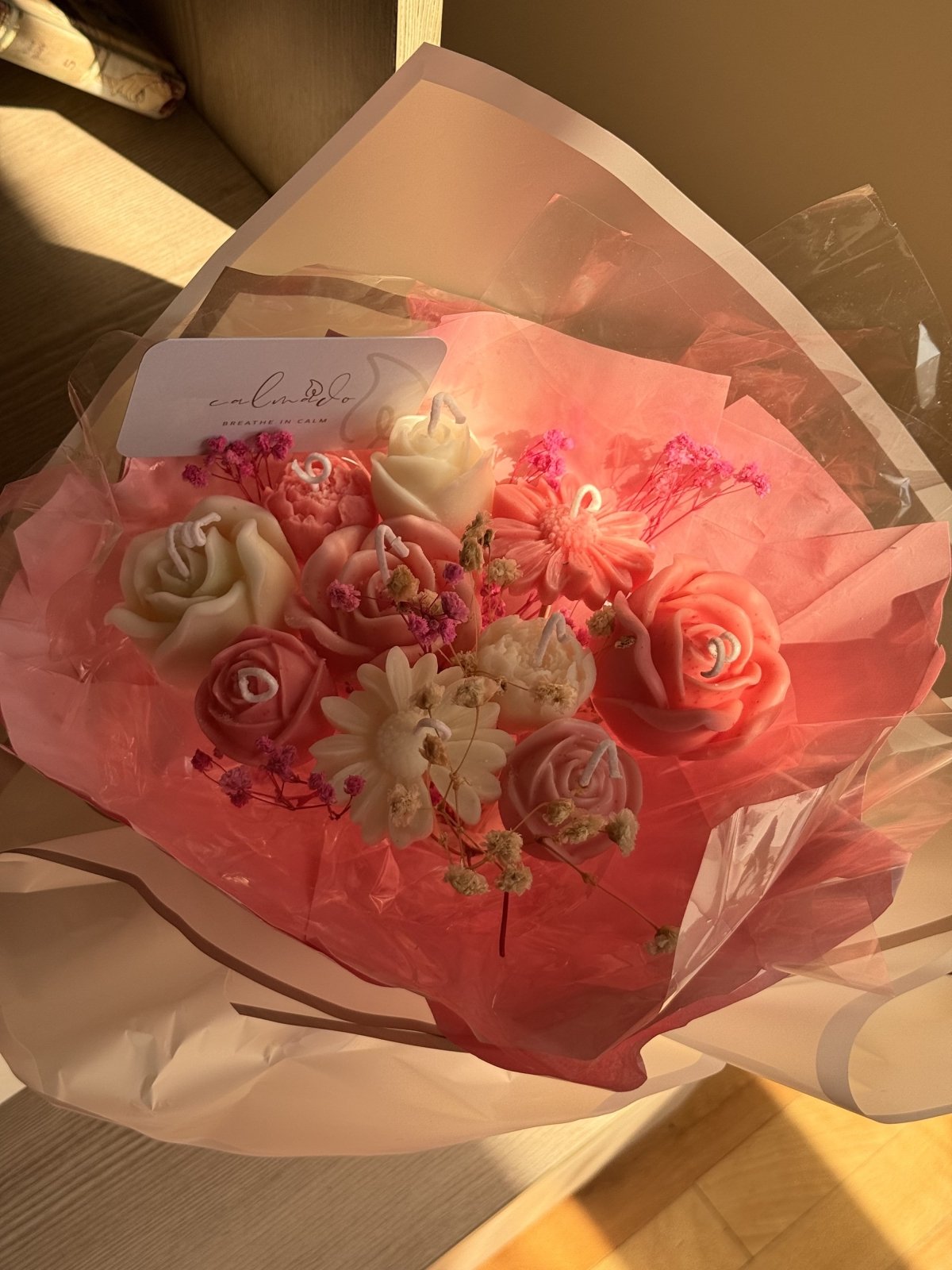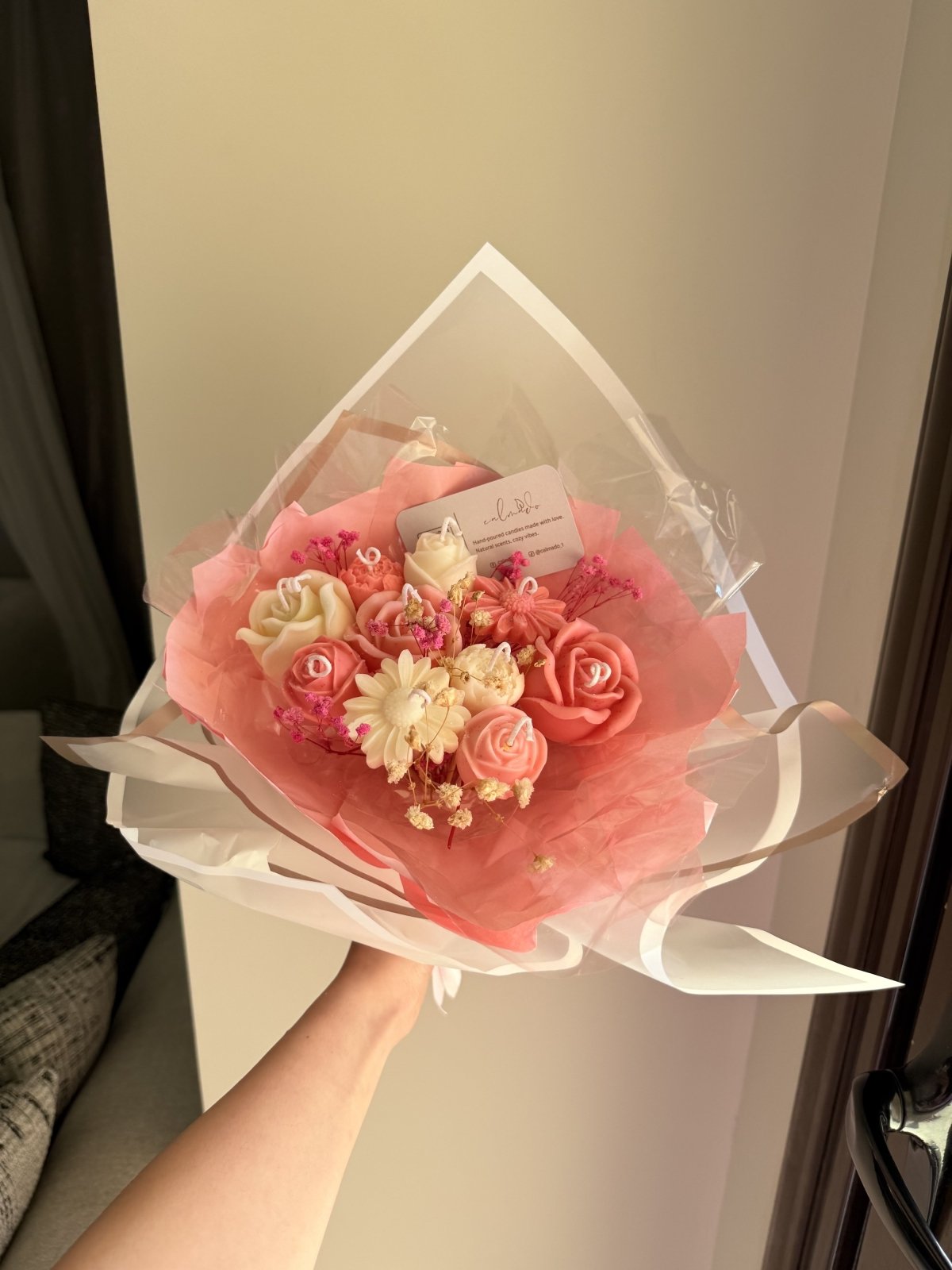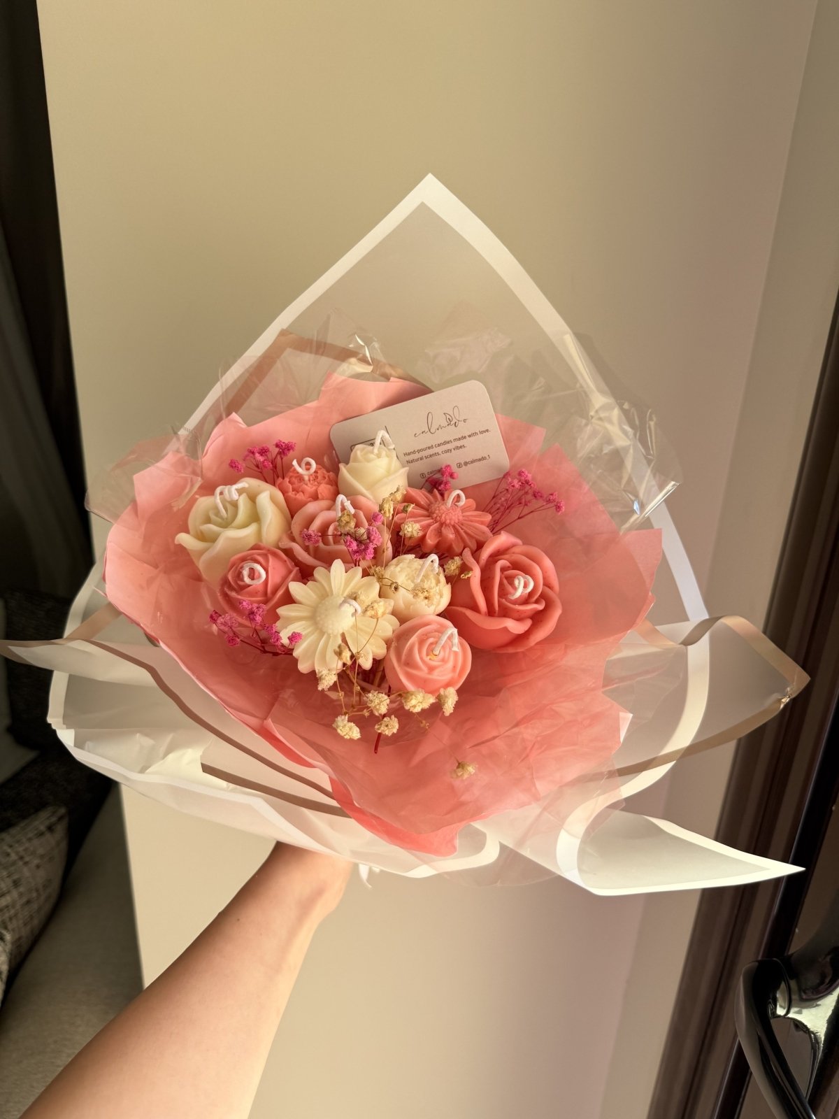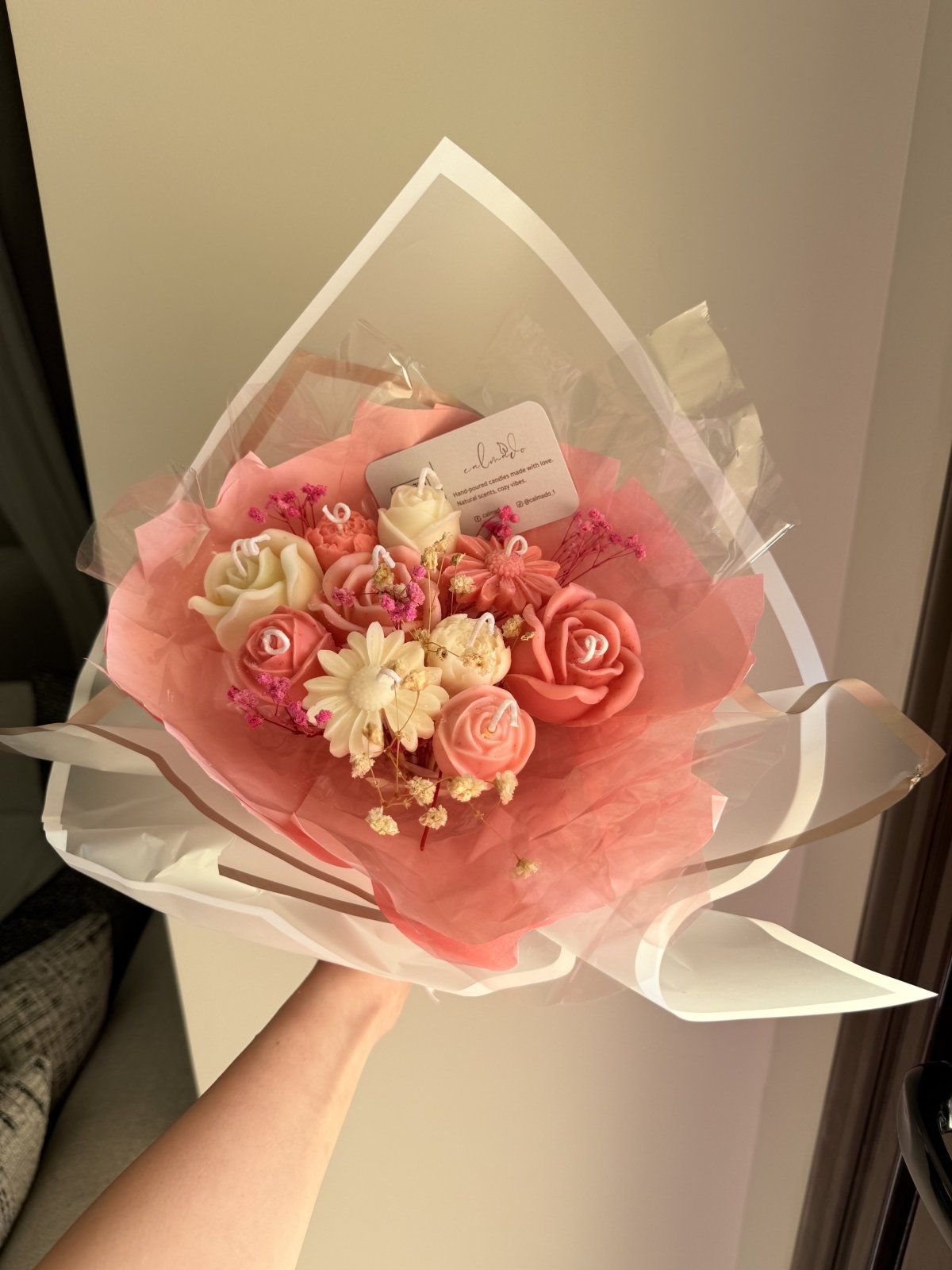 اجعلي هديتك أو ديكور مناسبتك أكثر تميزًا مع باقة الزهور المصنوعة من الشموع – مزيج رائع من الجمال واللمسة الشخصية. كل زهرة في هذه الباقة هي في الحقيقة شمعة مصممة بعناية على شكل وردة، ويمكنكِ اختيار عدد الشموع، ألوانها، ورائحتها حسب رغبتك. سواء كنتِ تفضلين الألوان الهادئة أو الألوان الجريئة، يمكنك تنسيق الباقة بما يتناسب تمامًا مع ذوقك أو مناسبة معينة. مثالية كقطعة مركزية لحفلات البيبي شاور، أو هدية مميزة ومبهجة. ✨ أنتِ تختارين: • 🌺 عدد الشموع على شكل زهور • 🎨 الألوان التي تناسب ذوقك أو ثيم الحفلة • 🌸 الرائحة المفضلة لديك (أو بدون عطر إن أردتِ) باقة مصنوعة يدويًا بحبّ، تضيف لمسة فريدة لأي مناسبة