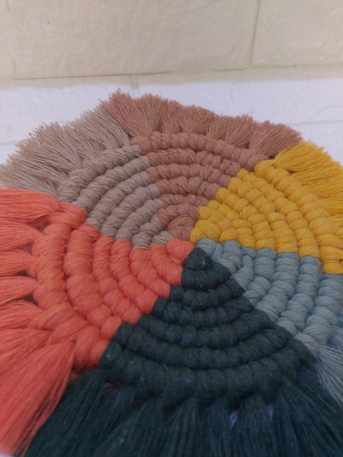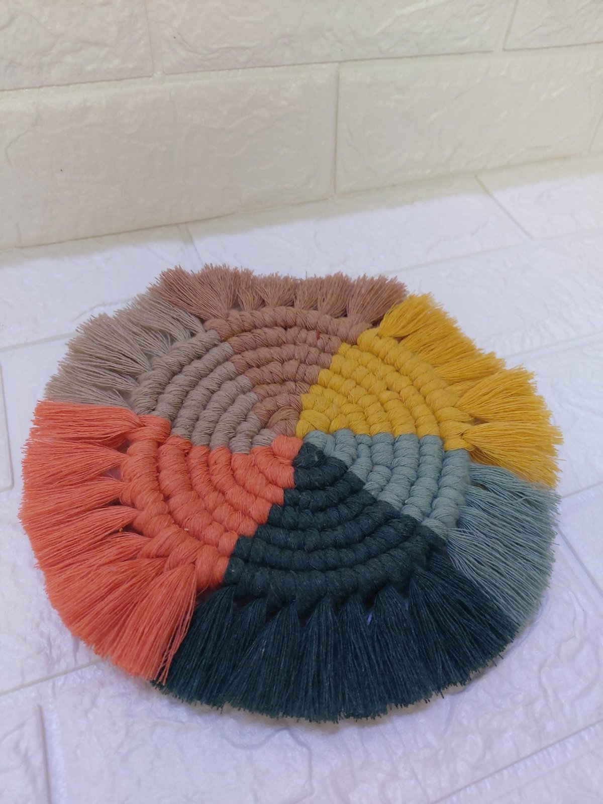 كوستر اكواب واطباق صغيره مصنوع من خيوط المكرميه القطن المقاس القطر الداخلى ١٥ سم القطر الخارجى ٢٠ سم يمكن تغيير المقاس والالوان حسب الطلب
