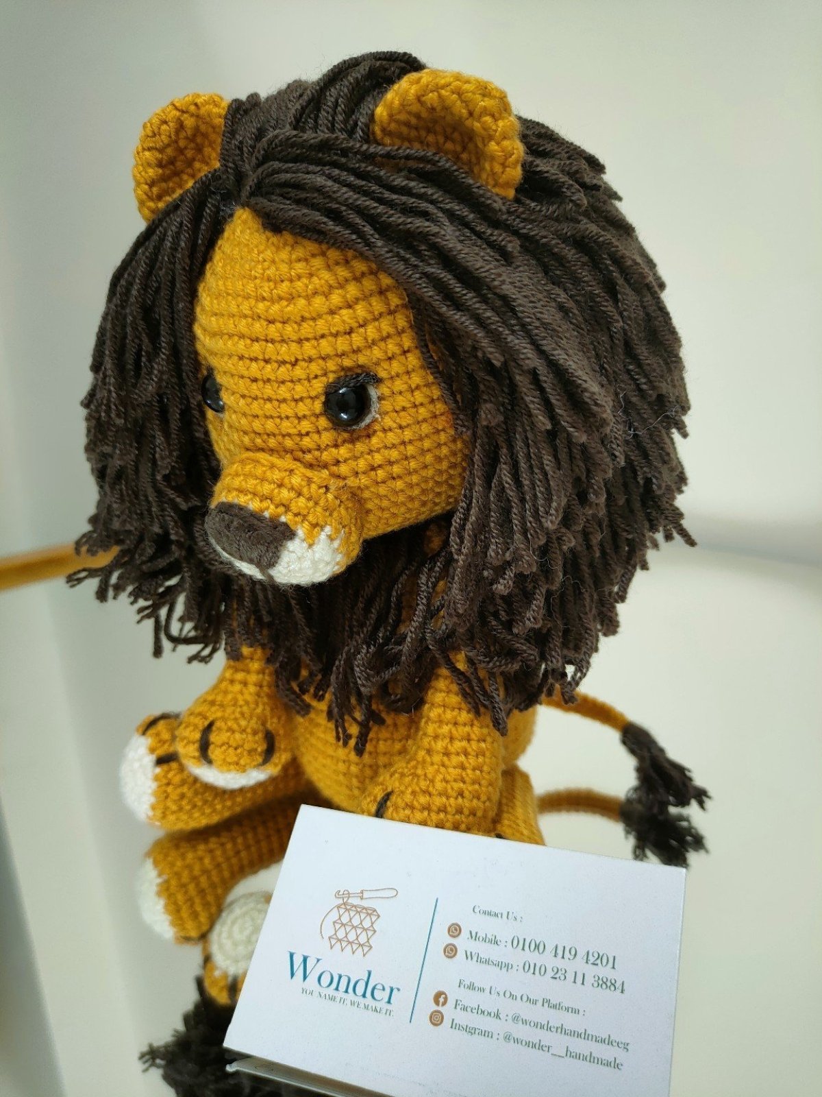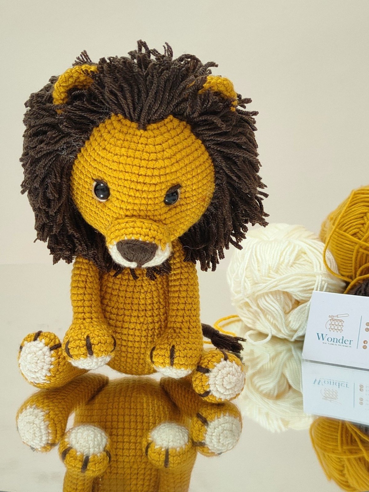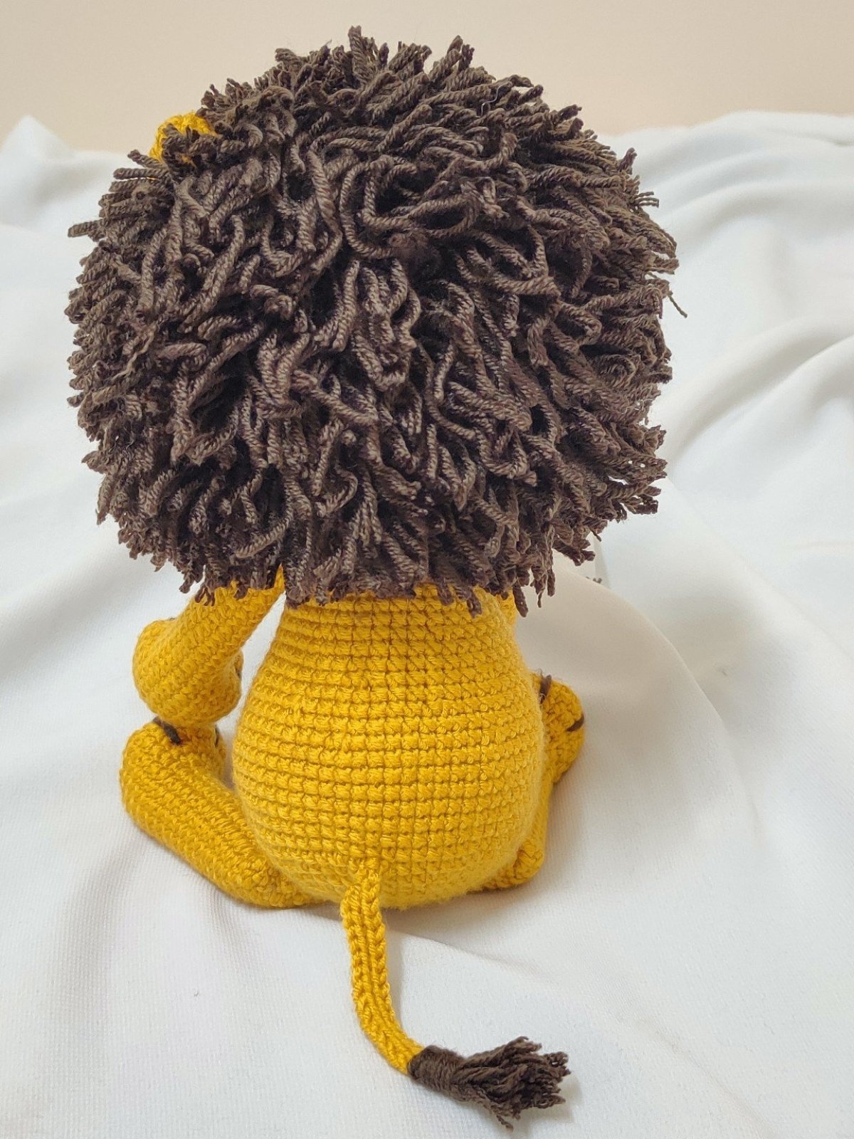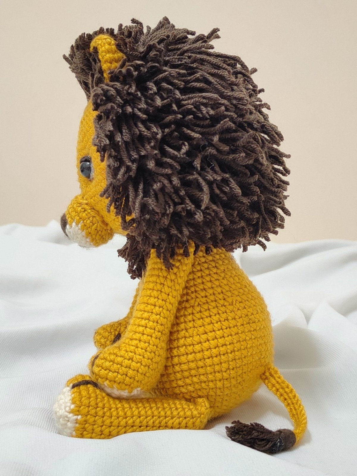 crocheted lion a beautifully handmade amigurumi plush Key Features of the Crocheted Lion: Material: Made using high-quality yarn, Design: The lion has a rich golden yellow body with a dark brown mane and tail tuft. White details on the paws and around the mouth. The mane is full, made with looped yarn strands for a textured, voluminous effect. Facial Features: Cute safety eyes give it an expressive, friendly look. The snout and mouth are well-constructed with color accents for realism. Posture: The lion is designed to sit, which adds to its display or gift appeal.