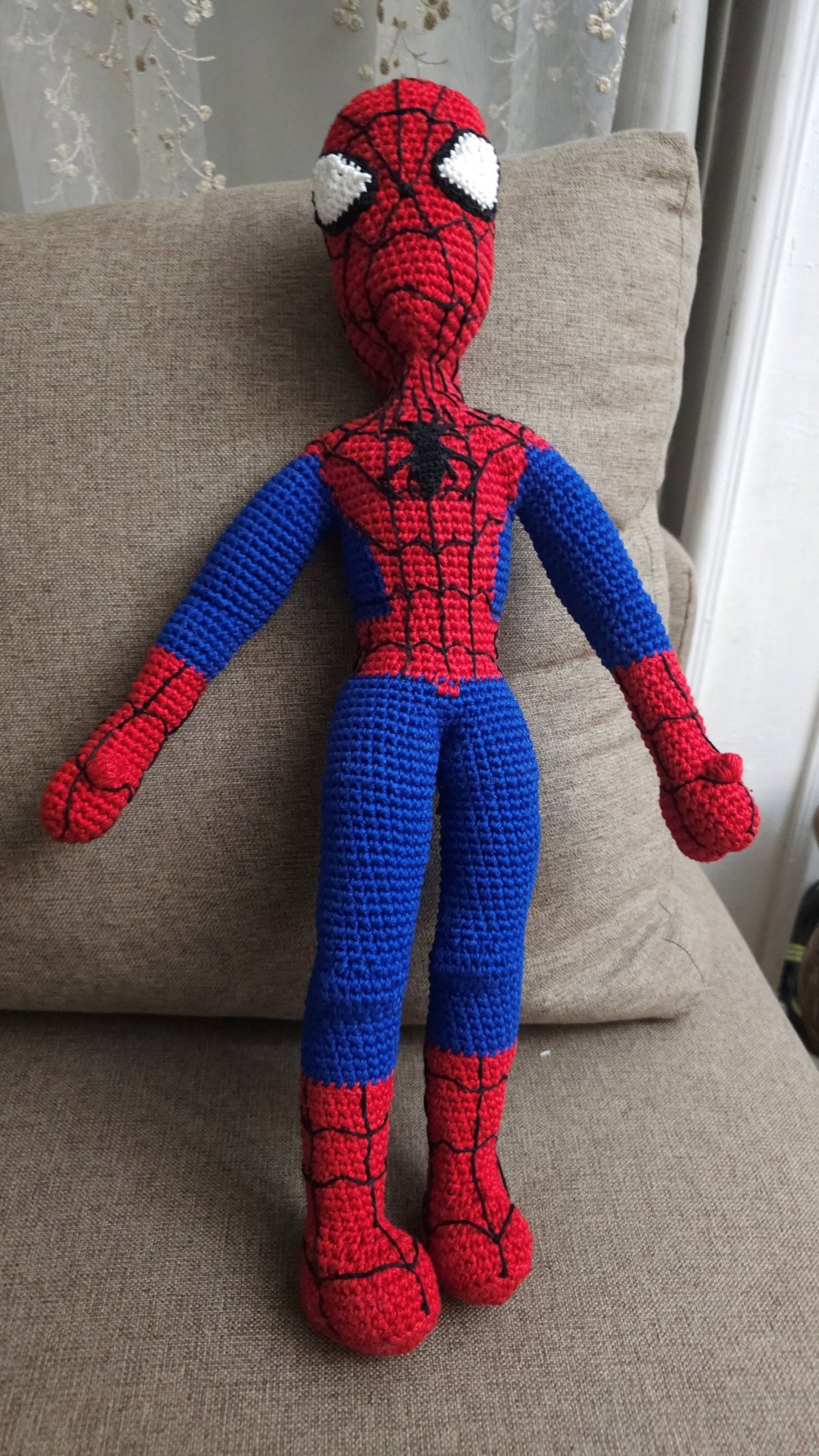 دمية محشوة تدعى سبايدر مان، بطل الأكشن من فيلم سبايدر مان والقصص المصورة، مصنوعة من خيوط قطنية ويبلغ ارتفاعها 40 سم.
