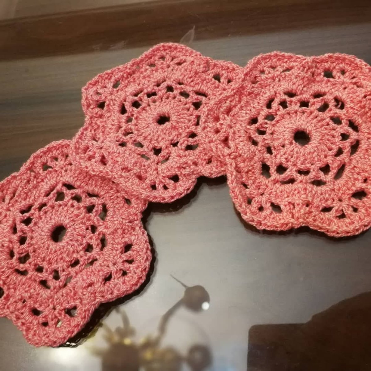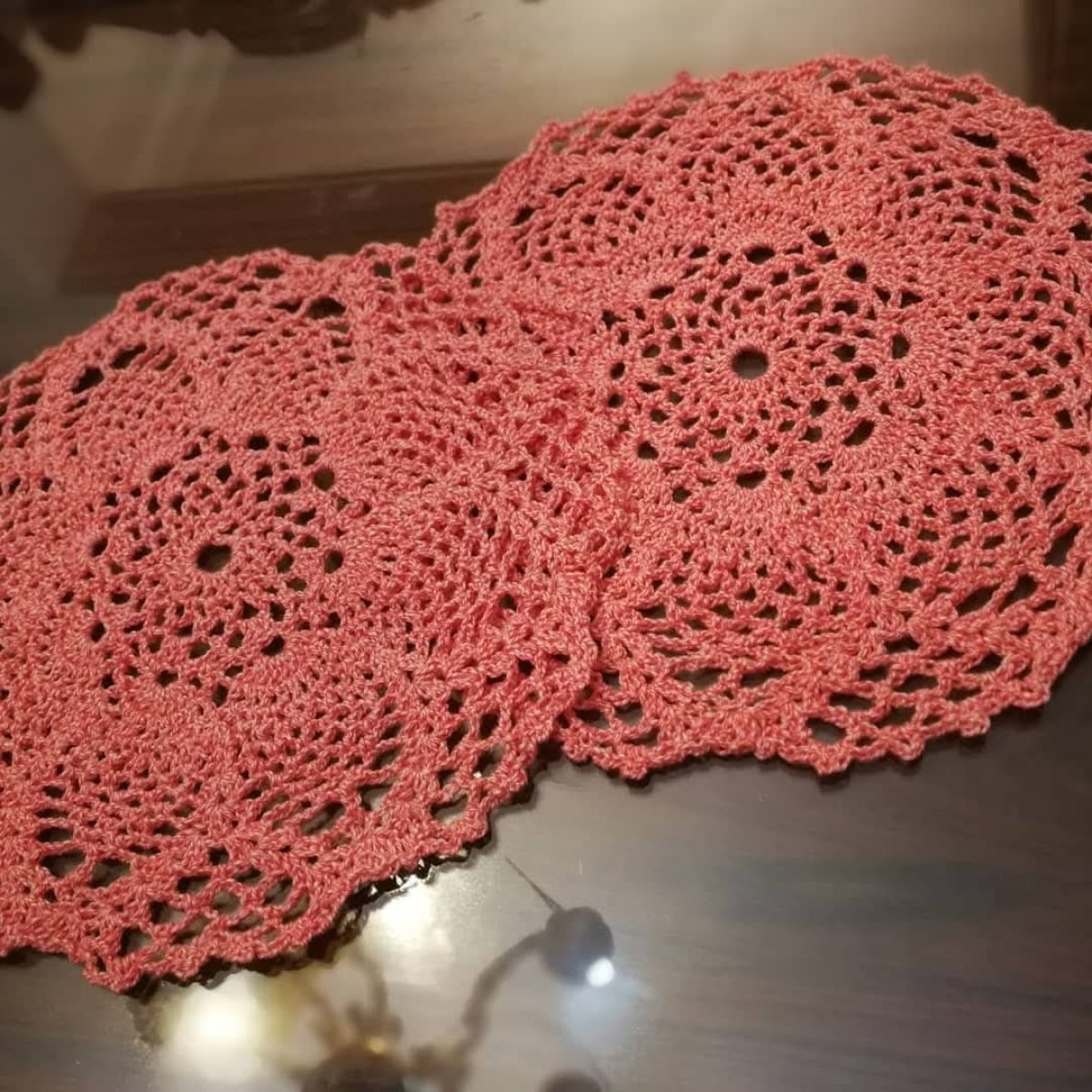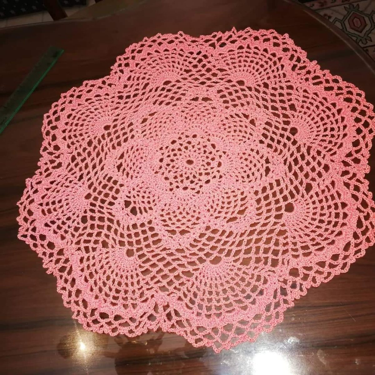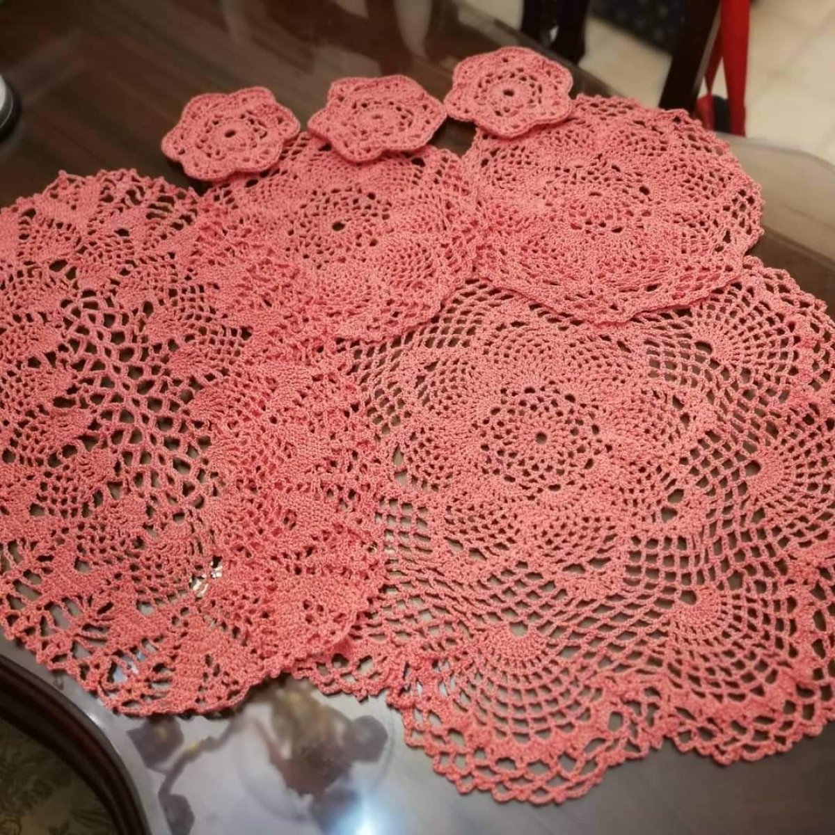 طقم غرفة نوم من المفارش المصنوعة من أي خيط ولون حسب الاختيار. أبعادها هي مفرش دائري 55 سم، مفرش بيضاوي 55 * 35 سم، مفرشان صغيران 28 سم، 3 قواعد أكواب 14 سم
