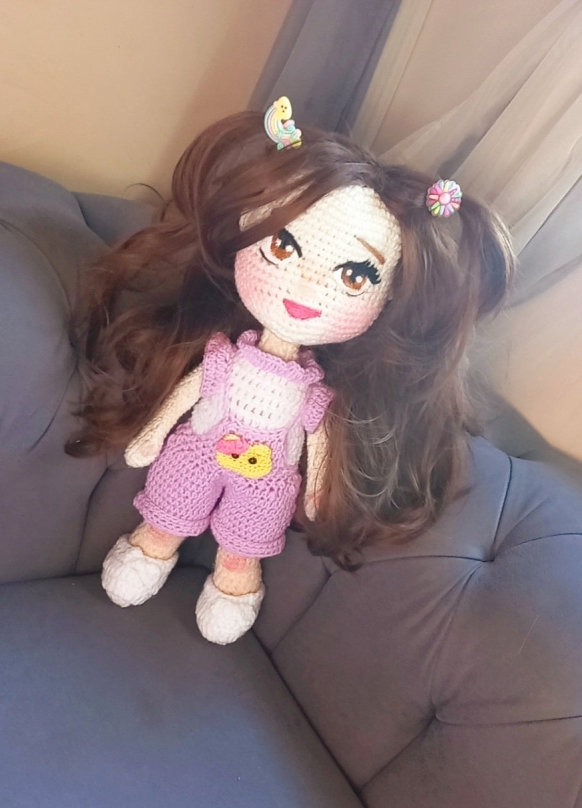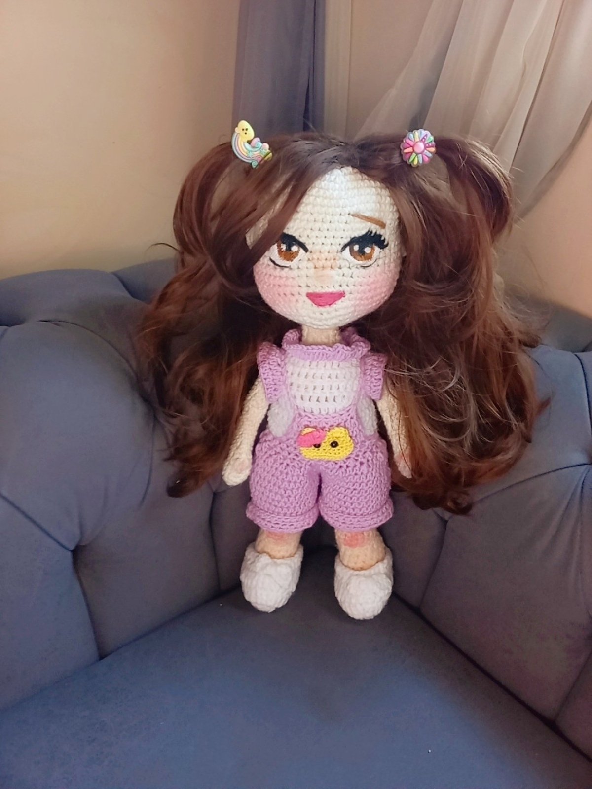 عروسة كروشيه جميلة ٥٠ سم شعر بني حراري مدعمه بسلك داخلي لبس منفصل متاح تغيير في التفاصيل آمنة علي الاطفال