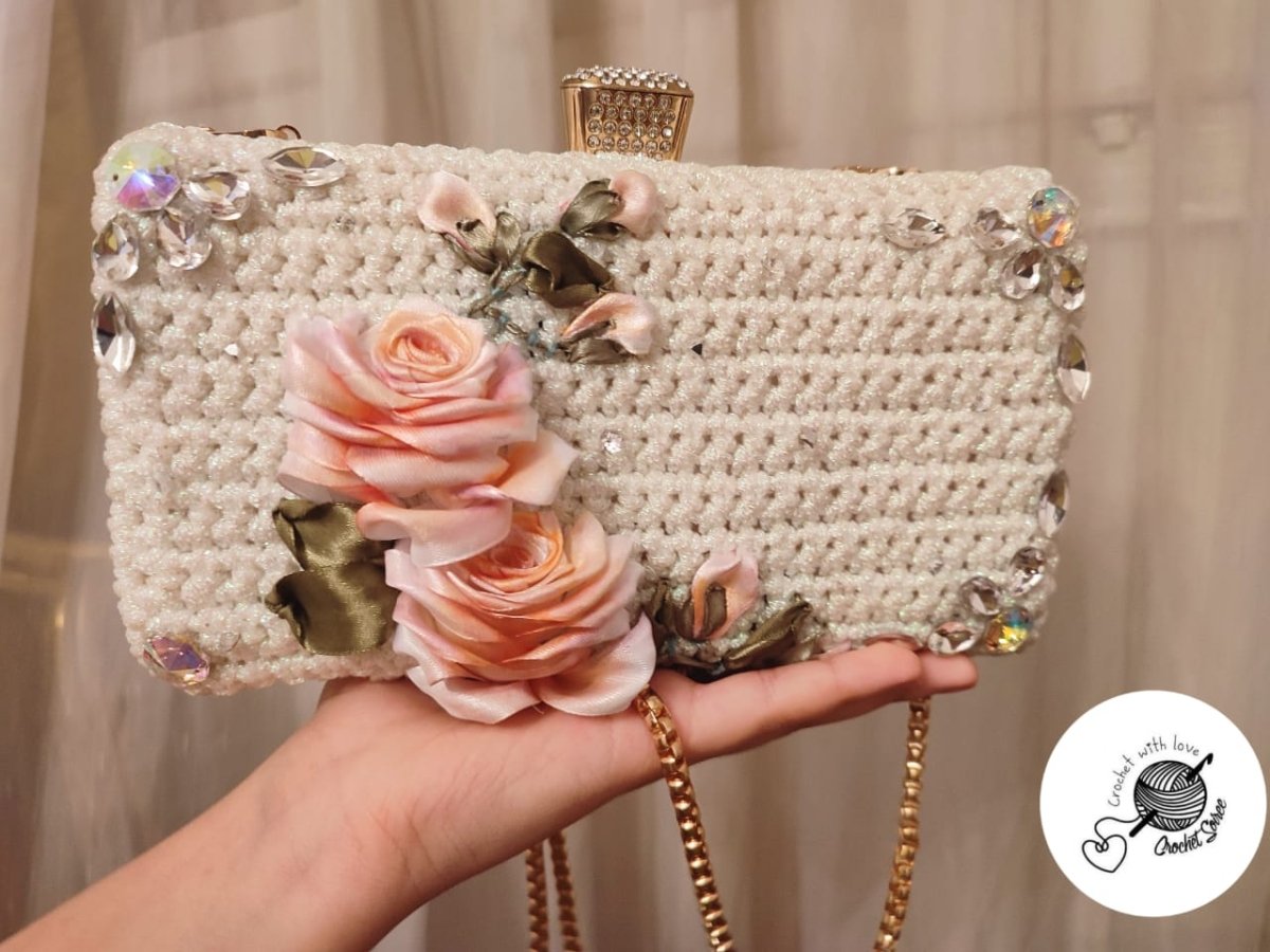 ✨ شنطة "بريق" – لمسة من الرقي تتكلم عنك ✨ مقاس: 11×22 سم شنطة سواريه هاند ميد متقنة من خيط لامع ناعم ولمّاع، مطرزة بالورود الستان والساتان وتفاصيل استراسات بتلمع بنعومة وجاذبية. الفريم الدهبي الراقي بيكمل الإطلالة ويضيف لمسة ملكية لكل مناسبة.