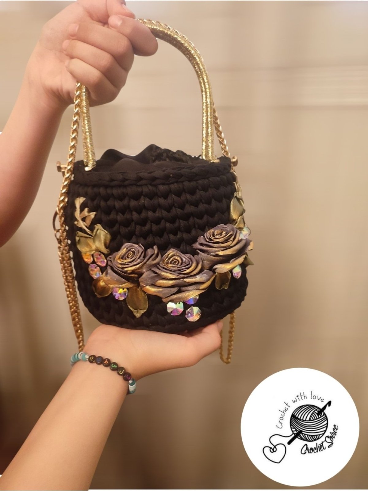 لما يهمسك الليل بسحره، محتاجة شنطة تليق بالمشهد. "همس الليل" مش مجرد شنطة، دي تحفة هاند ميد قطرها ٢٠ سم وارتفاعها ١٨ سم، مصنوعة بإتقان على خيط أسود كليم فاخر، ومطرزة بورود ساتان فاخرة ولمسات لامعة تخطف العين.