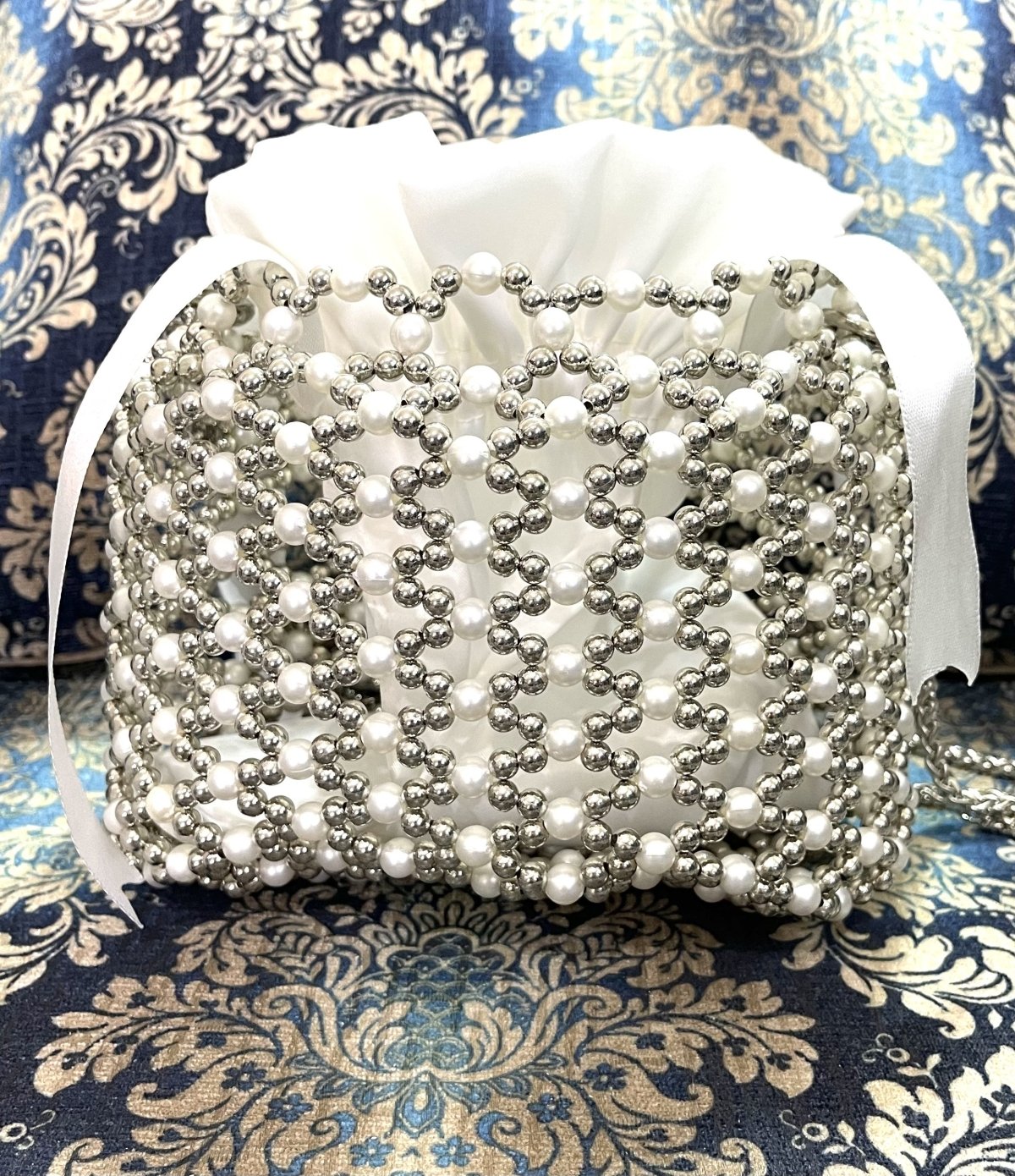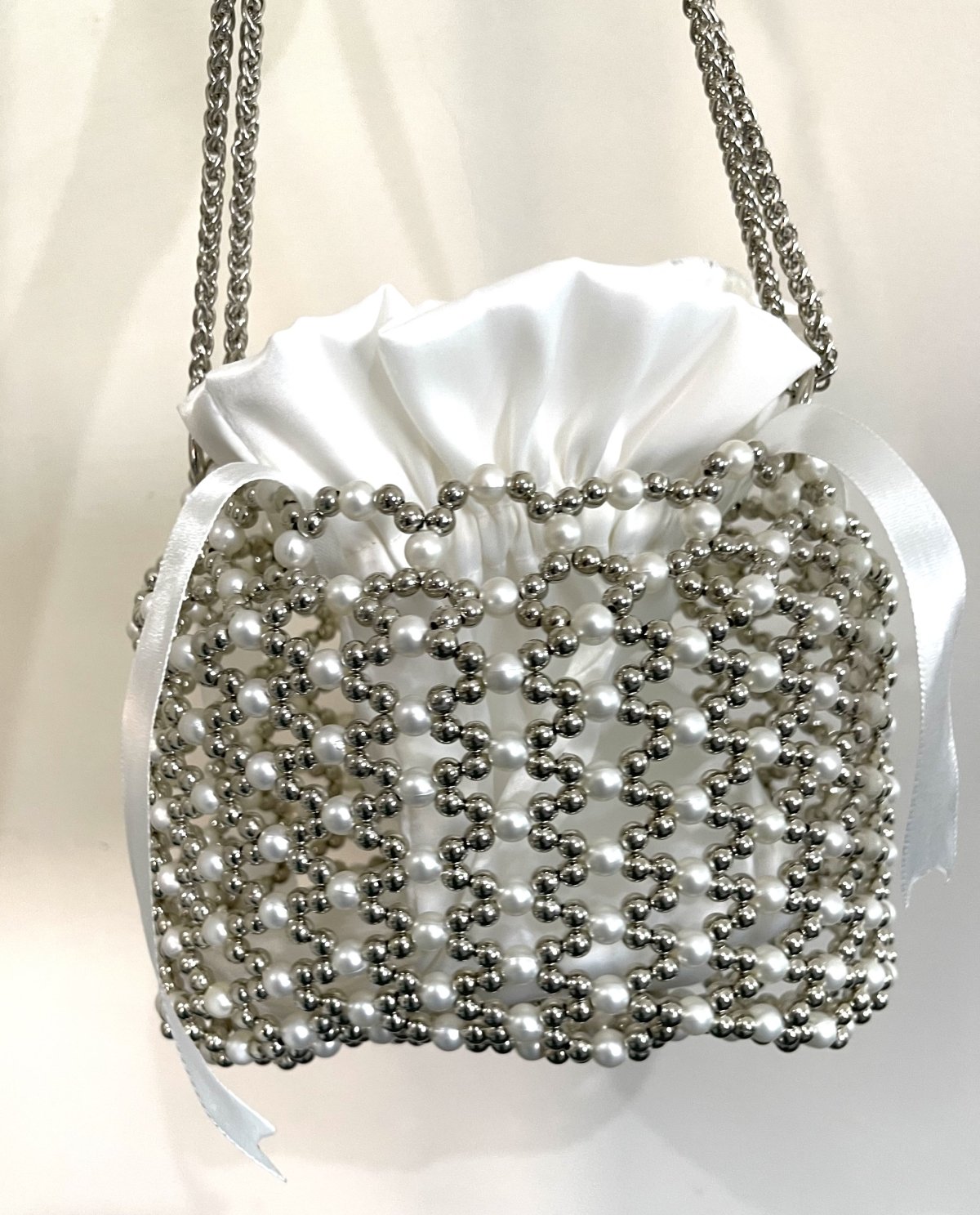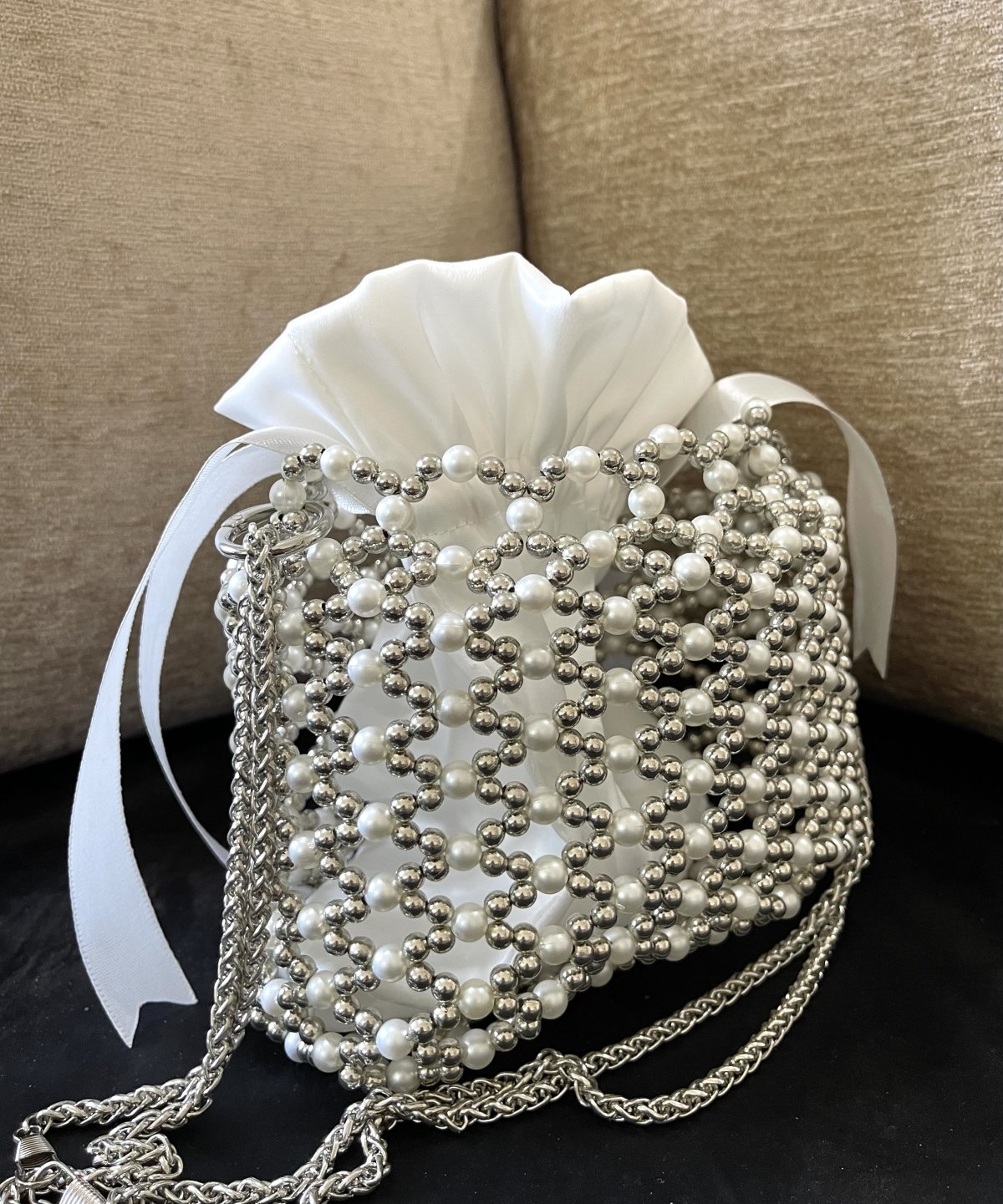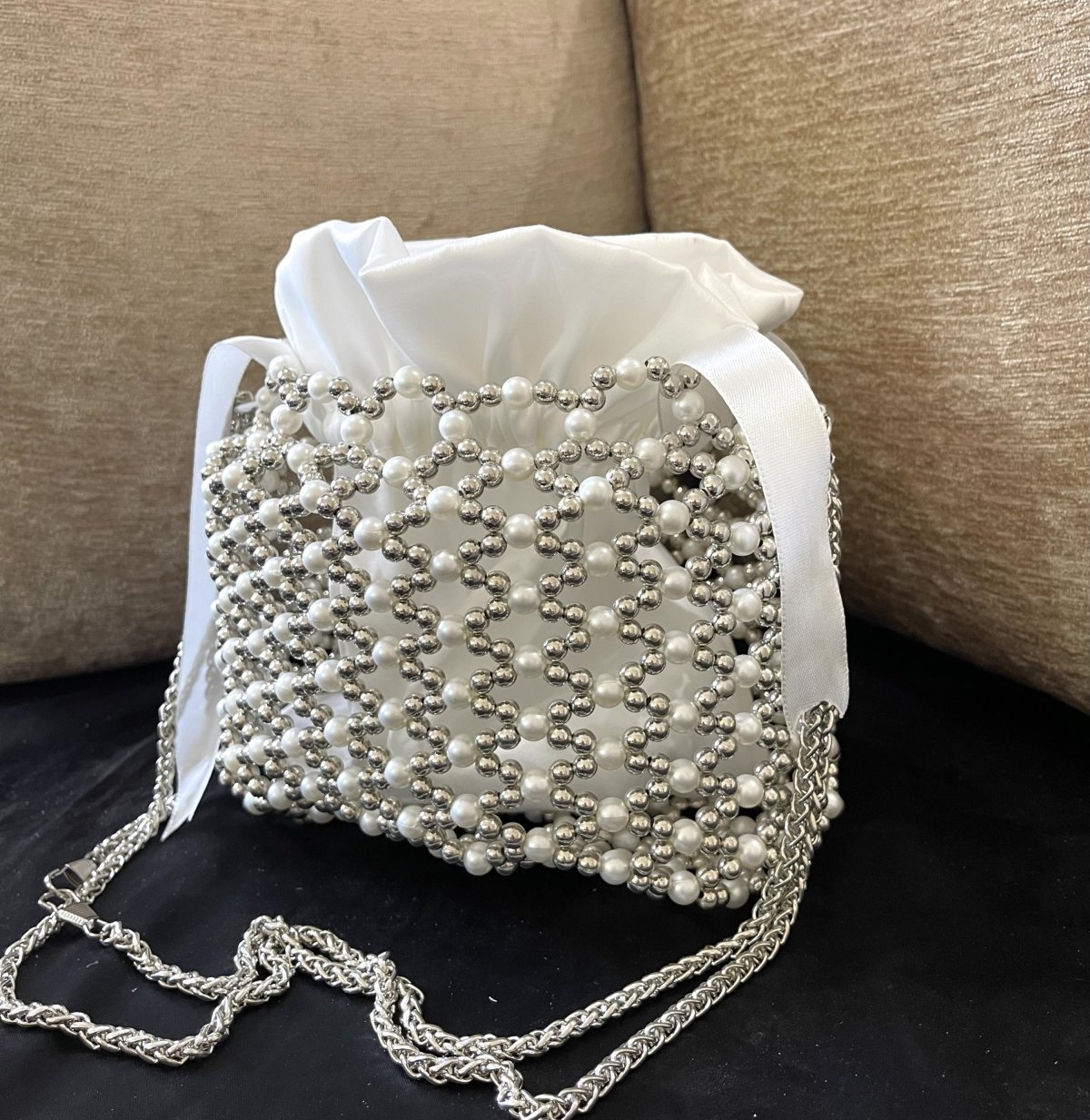 شنطة من الخرز الفضى سى سى بى مع لولى أبيض مزوده بحزام معدنى وحلقات سهلة الفتح مع بطانه ستان الطول ١٤سم العرض ٢٠ سم العمق ١٠ سم تكفى ٢ موبايل و محفظة وأشياء أخرى