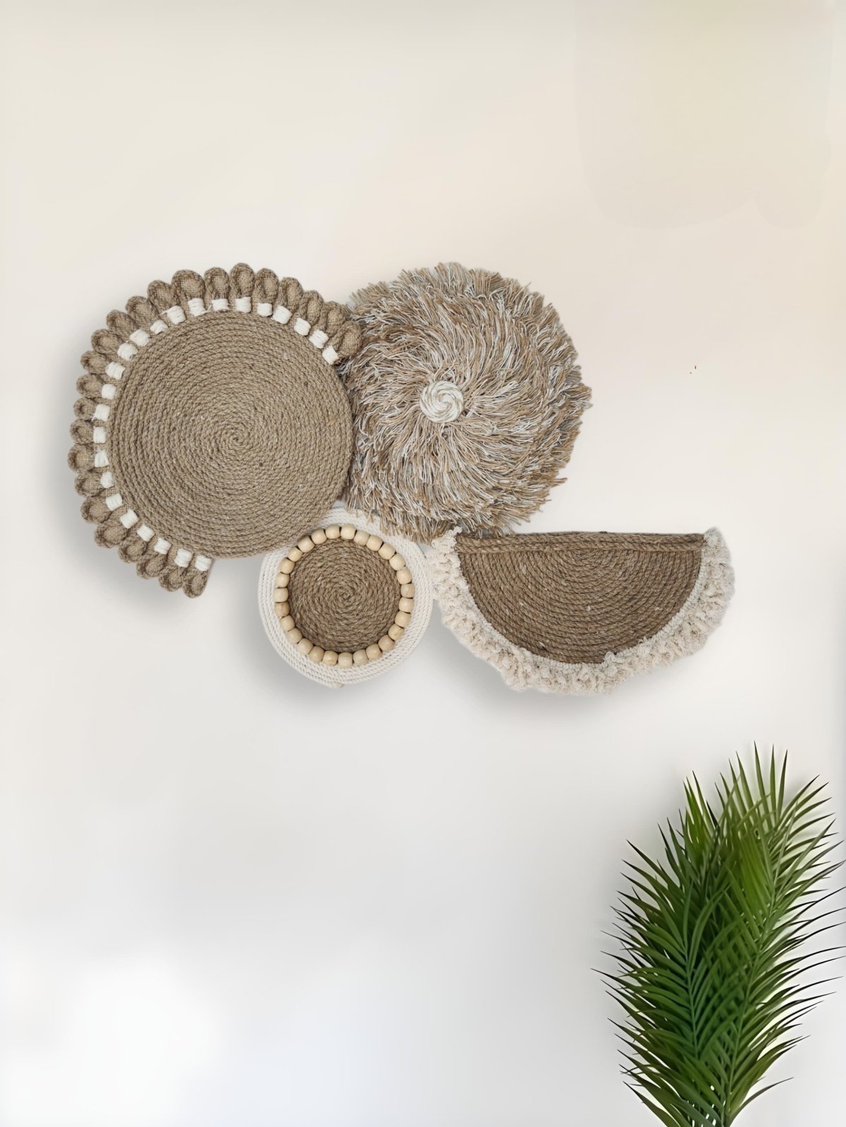 زيني مساحتك الحياتية بهذا المجموعة الفنية المعلقة على الجدار بتصميم بوهو يدوي الصنع. مصنوعة من الجوت الطبيعي ومزينة بنسيج دقيق وخرز خشبي. تحتوي على ثلاث قطع دائرية فريدة وقطعة نصف دائرية، كل منها يتميز بخليط من القوام والألوان الطبيعية المحايدة. ✨ مثالية لإضافة لمسة ريفية بوهيمية لأي غرفة. ✨ هذا الديكور الصديق للبيئة مصنوع يدويًا بعناية ومتانة. ✨ مناسب لتزيين الجدران في غرف المعيشة أو النوم أو المكاتب. 🎁 قطعة مثالية للديكور أو كهدية مميزة. الأحجام المتوفرة 2 كوستر 30 سم 2 كوستر 20 سم