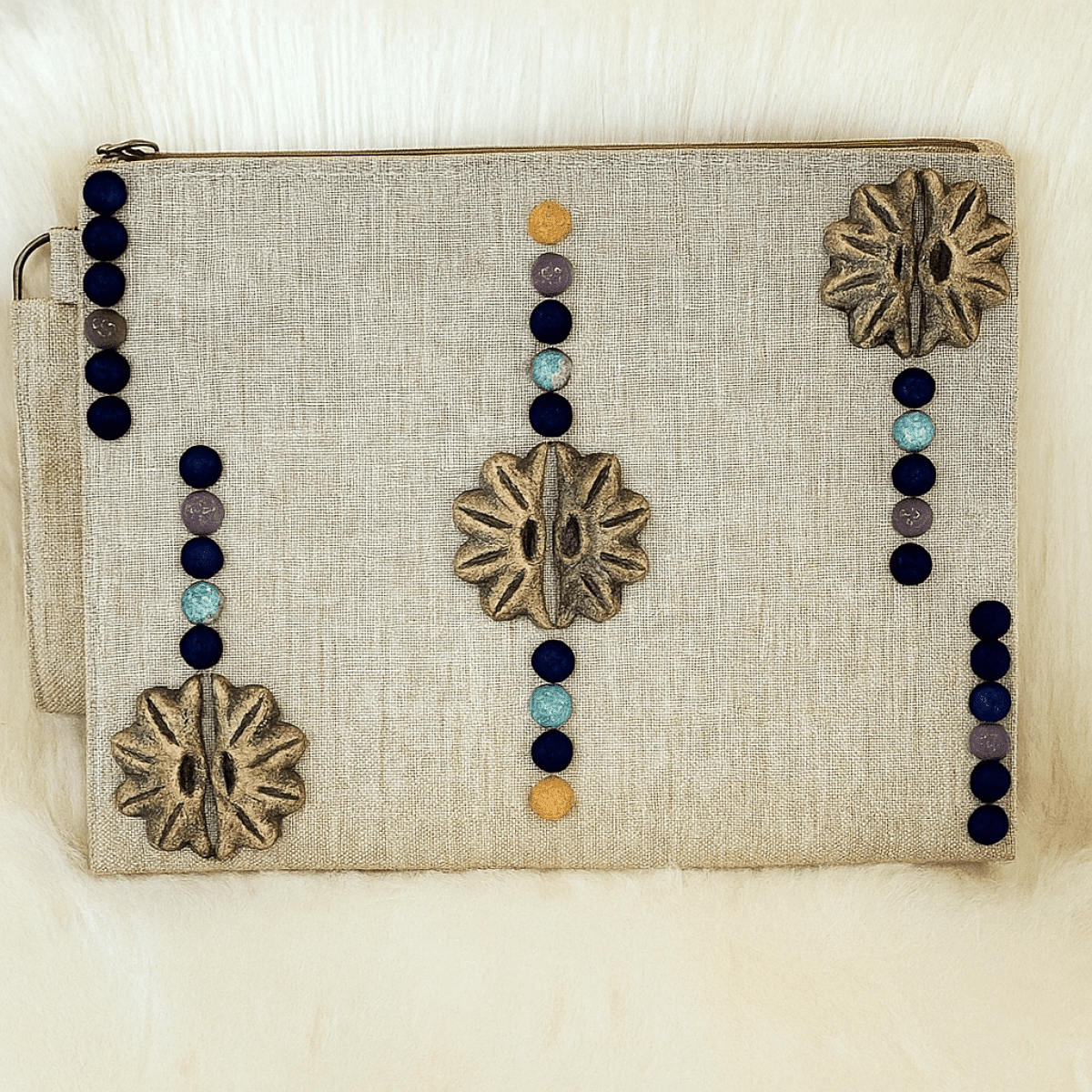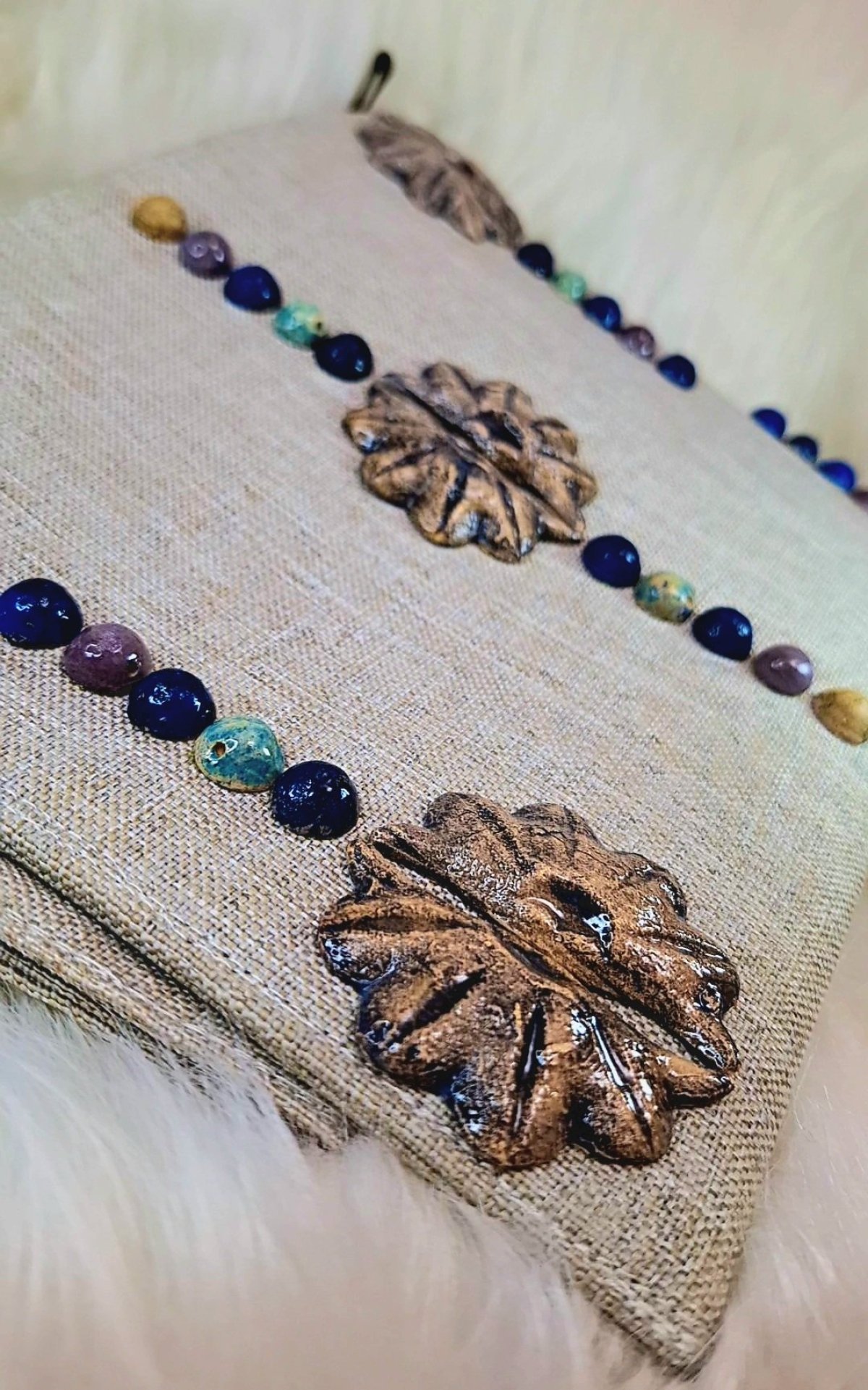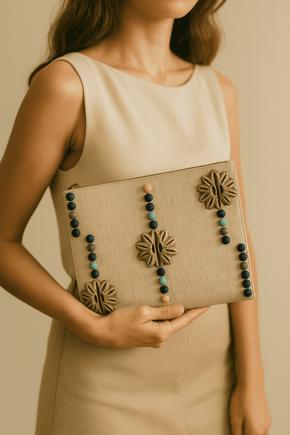 كلاتش من الكتان مطعمه بالخزف مقاس 20*25 سم قطعة فنيه مميزه هتضيف شكل مختلف ومميز للزي مستوحاه من الطراز المصري القديم ومصاغه بشكل معاصر أول علامة تجارية لإنتاج مكملات الأزياء الخزفية باستخدام تكنولوجيا التحكم الرقمي