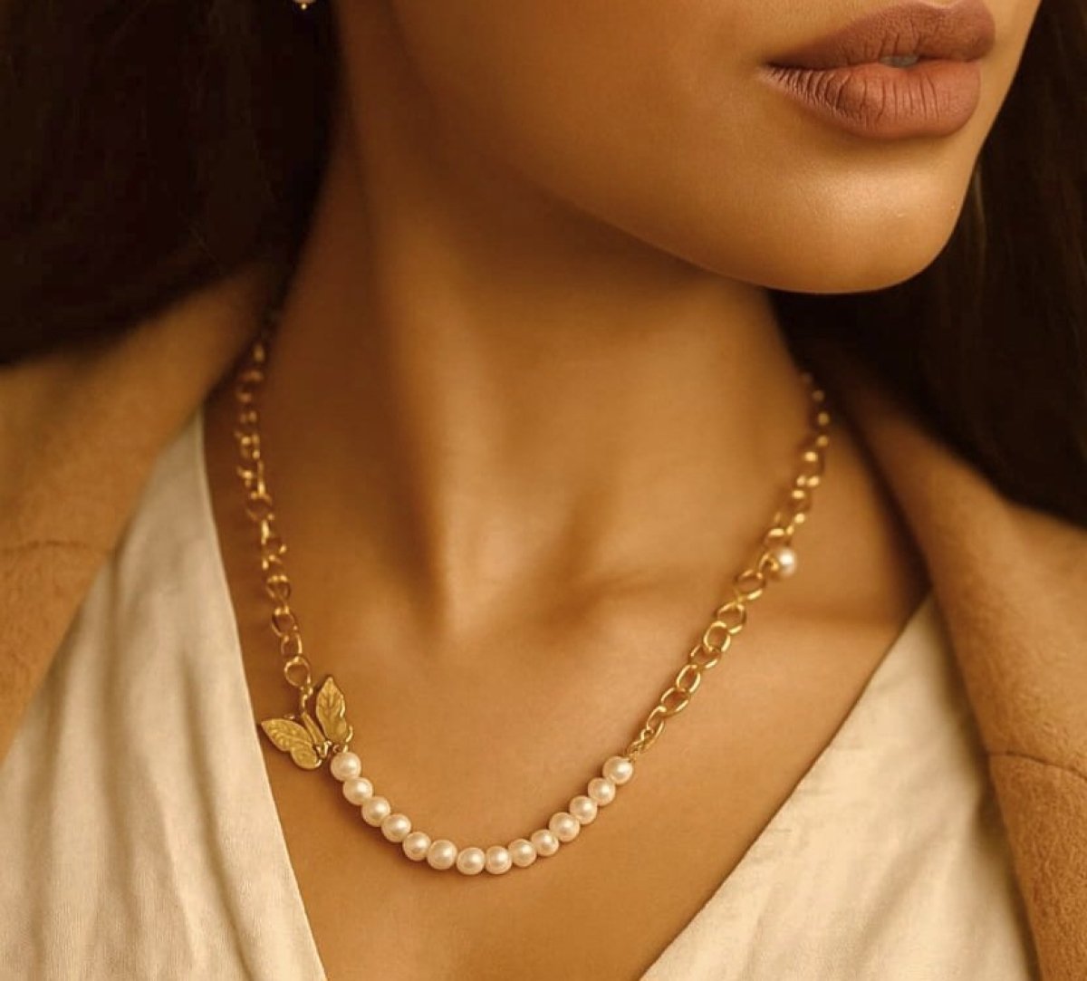 كوليه فضه المطعمه باللولي الطبيعي م ٤٥ سم مطلي بالذهب عيار ١٨