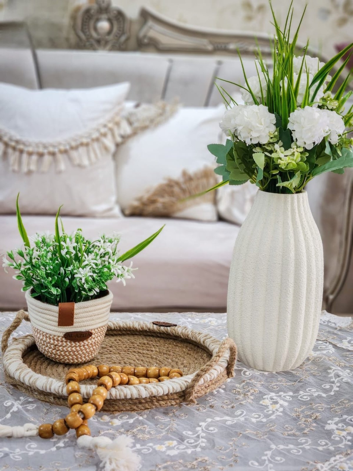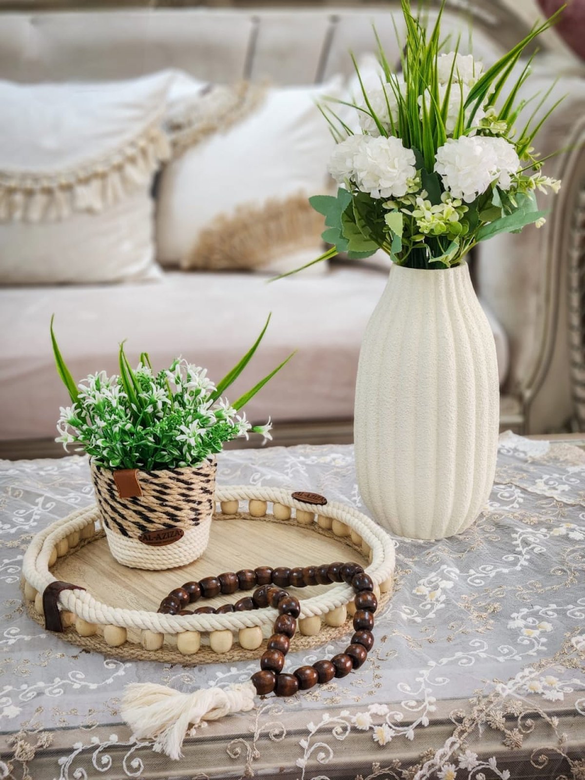 سبحة عصرية بتصميم ترندي يجمع بين الأصالة واللمسة الحديثة، مصنوعة من خرز خشبي أنيق ومربوطة بحبل قطني سميك لإطلالة مميزة. مثالية للاستخدام الشخصي أو كإكسسوار ديكوري يضيف لمسة روحانية وأناقة فريدة لطاولات القهوة أو الهدايا الرمضانية والمناسبات الدينية.