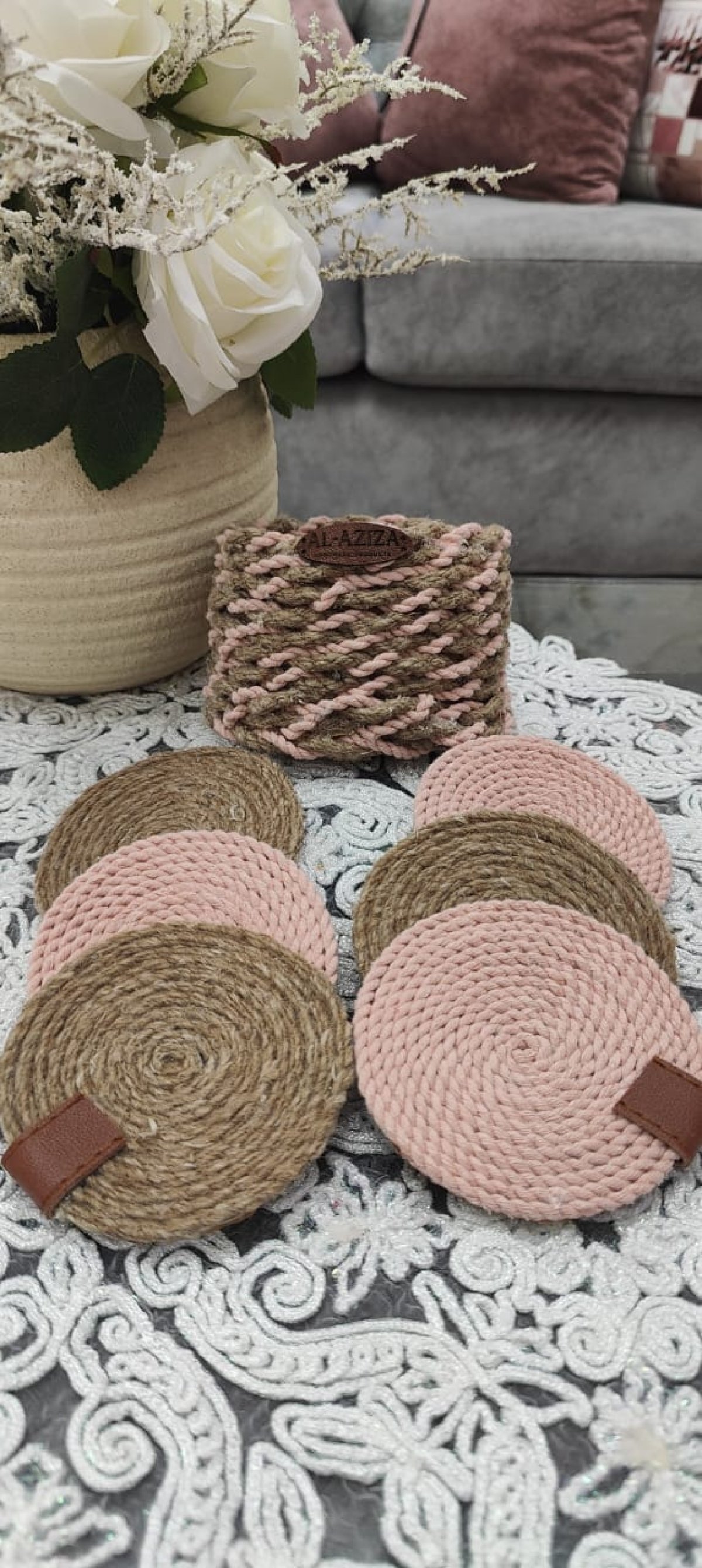 طقم فاخر من 6 كوسترات مصنوعة يدويًا من خامات طبيعية وعالية الجودة، تأتي مع حامل أنيق للحفاظ على ترتيبها وسهولة استخدامها. التصميم يجمع بين العملية والجمال، لحماية الأسطح من الحرارة والرطوبة مع لمسة ديكورية رائعة. مثالي للمنازل، المكاتب أو كهدية مميزة لمحبي التفاصيل اليدوية.
