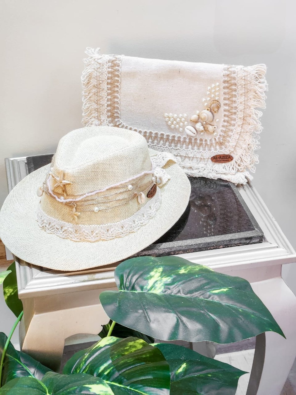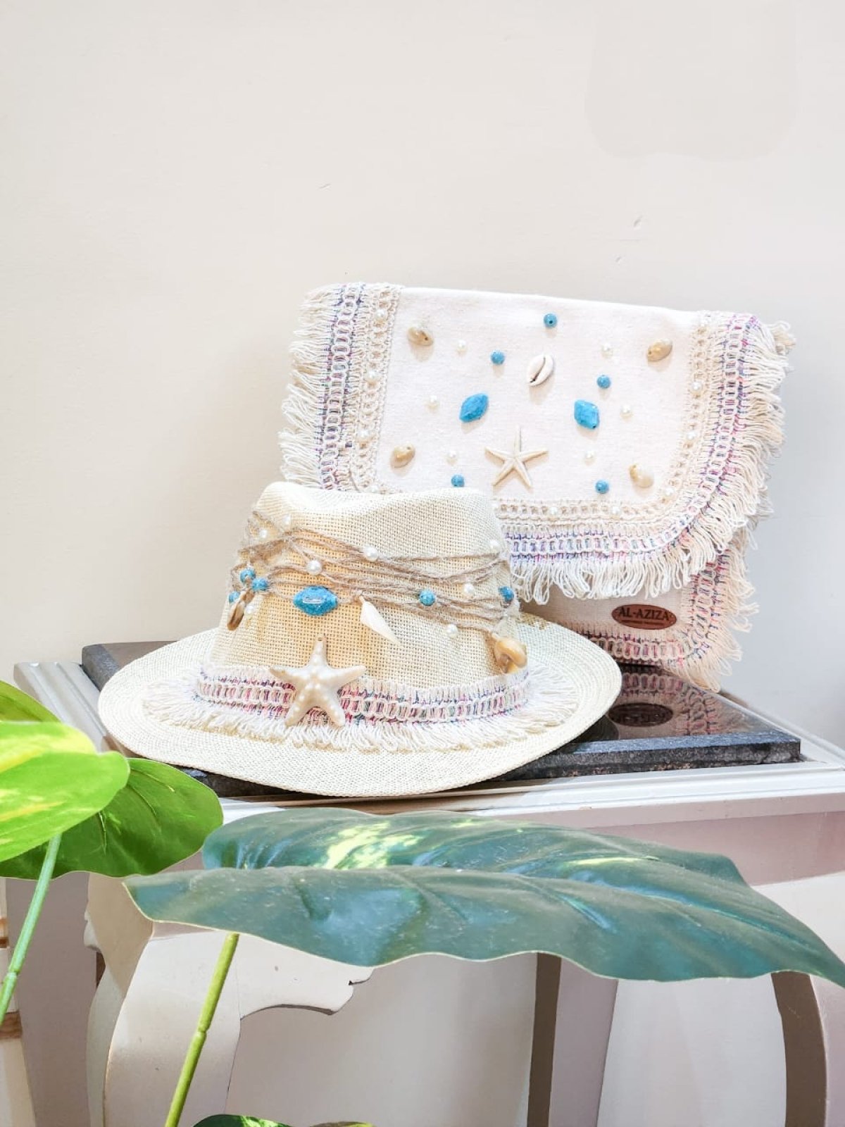 استعدي لأناقة صيفية لا تُقاوم مع هذا الطقم اليدوي المميز الذي يضم قبعة أنيقة وحقيبة كتف بتطريزات وتفاصيل مستوحاة من البحر مثل الأصداف، النجوم البحرية، والخرز الملون. مصنوعة بعناية من خامات طبيعية لتعكس الذوق الرفيع وروح الصيف. مثالية للرحلات، الشاطئ، أو كهدية أنيقة وفريدة لمحبي الستايل البوهيمي واللمسات اليدوية.