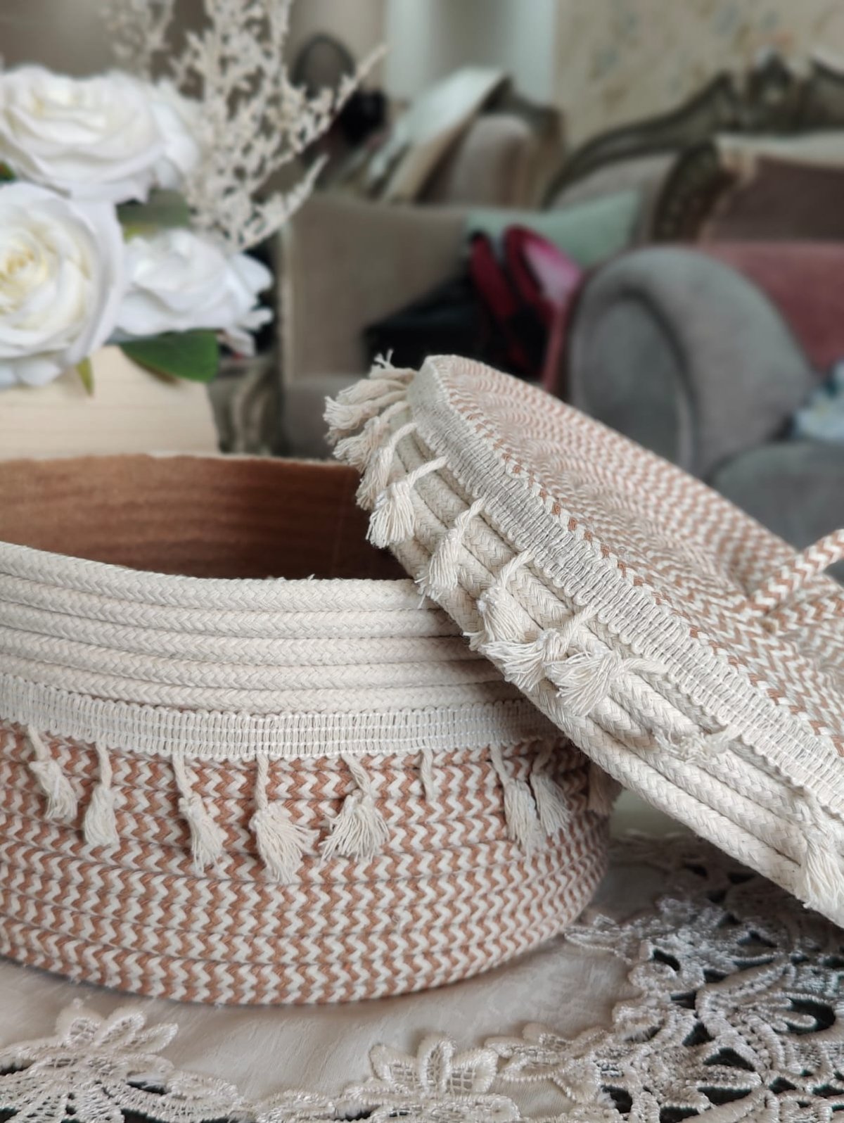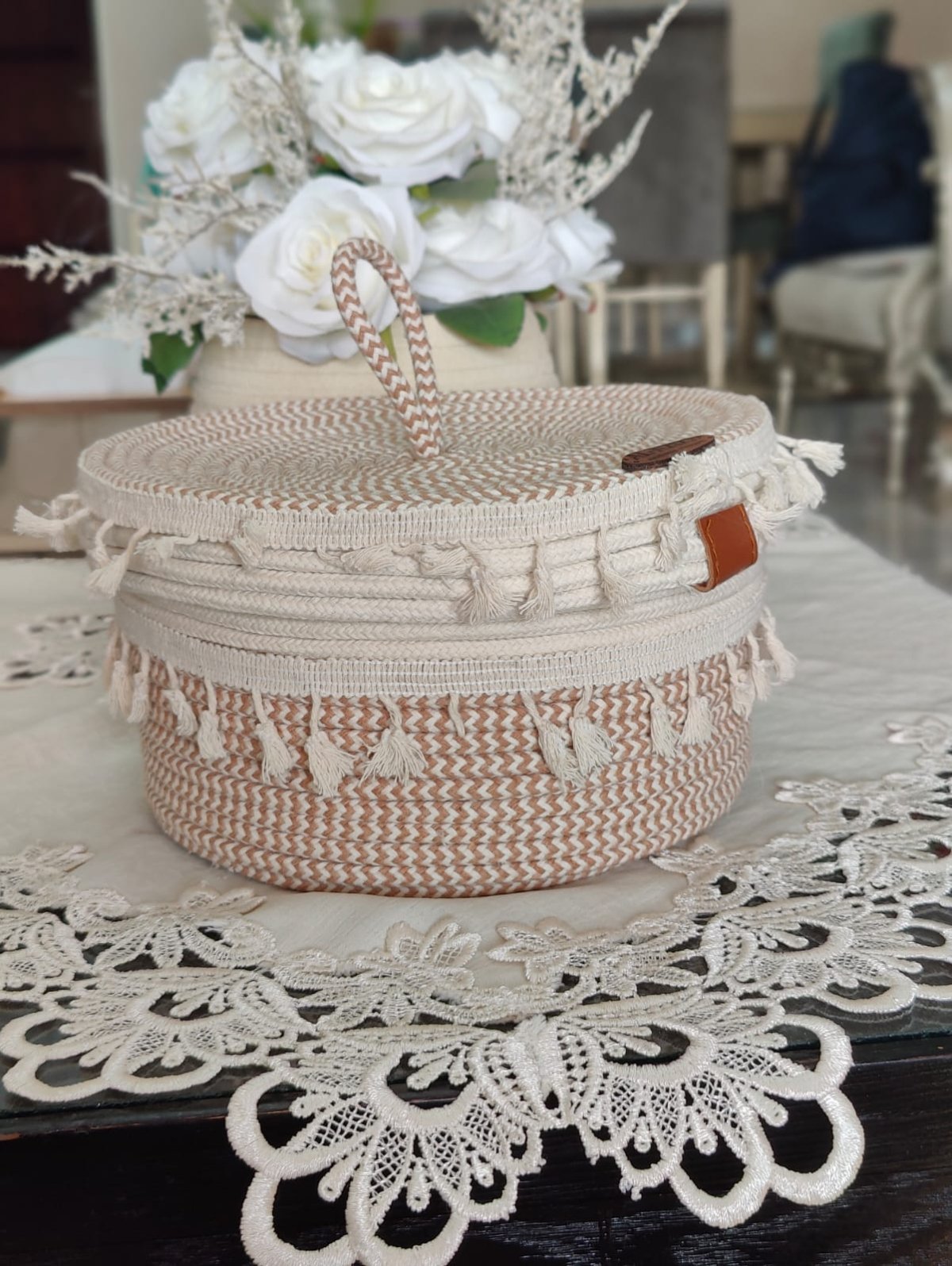منظّم عملي وأنيق مزوّد بغطاء يحافظ على محتوياتك نظيفة ومرتبة. مصنوع يدويًا من خامات متينة وطبيعية، ومثالي لتنظيم أدوات التجميل، الإكسسوارات، الملابس الداخلية، أدوات الخياطة، أو حتى المستلزمات المكتبية. تصميمه البسيط والأنيق يجعله مناسبًا لأي مساحة سواء في غرفة النوم أو الحمام أو المكتب. قابل للحمل وسهل التخزين، ليمنحكِ ترتيبًا مثاليًا بلمسة ديكور راقية.