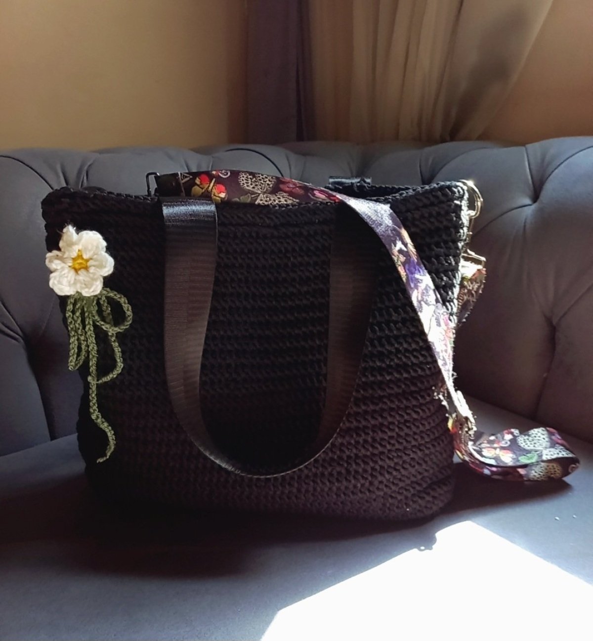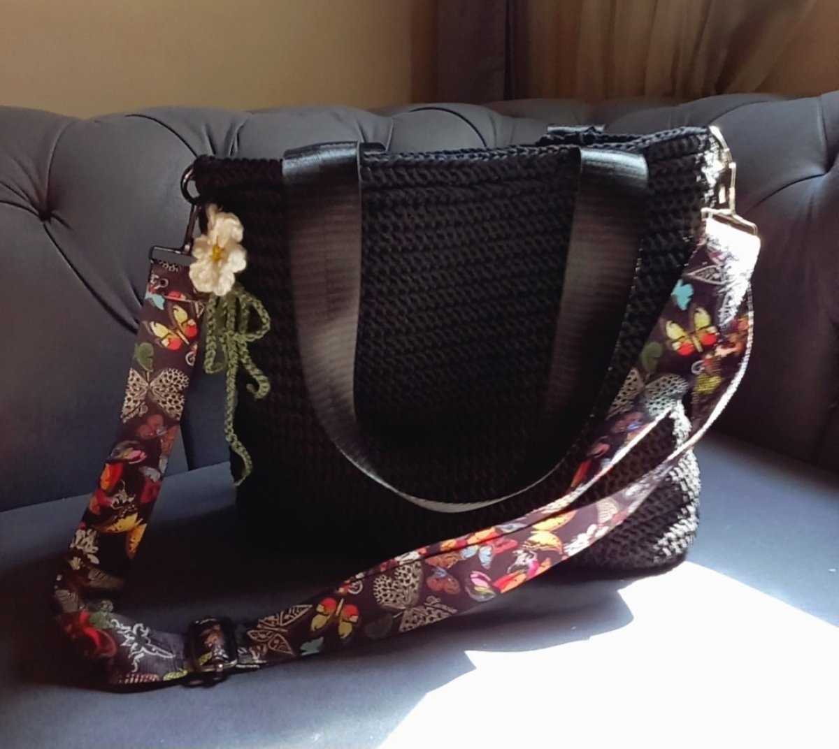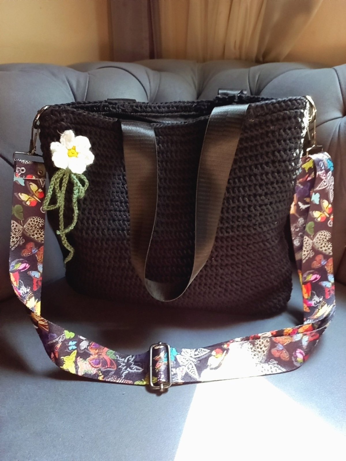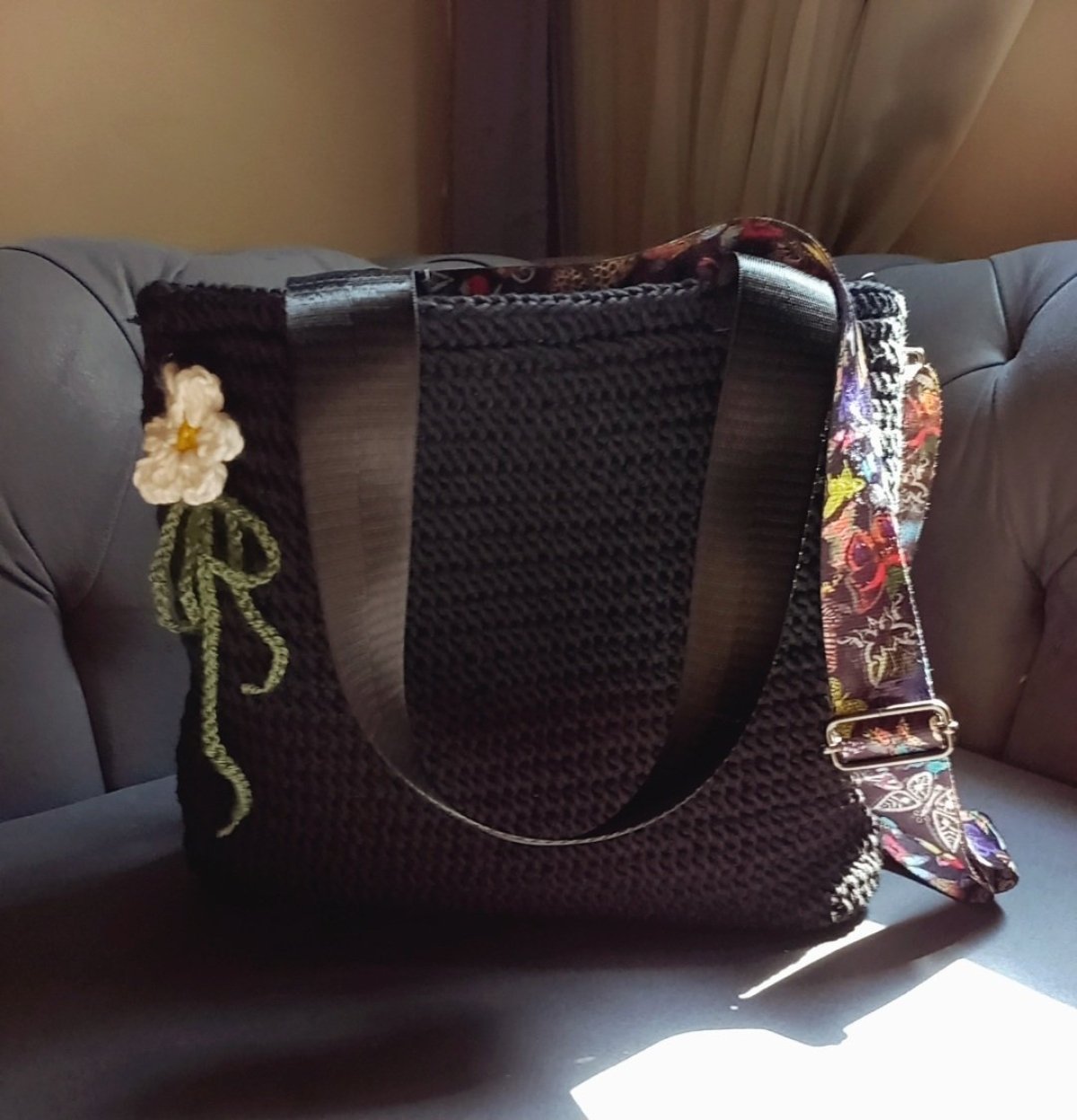 شنطة كروشية كلاسيك ٣٥ × ٣٥ سم بطانة سوداء + سوستة سوداء وردة اكسسوار ومتاح التغيير يد ملونة اضافية