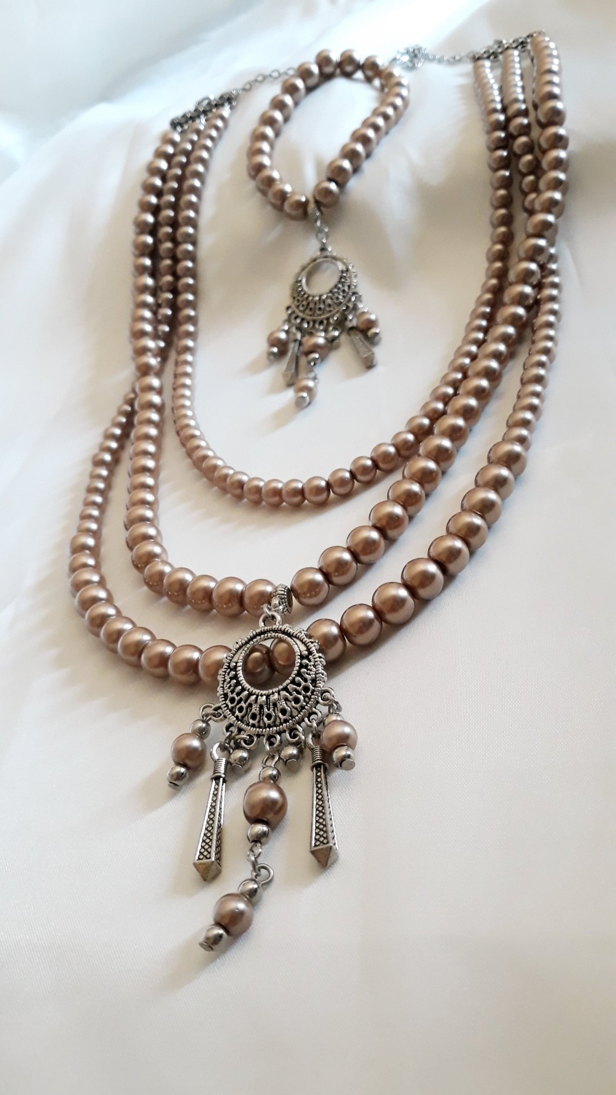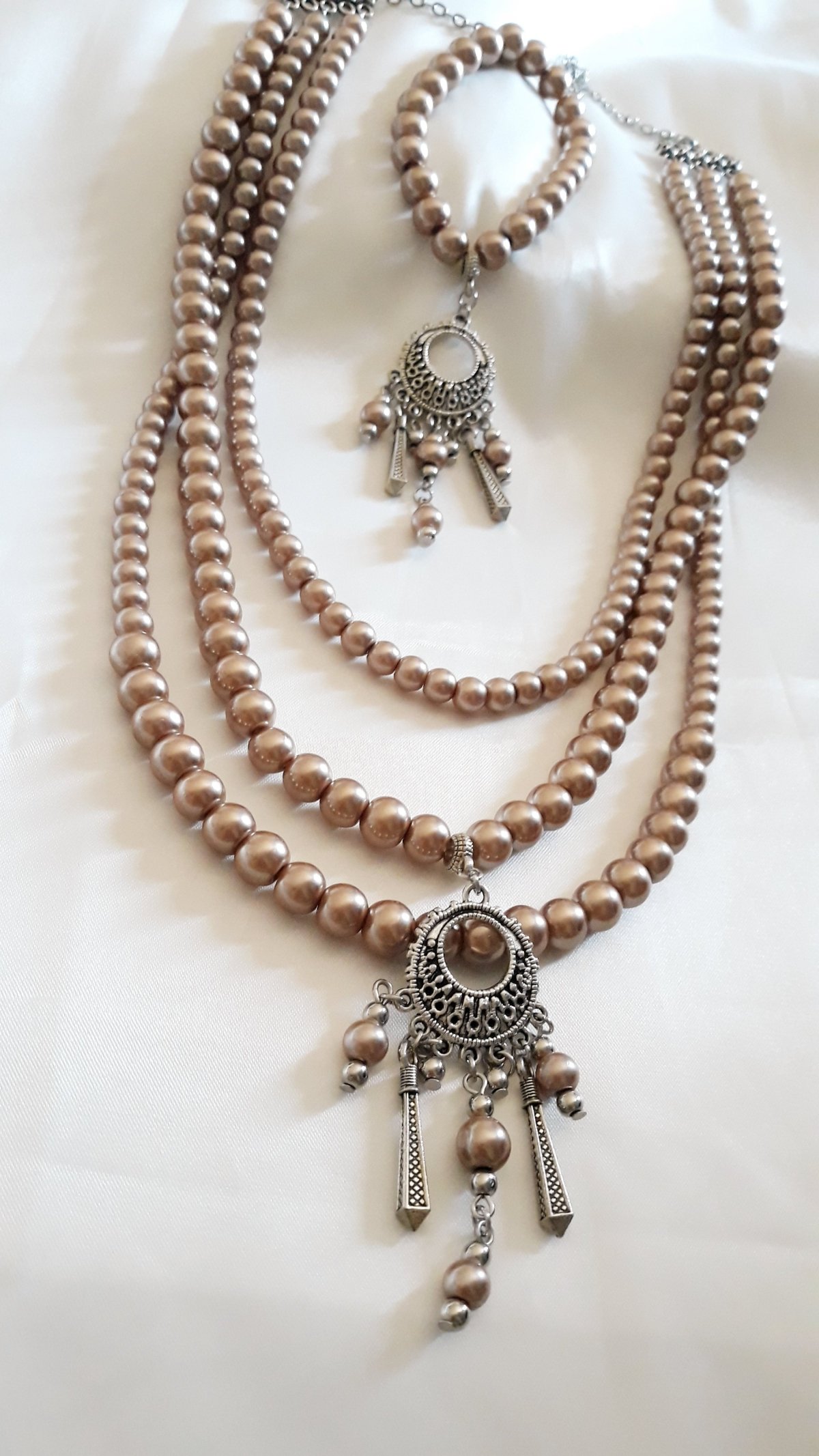 عقد لولى من اللولى الازاز مع اسورة رقيقة من تفاصيله بفواصل ودلايات فضية عقد من 3 ادوار لامكانية لبسه كوليه على الرقبة متاح بدرجات مختلفة