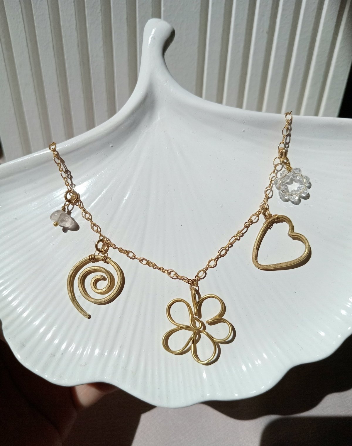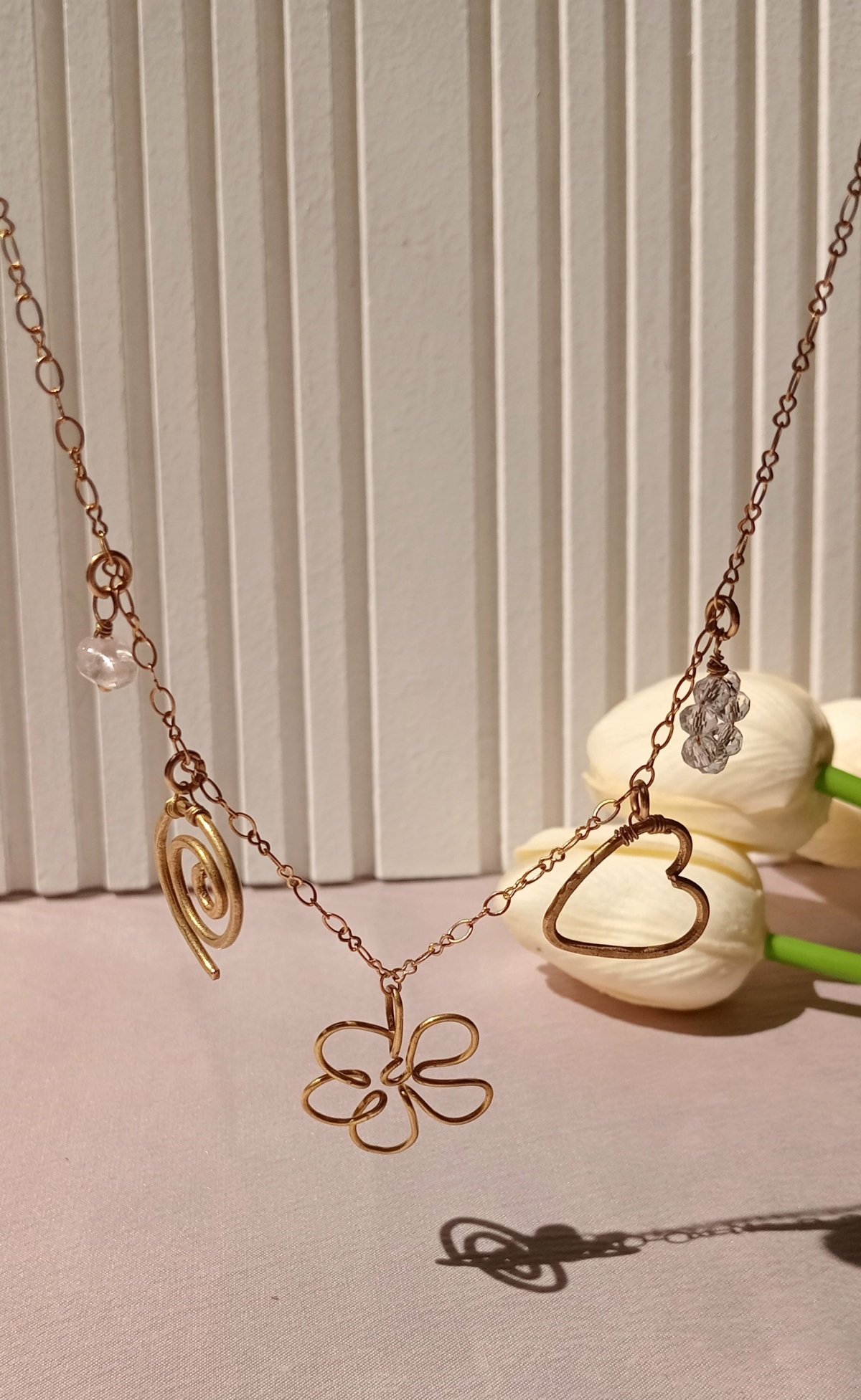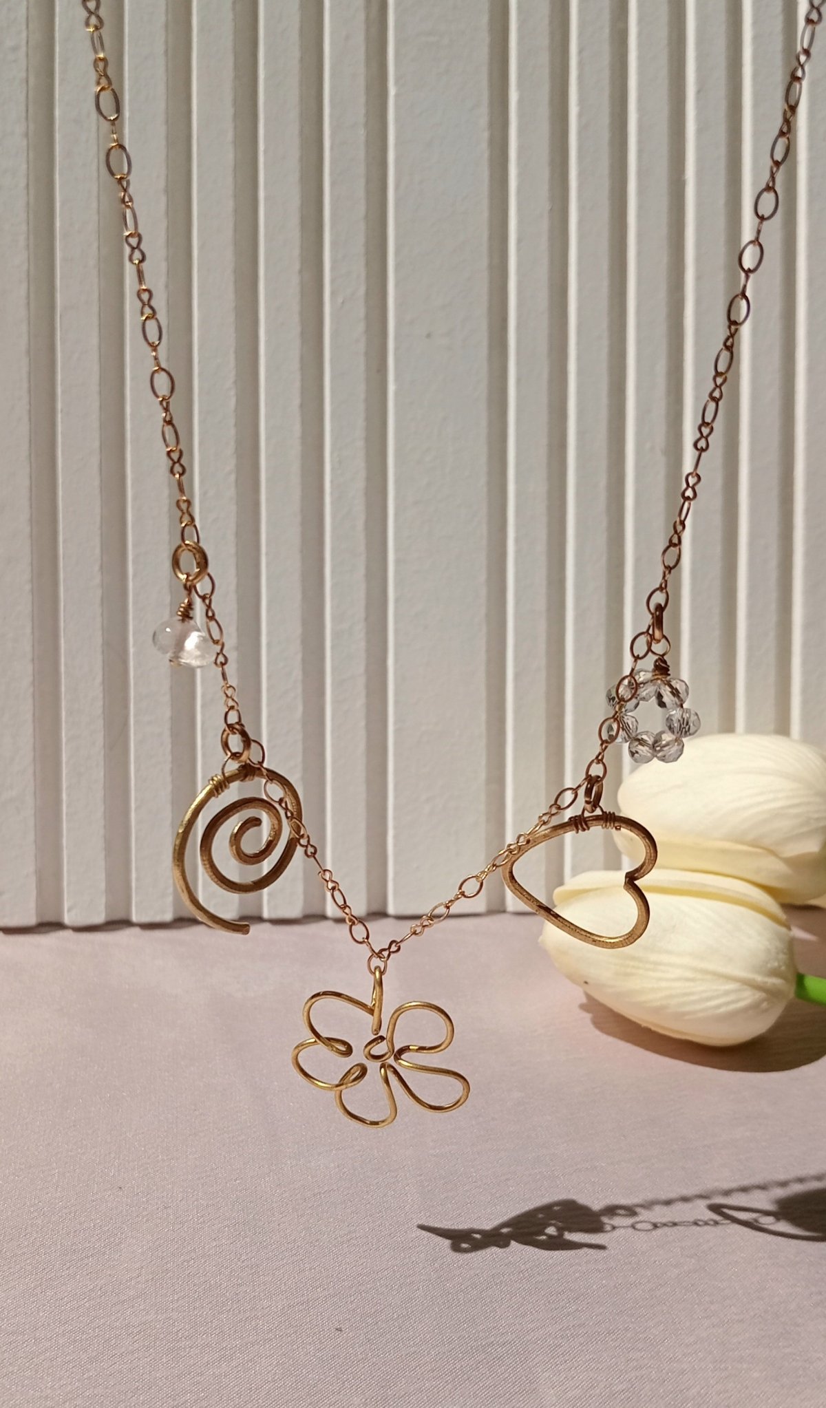 سلسلة نحاس هاند ميد فيها خمس دلايات مميزة :قلب، وردة، حلزون، خرزة شفافة، مصنوعة من خامات عالية الجودة والنحاس مش بيصدي. متوفرة بطولين: 50 سم و55 سم.