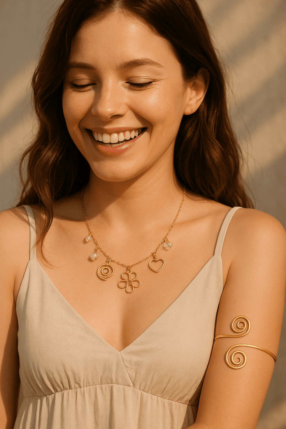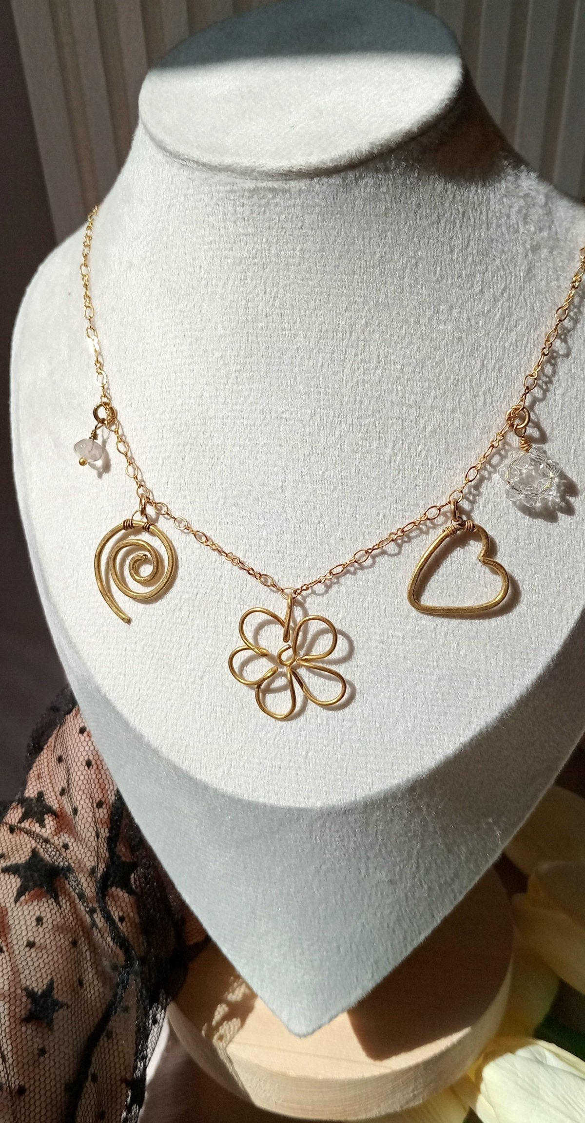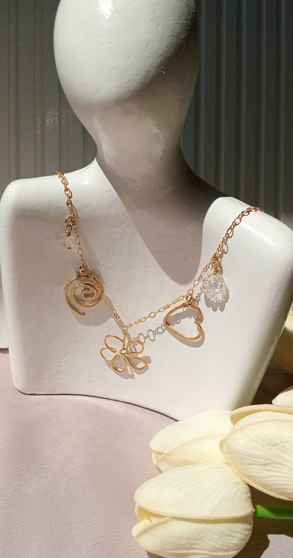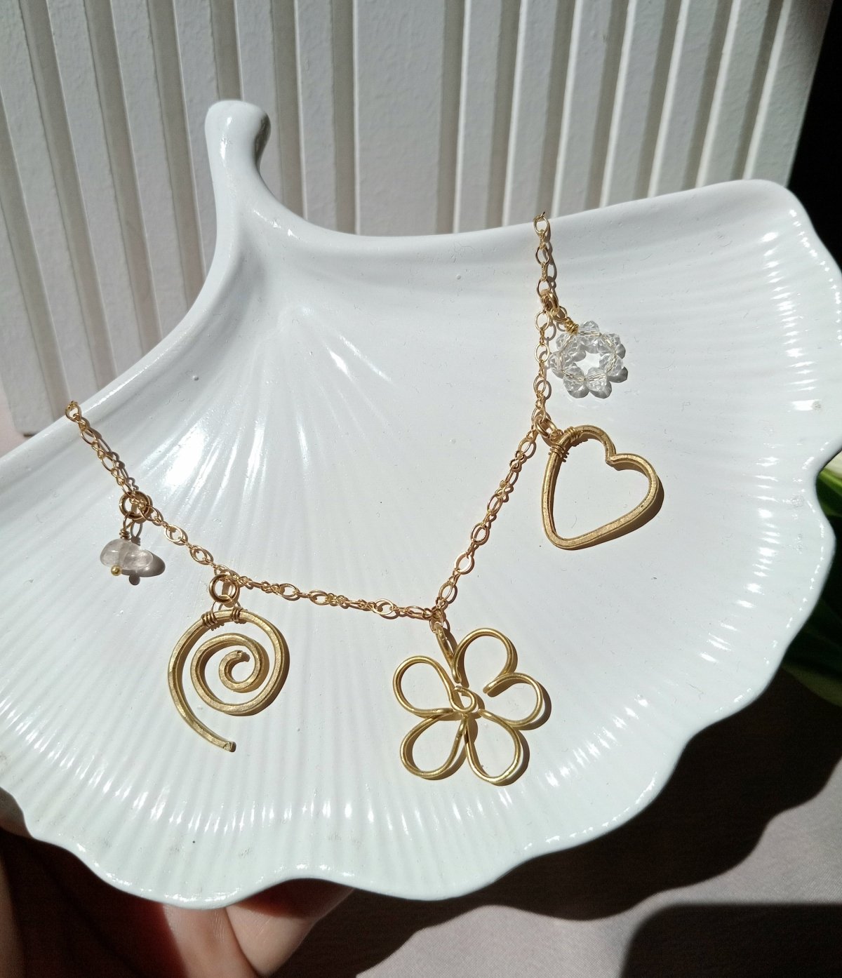 سلسلة نحاس هاند ميد فيها خمس دلايات مميزة :قلب، وردة، حلزون، خرزة شفافة، مصنوعة من خامات عالية الجودة والنحاس مش بيصدي. متوفرة بطولين: 50 سم و55 سم.