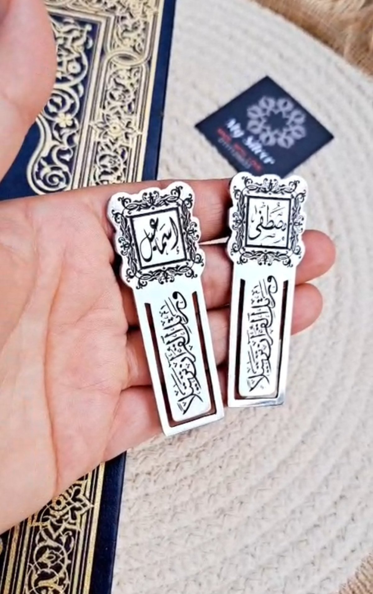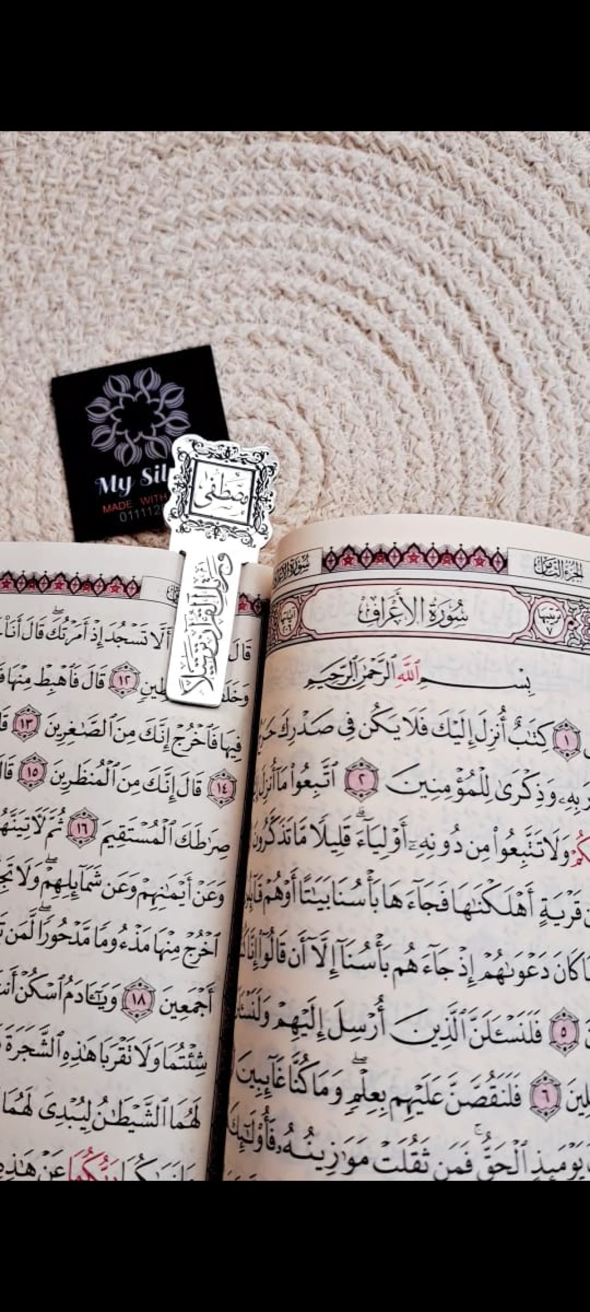 فاصل للمصحف او للكتاب مصنوع من الفضة عيار ٩٢٥شغل يدوي رائع و ثقيل الوزن يصلح كهدية قيمة جدااا و مميزة للاشخاص المهمه يمكنك طلب اي إسم و أي ٱية او جملة