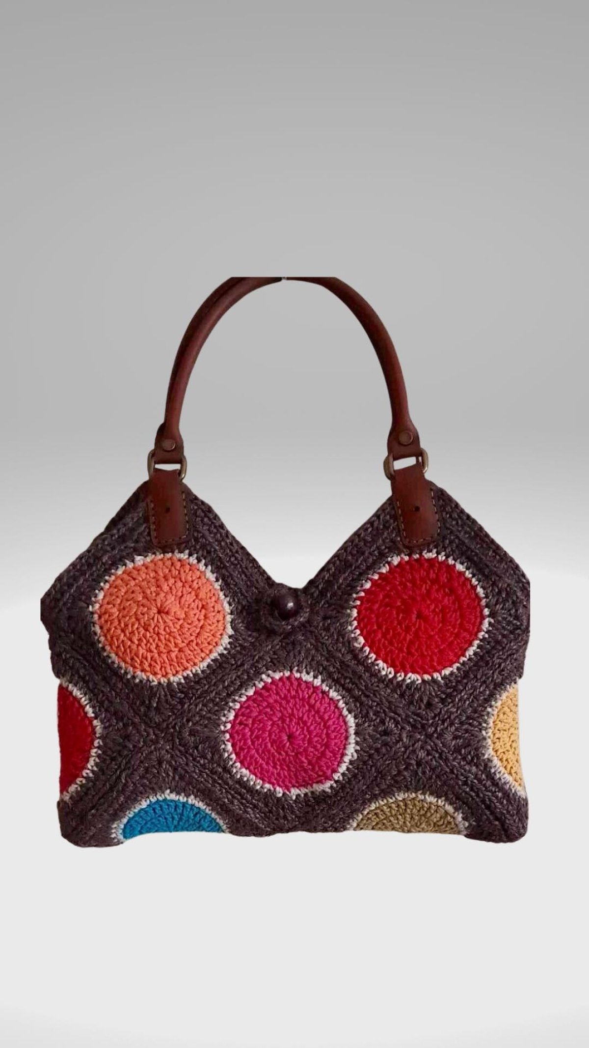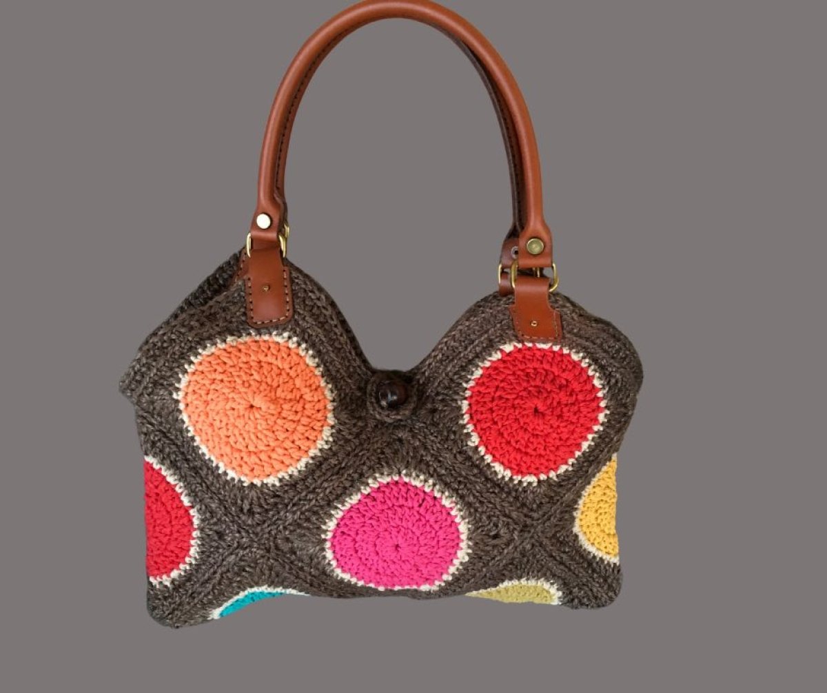 , شنطه كروشيه يدويه الصنع, مشغوله من خيط خيش بني و دوائر ملونه . ايدي الشنطه من الجلد الطبيعي مقاسات الشنطه 25 سم x 20 سم