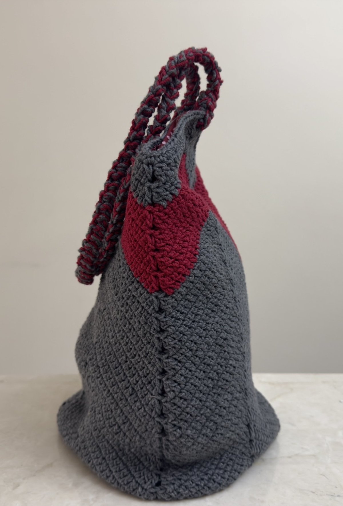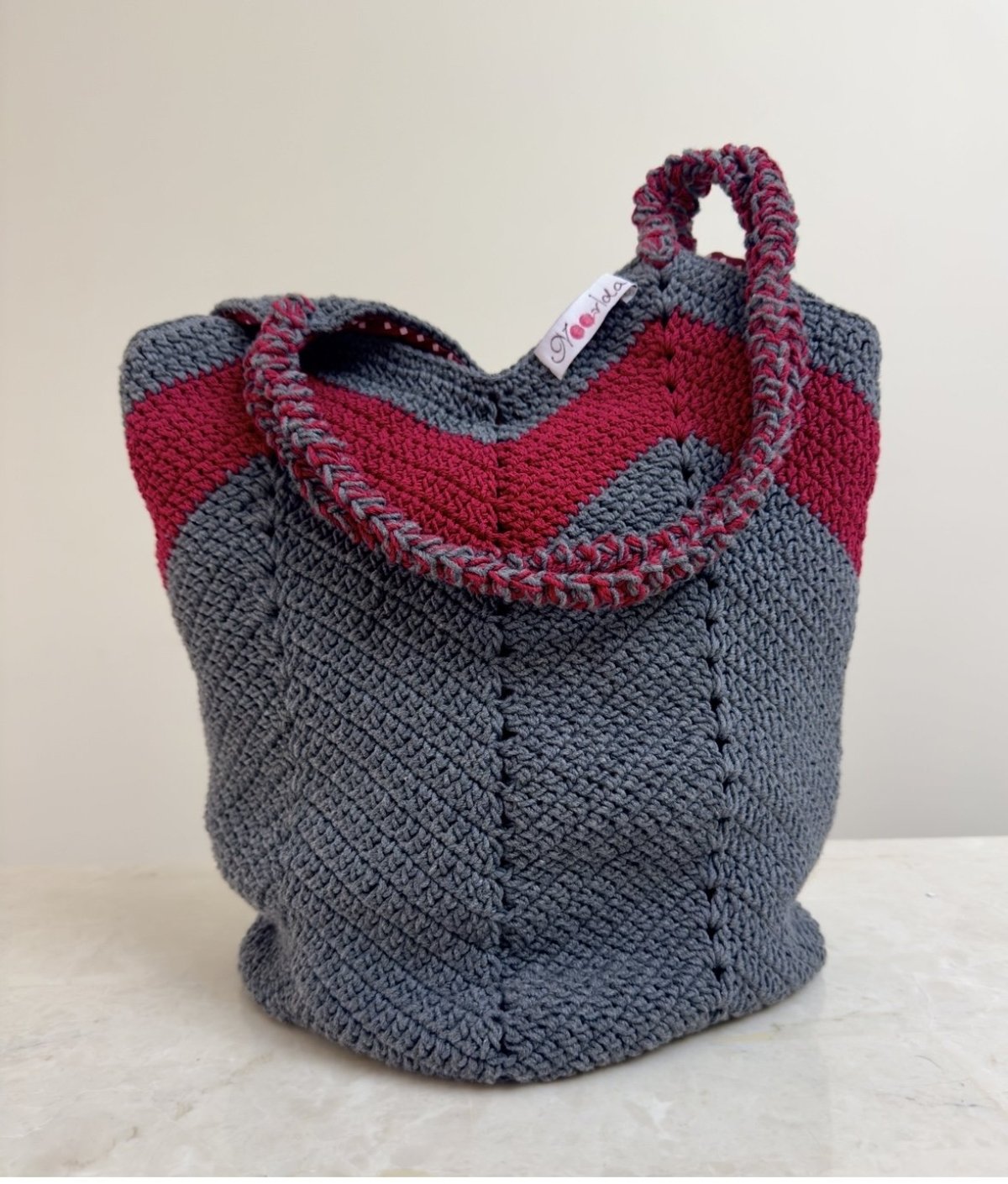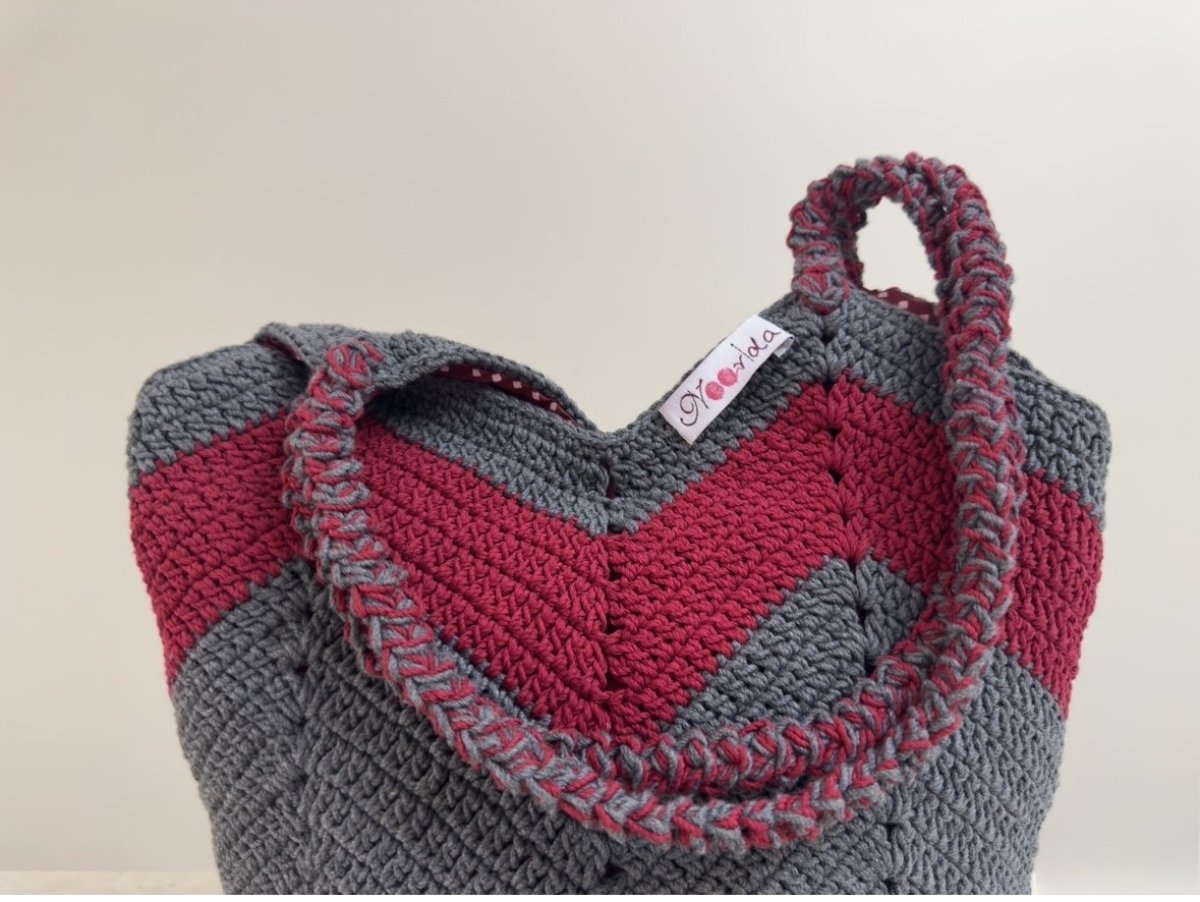 شنطة عصرية مصنوعة بخيوط قطن مصرية حجمها مناسب للنادي والشاطئ لان قاعدتها مربعة متاحة باللون الرمادي الغامق مع الأحمر متوفرة فوري المقاس : ٣٤ سم في ٣٢ سم