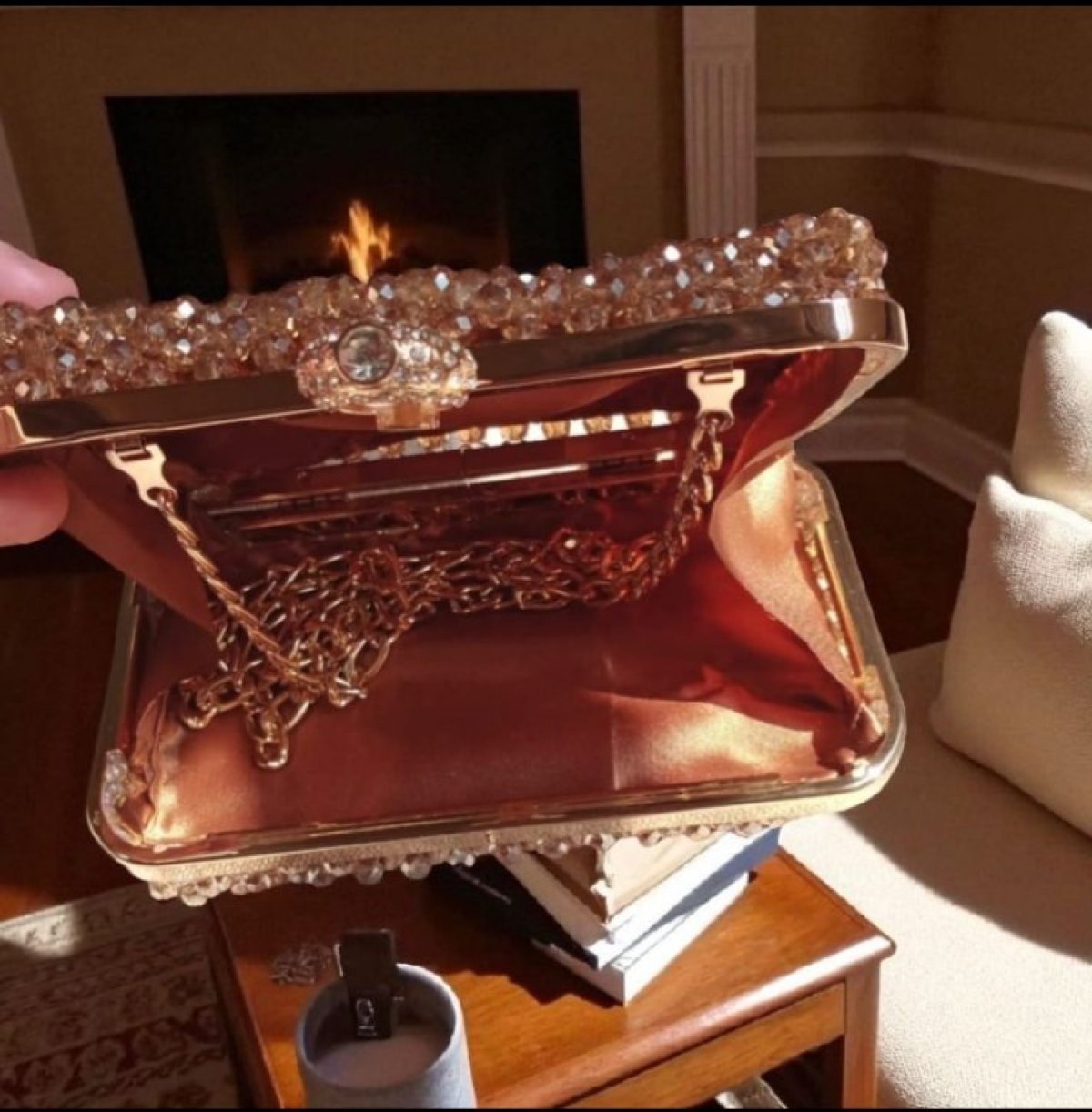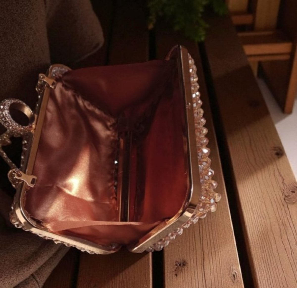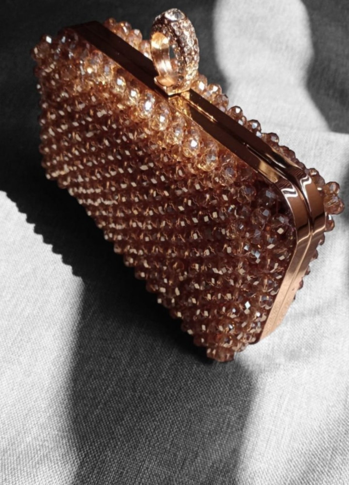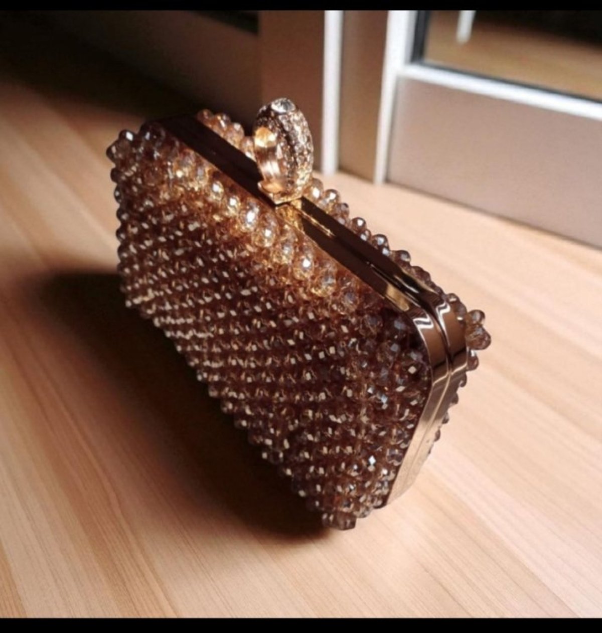 شنطه سواريه صنعت يدويا من خرز الازاز المستورد والفريم المعدن الدهبي لها بطانه داخليه ومذوده بدراع كروس مقاس ٢٠/15