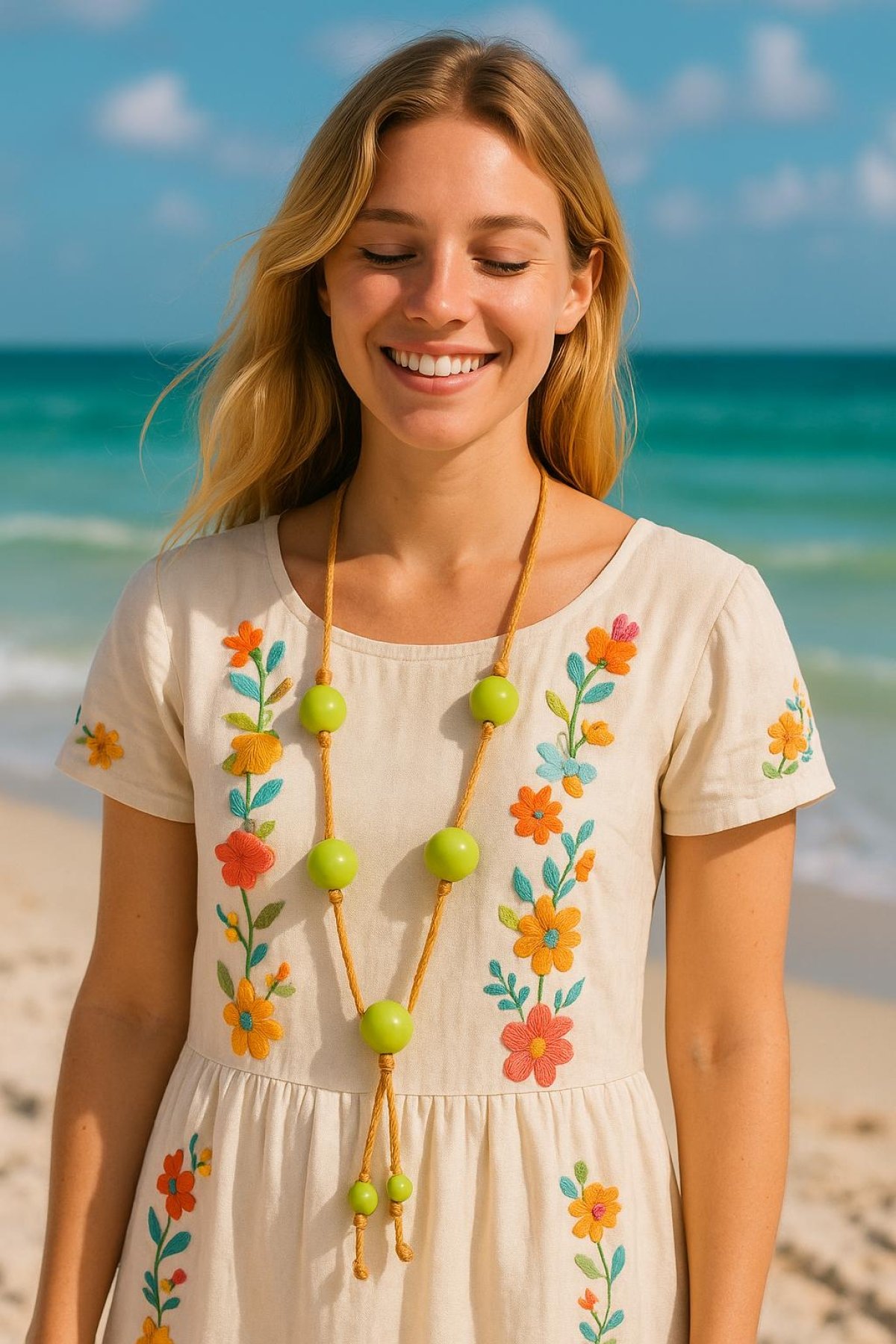 Handmade long necklace with large and small round beads on natural jute cord. Available in three vibrant colours: purple, green, and red. A fun and versatile accessory for summer days. Wear it solo or mix and match different colours to create your own unique set.
