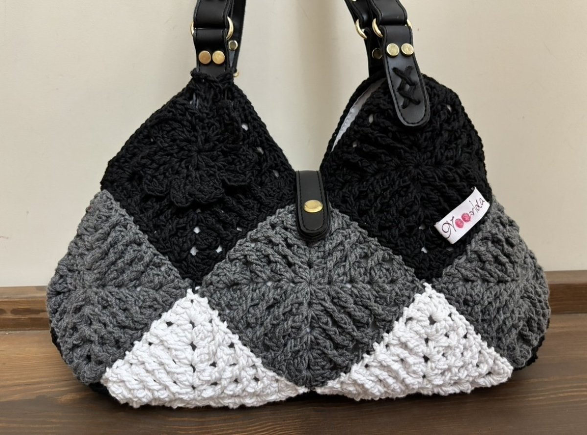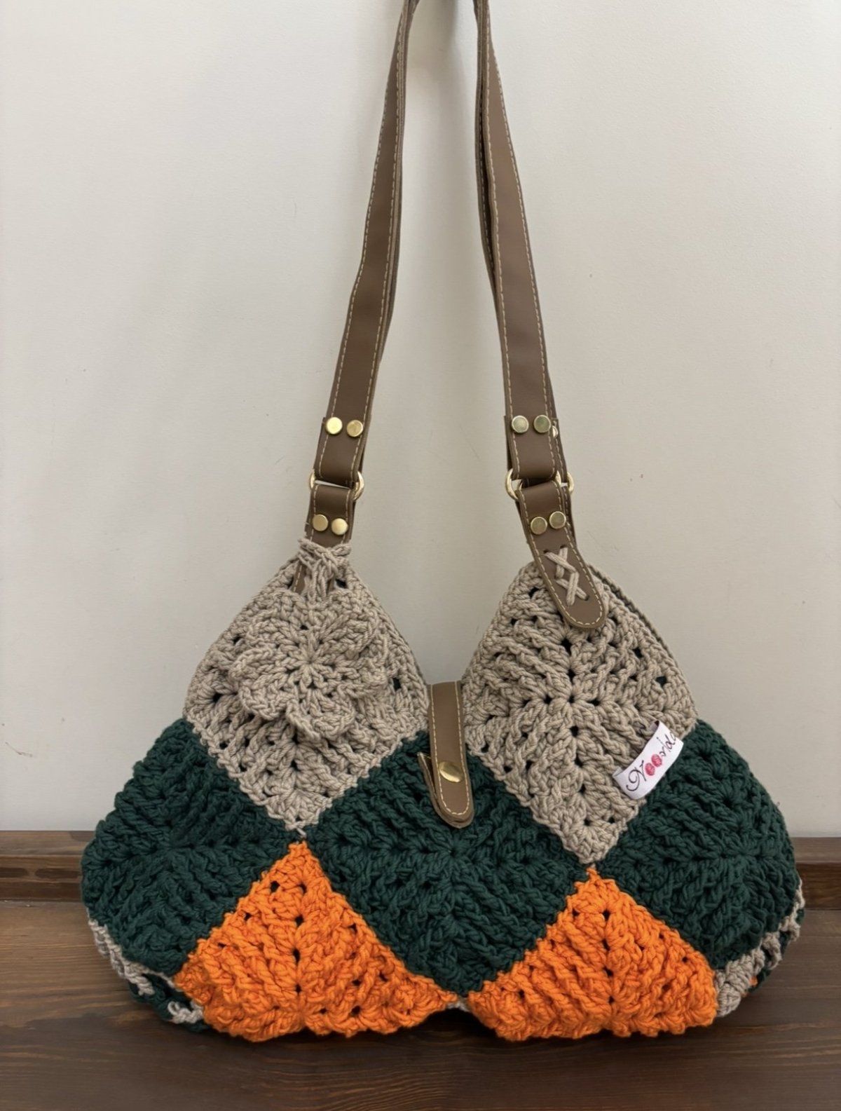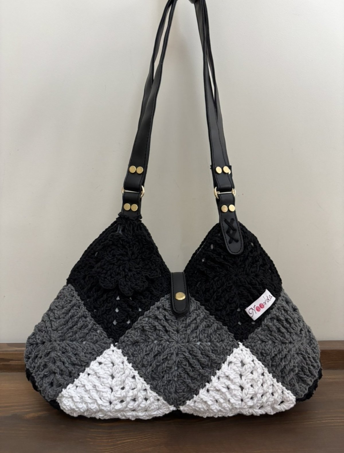 شنطة بمربعات جراني مصنوعة بخيط قطن مصري حجم كبير مناسب لجميع أغراضك مع لسان ويد جلد لإعطاء الشنطة شكل شيك متوفرة بدرجات الأبيض والأسود وبمزيج لون بيج وزيتي وبرتقالي متوفرة فوري قطعة واحدة من كل لون