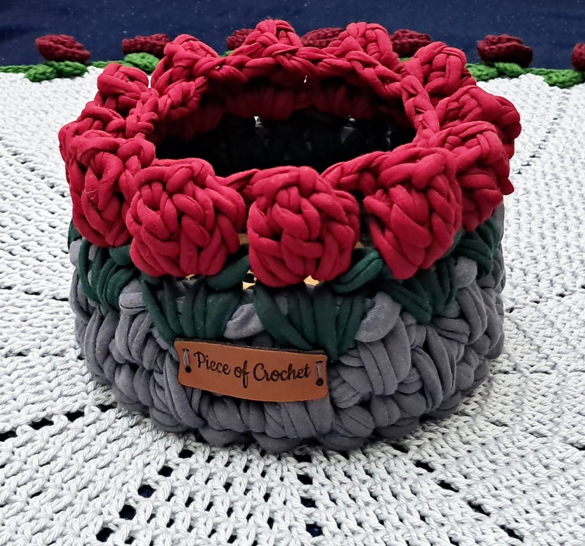 منظم بورد التيوليب مشغول بالوان مبهجة بخيط قطن . مقاس قطر قاعدة المنظم ١٥ سم . متاح عمل المنظم بمقاسات مختلفة وبالوان حسب الطلب سواء للمنظم او الورد .