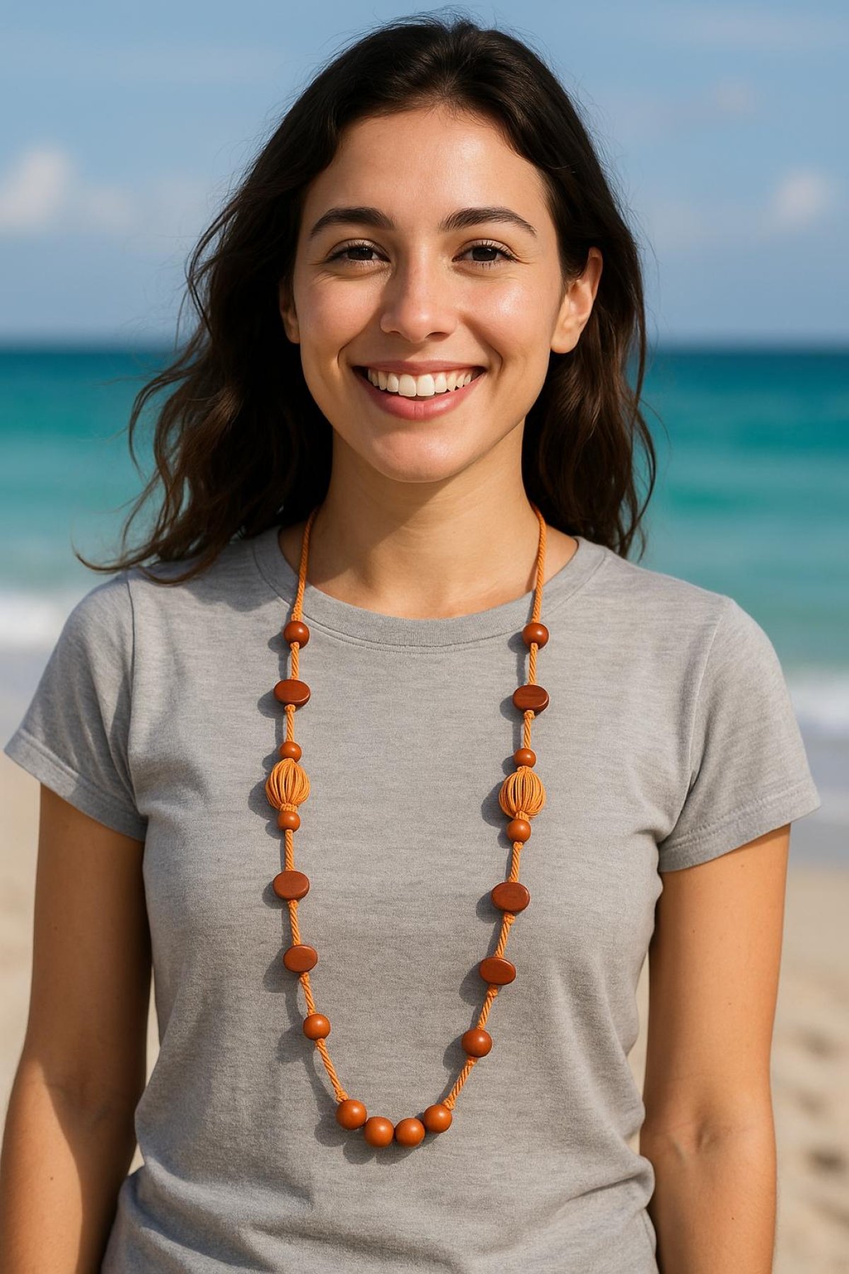 Handcrafted necklace featuring warm wooden beads, textured thread-wrapped spheres, and flat disc accents in rich earthy tones, strung on a vibrant orange cord for a bold yet natural beach-inspired look.