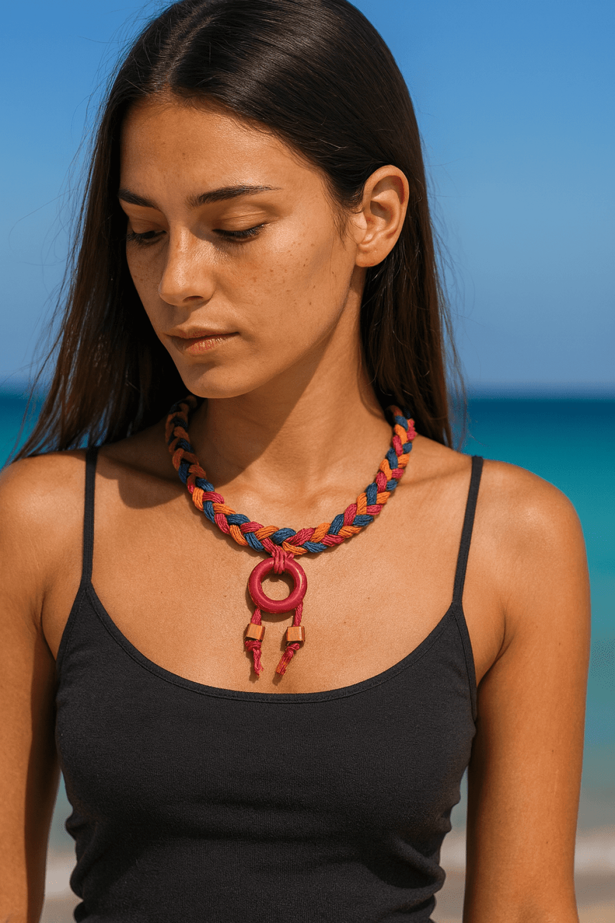 Handcrafted braided necklace in vibrant red, orange, and navy tones, featuring a central wooden ring and two wooden cube beads for a natural, artistic finish