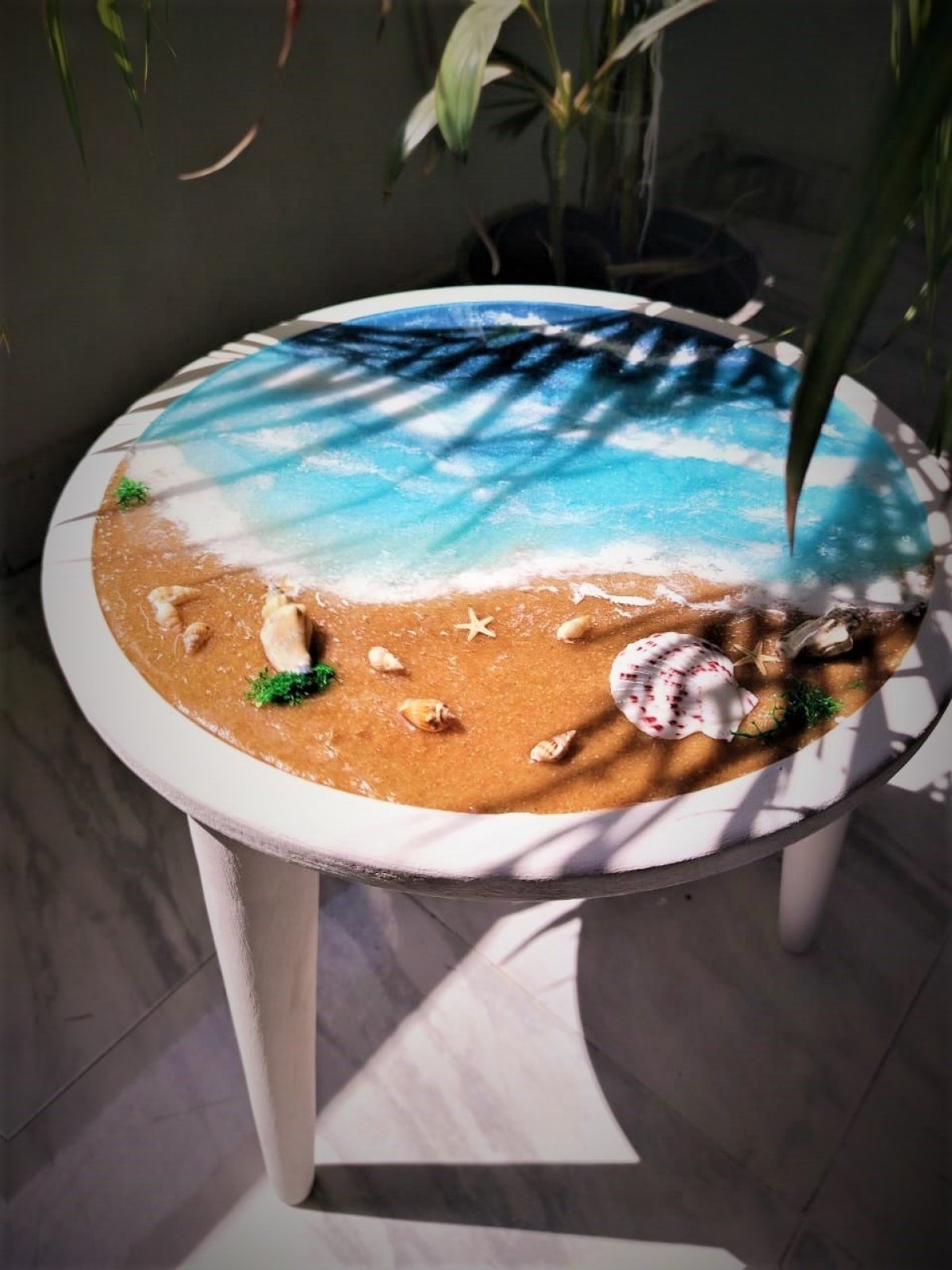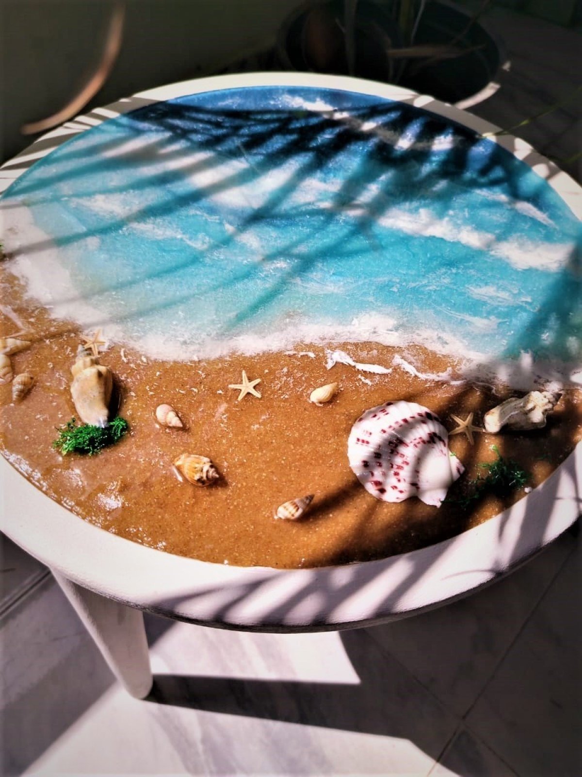 طاولة جانبية شكل البحر قطر 50سم ارتفاع 70 سم مطعمة بقواقع و نجوم بحرية طبيعية ارجل الطاولة مصنوعة من الخشب الطبيعي ومعزولة بطبقة حماية